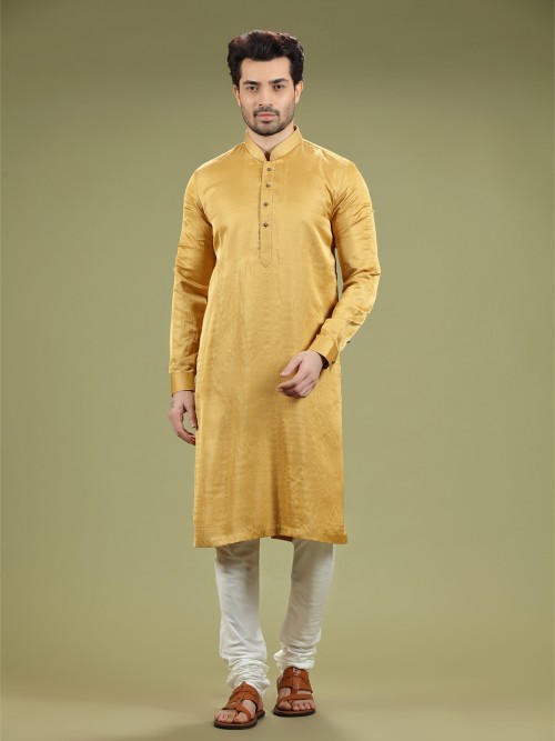 Blend Indian styles with this stylish mustard yellow plain silk kurta suit. Featuring a mandarin collar and full sleeves, its a perfect addition to your ethnic collection. Comes with a bottom.