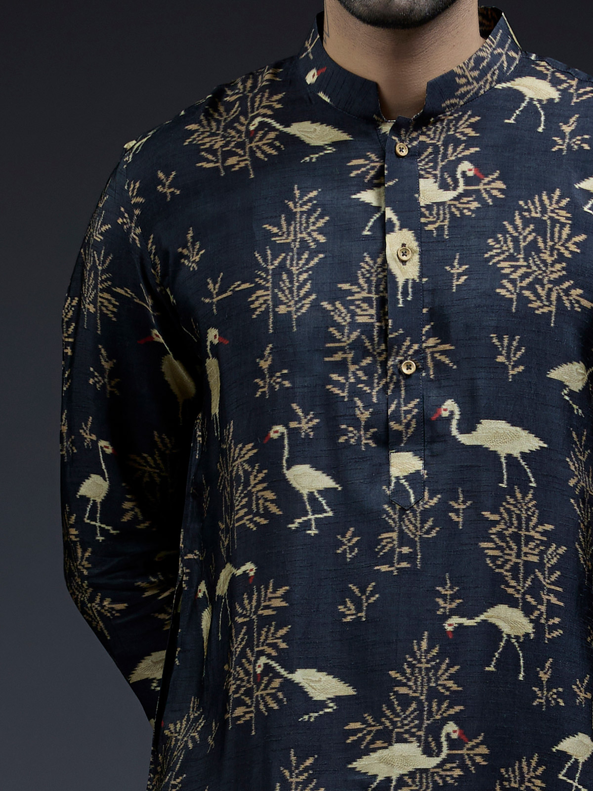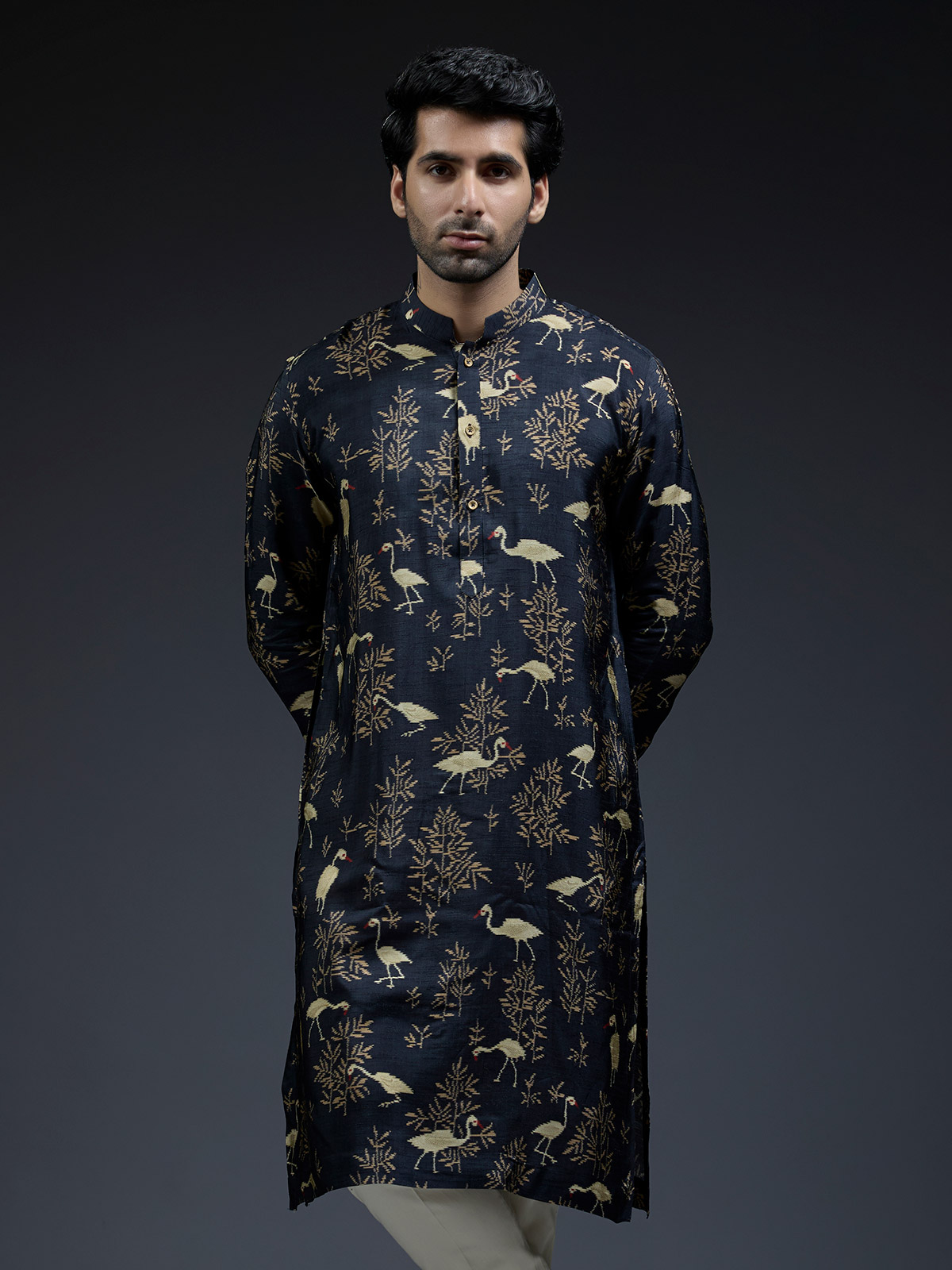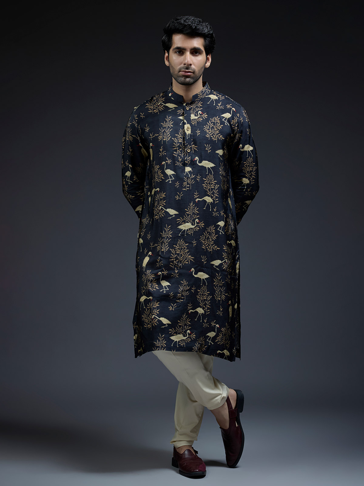 This blue kurta suit with a bird motif will make you look attractive and stylish. It is the ideal fusion of tradition and style, and it is made of silk cloth. It has long sleeves and a mandarin collar. Has a cream bottom.