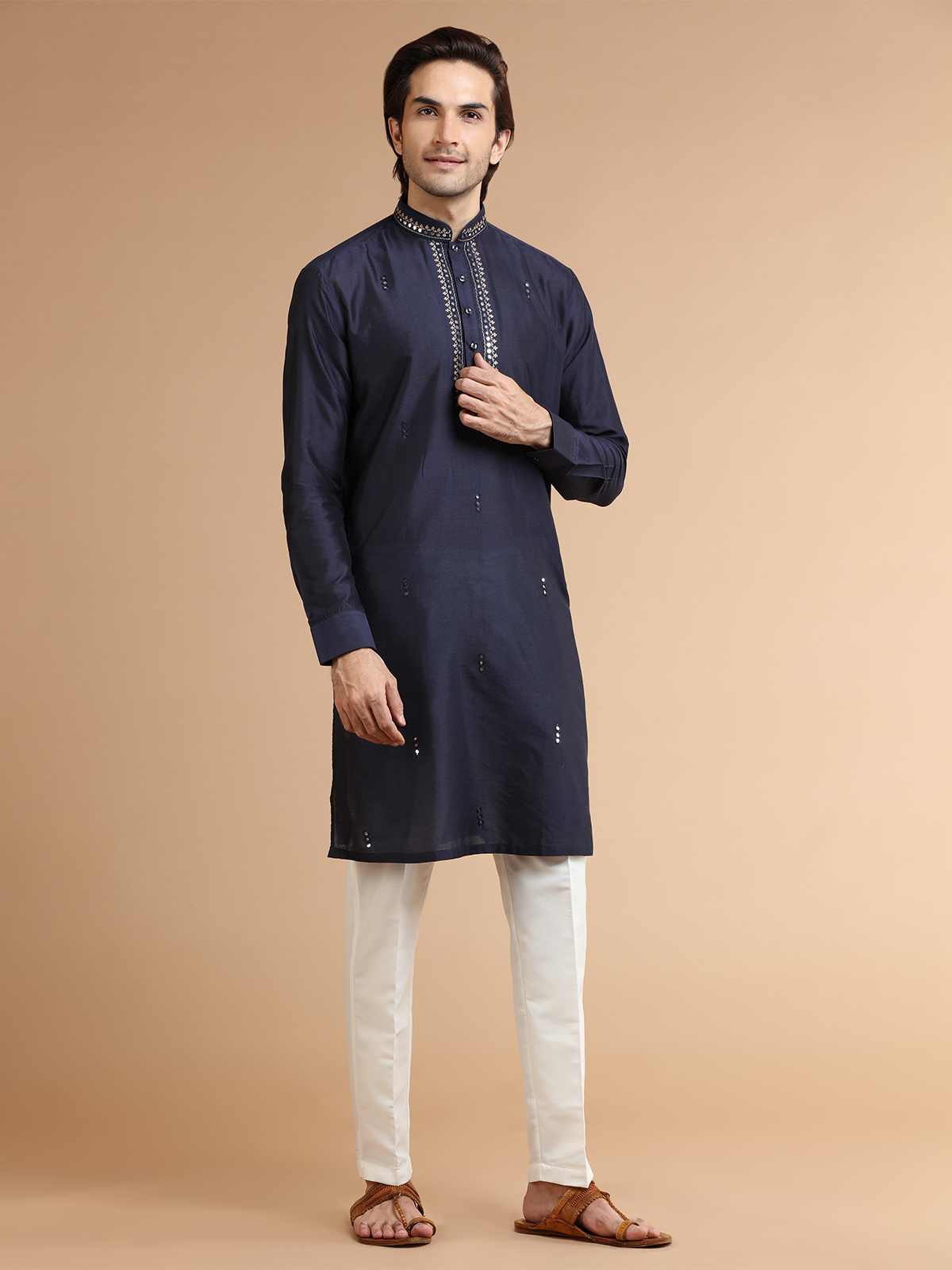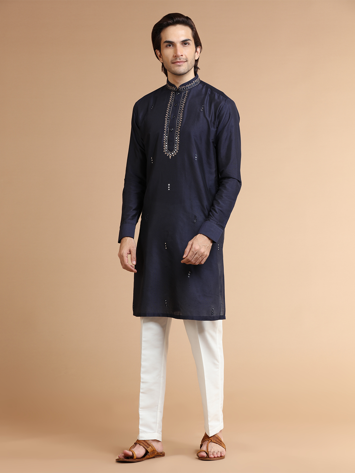 Add a touch of elegance to your festive wardrobe with this finely crafted navy silk kurta suit adorned with mirror and resham work. It features a mandarin collar, full sleeves, and comes with a bottom.