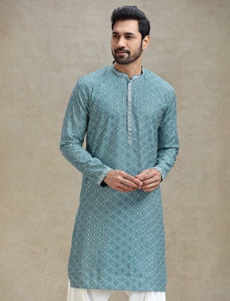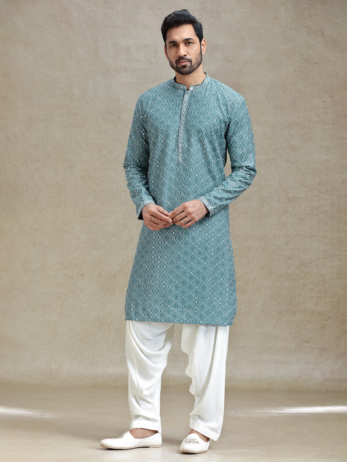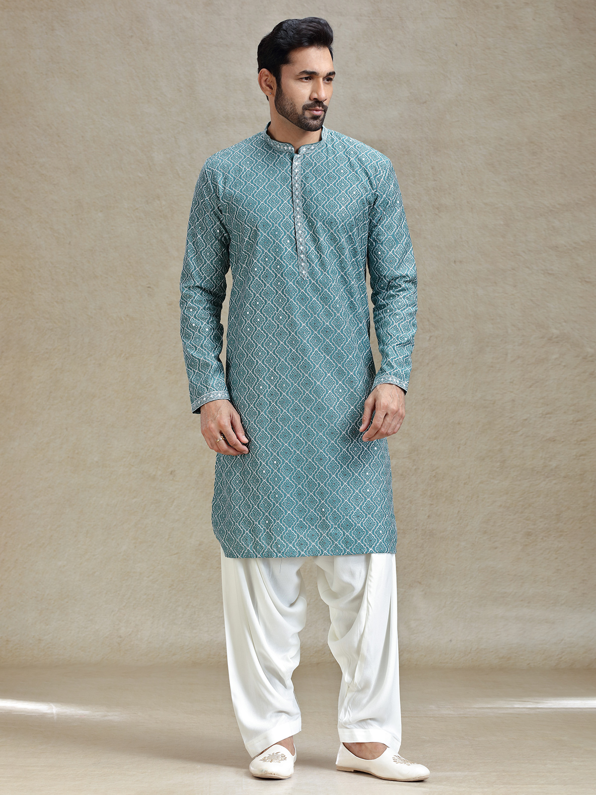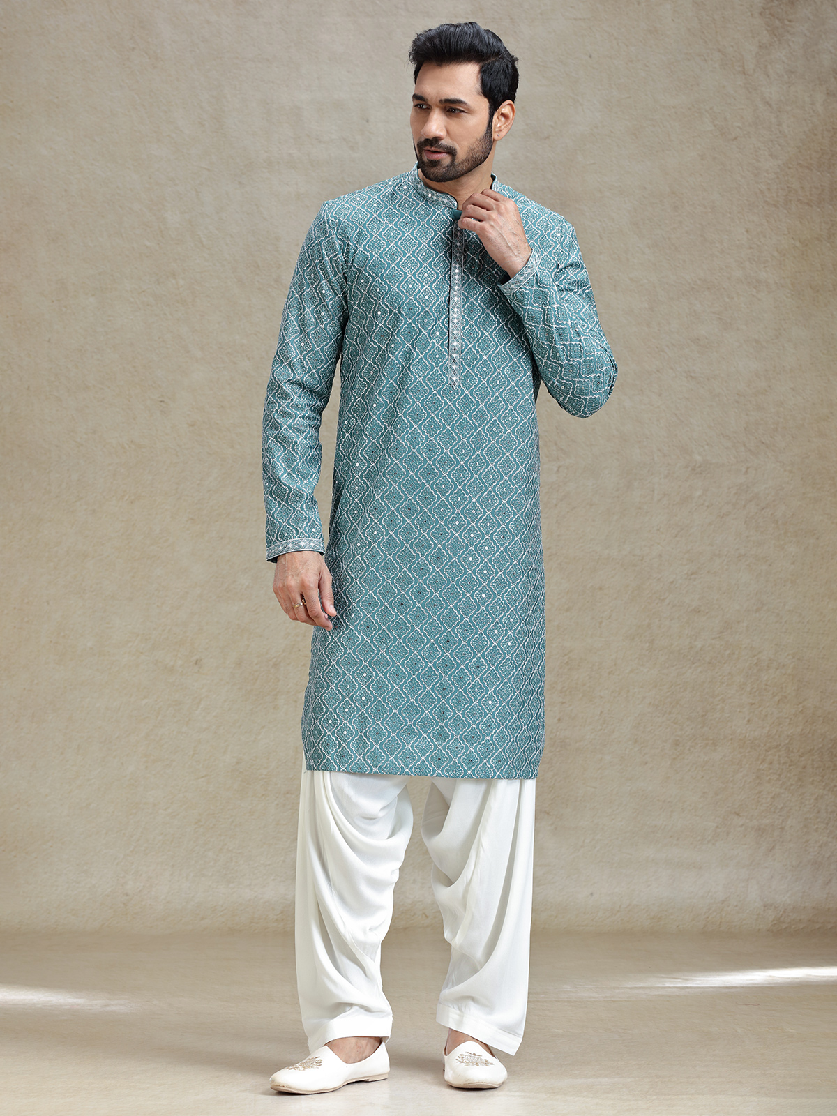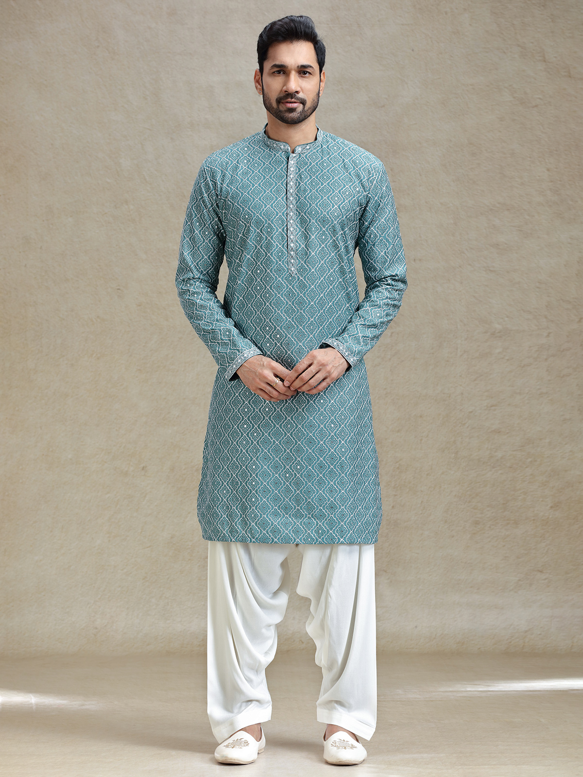 This English Green Kurta Salwar Suit, crafted from rich silk, seamlessly blends heritage with modern sophistication, ensuring you stand out at every occasion. The mandarin collar with a hook-eye placket, full sleeves with detailed cuffs, and elegant front buttons embellished with symmetrical embroidery work add a refined touch to the ensemble. Ideal for festive celebrations, family gatherings, or cultural events, this set comes complete with a coordinating bottom salwar, offering a perfect balance of style and grace.