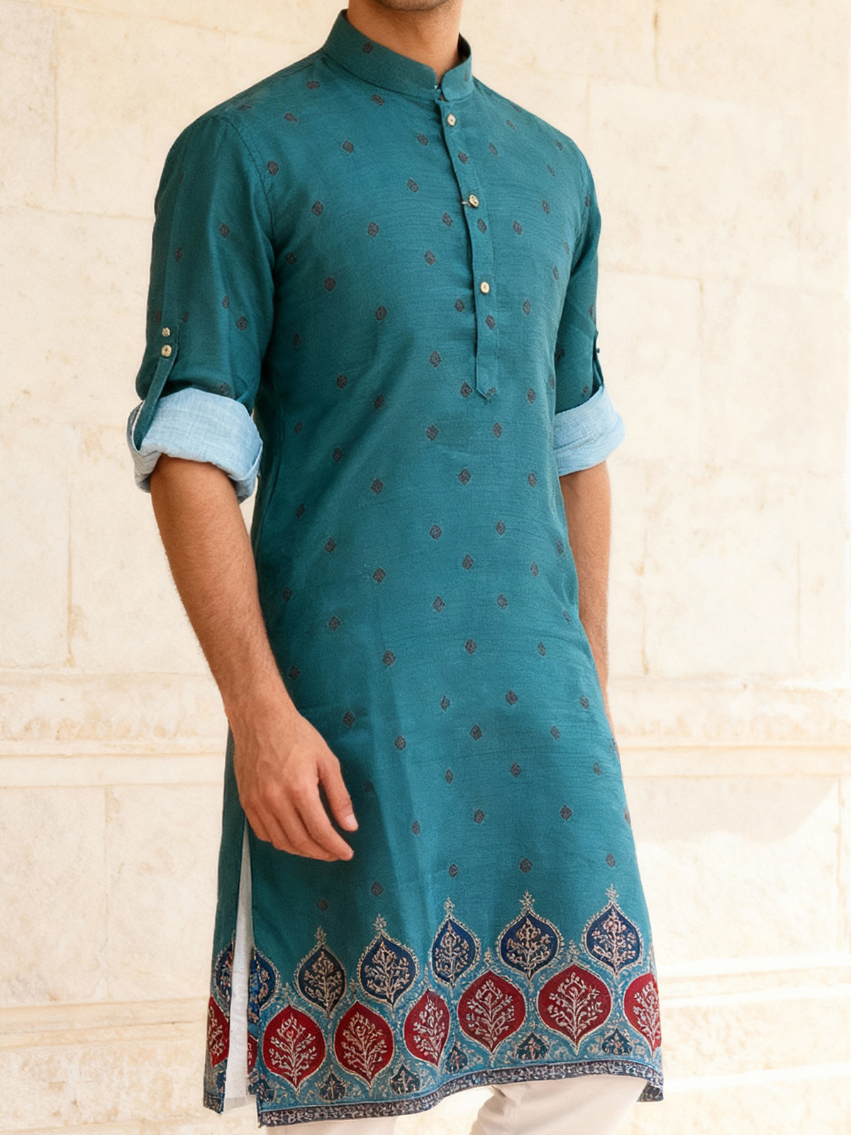 Crafted in smooth silk, this teal blue kurta features delicate Chikankari embroidery with floral and dotted patterns across the body, finished with a distinct embroidered hem border and subtle sequin accents. Designed with a chinese collar and full sleeves, it is paired with a white pyjama for weddings and sangeet occasions.