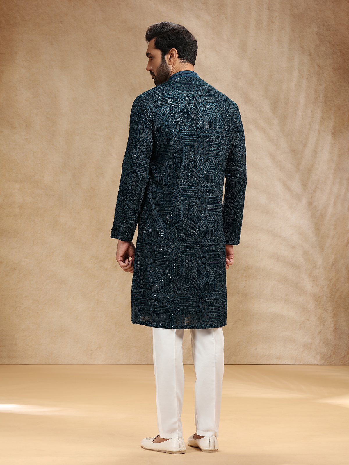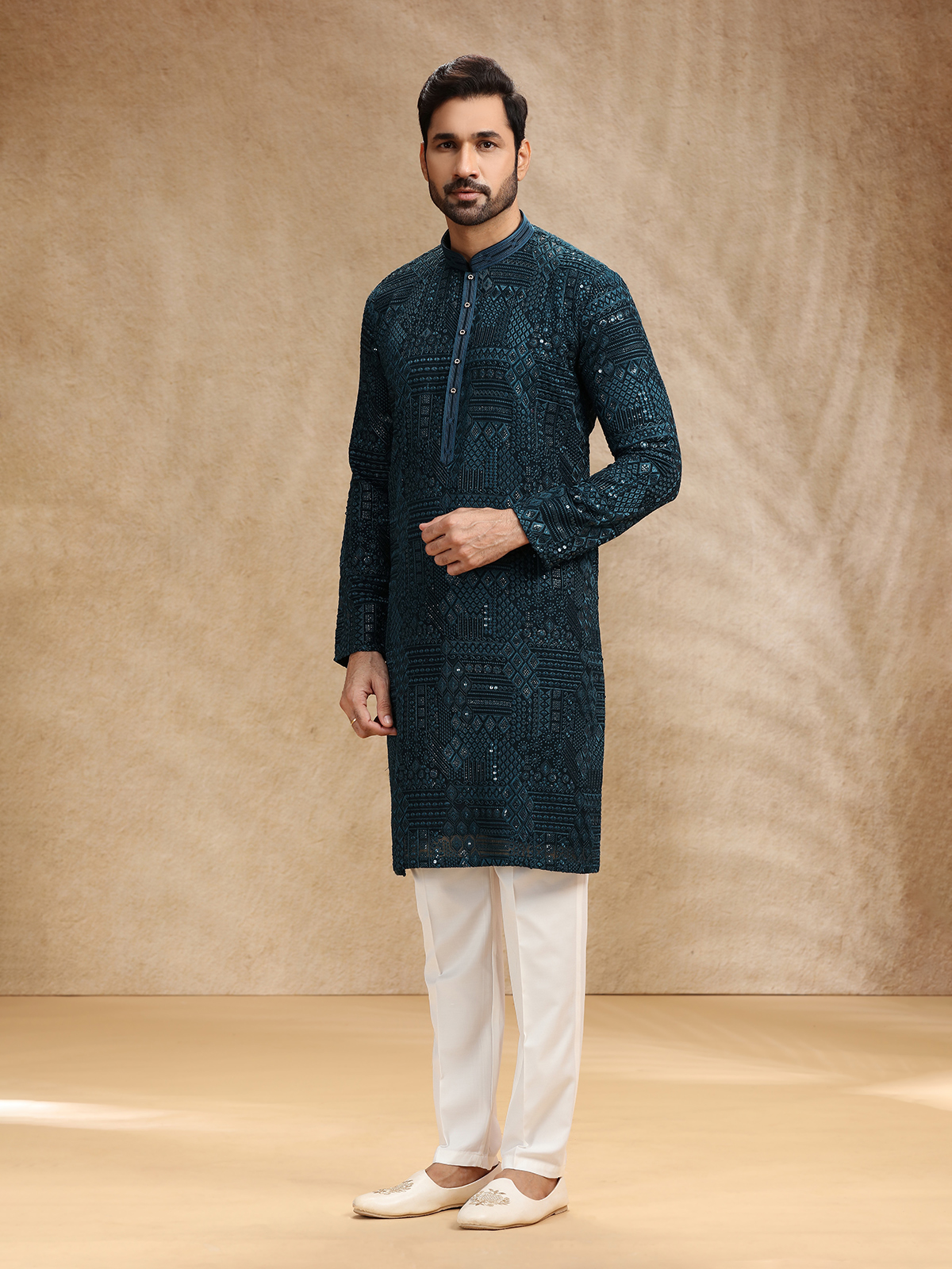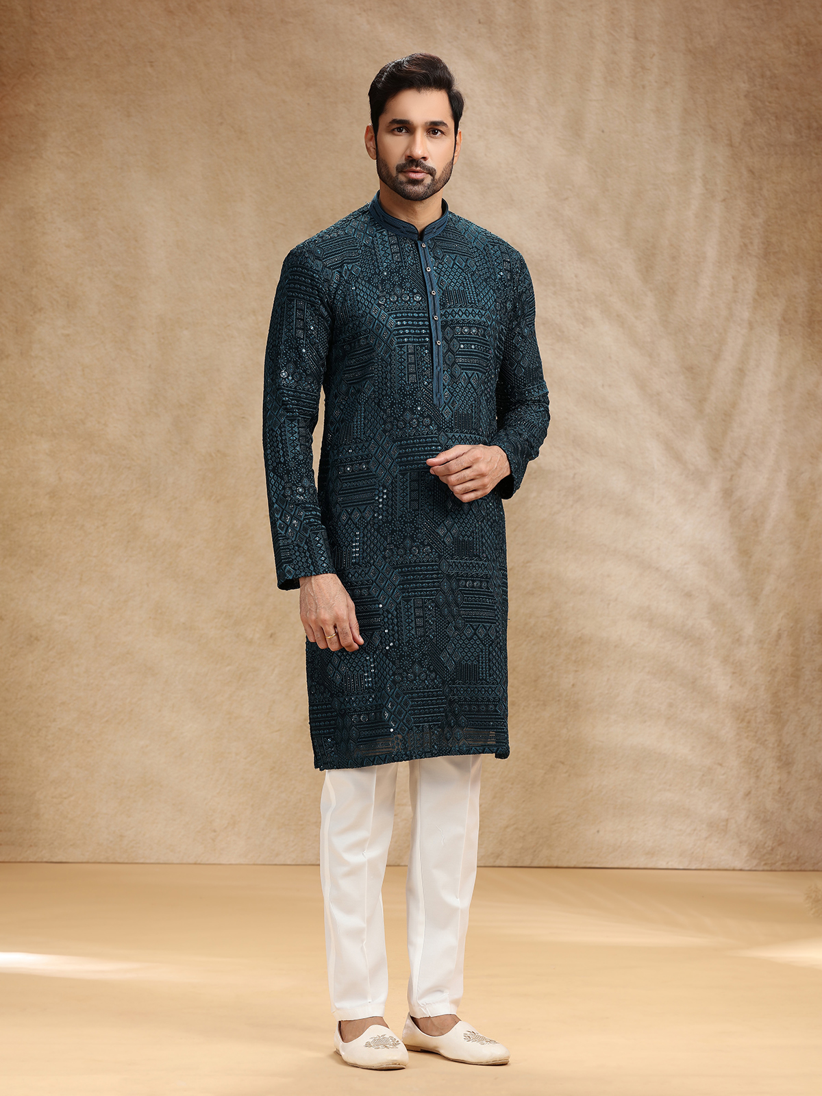 Teal Blue Georgette Men Festive Kurta Pajama
