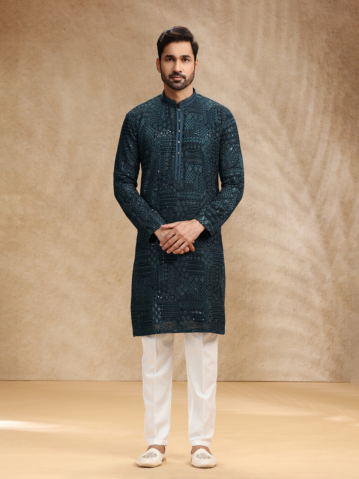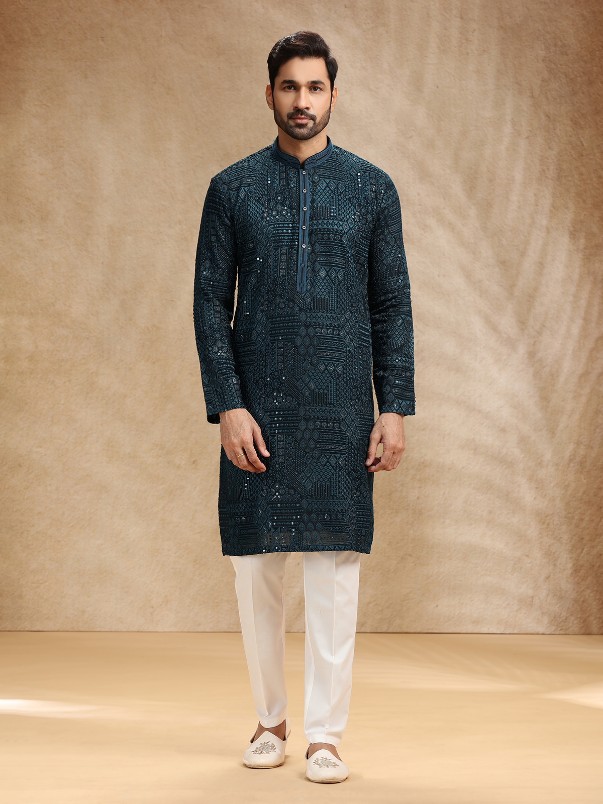 In radiant teal blue georgette, this kurta suit sparkles with resham and sequins, exuding delicate festive beauty. Styled with a refined stand collar and full sleeves, it pairs with tailored pants for modern poise. The soft teal hue infuses freshness and serenity, creating attire that reflects cultural elegance and understated grace for special occasions.