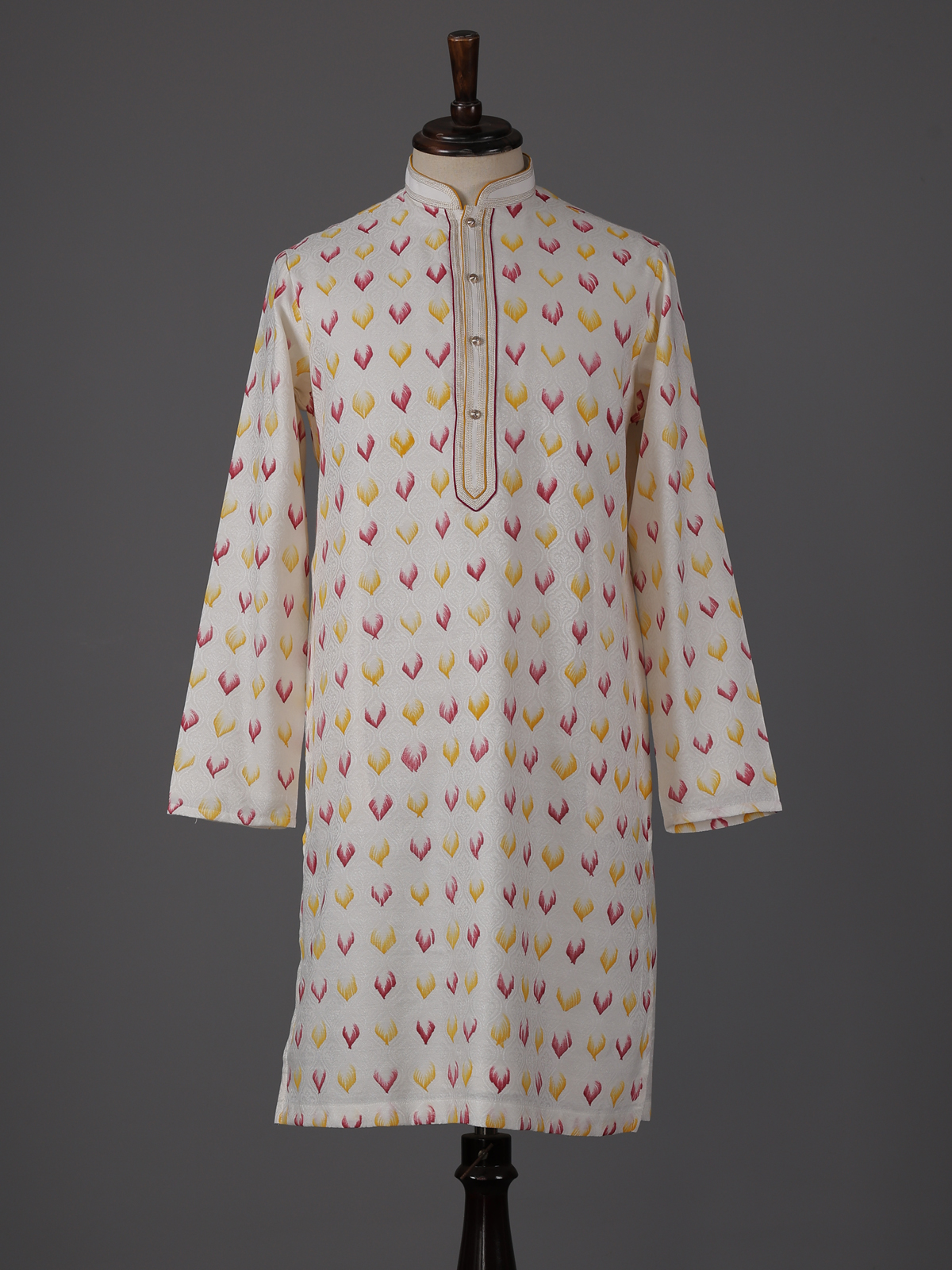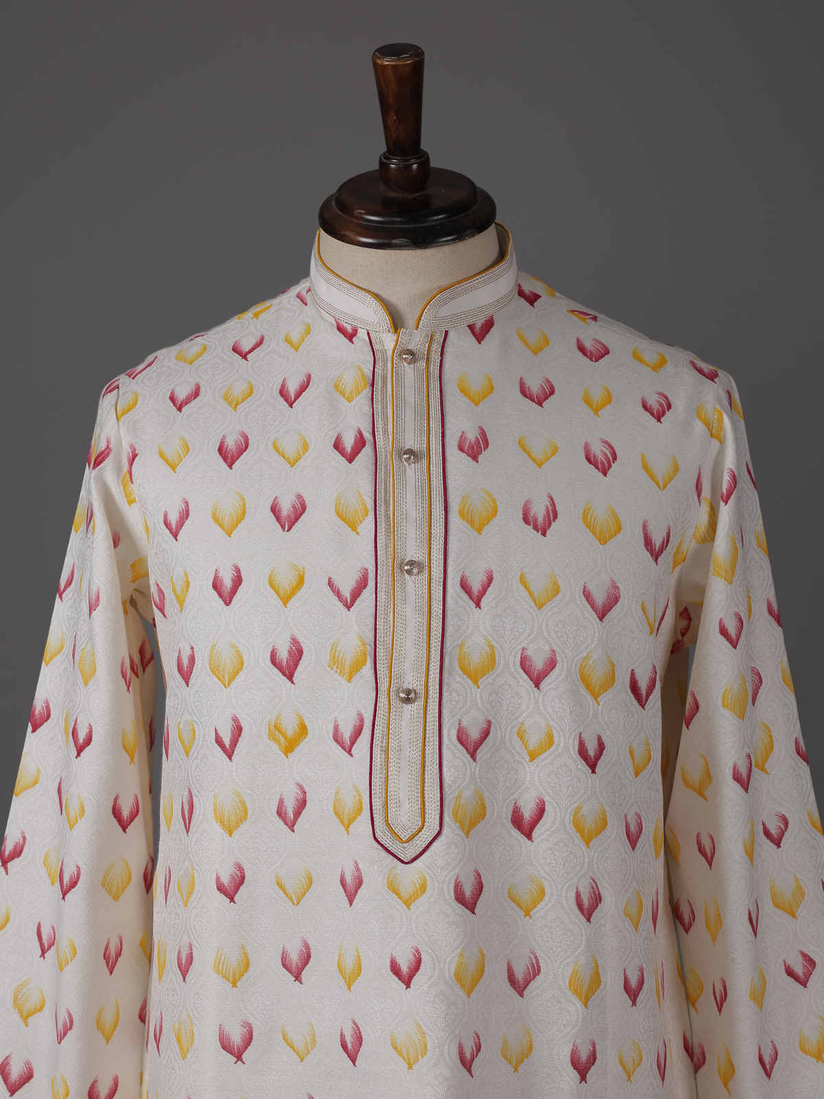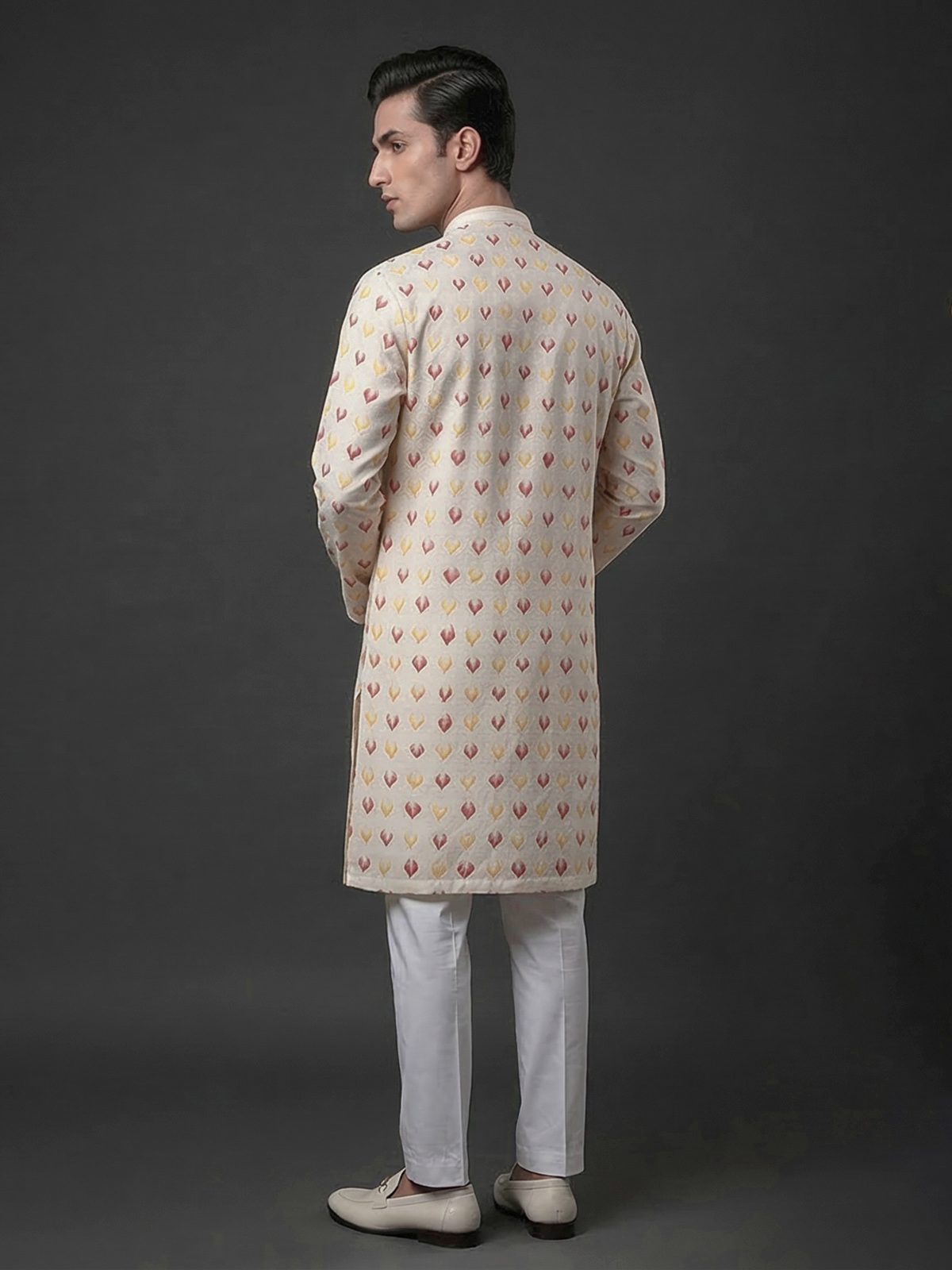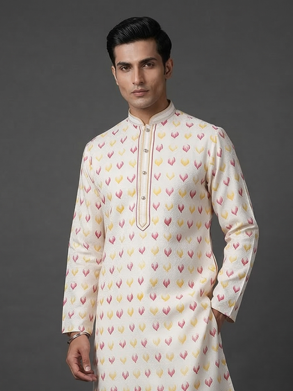 Subtle luxury defines this cream silk kurta suit. Crafted for graceful festive styling. The mandarin collar design enhances its timeless appeal, while elegant zari weaving texture adds depth and richness to the ensemble. Made from smooth silk fabric and paired with tailored pants, the outfit creates a refined silhouette perfect for festive gatherings, eid celebrations and lively sangeet evenings.