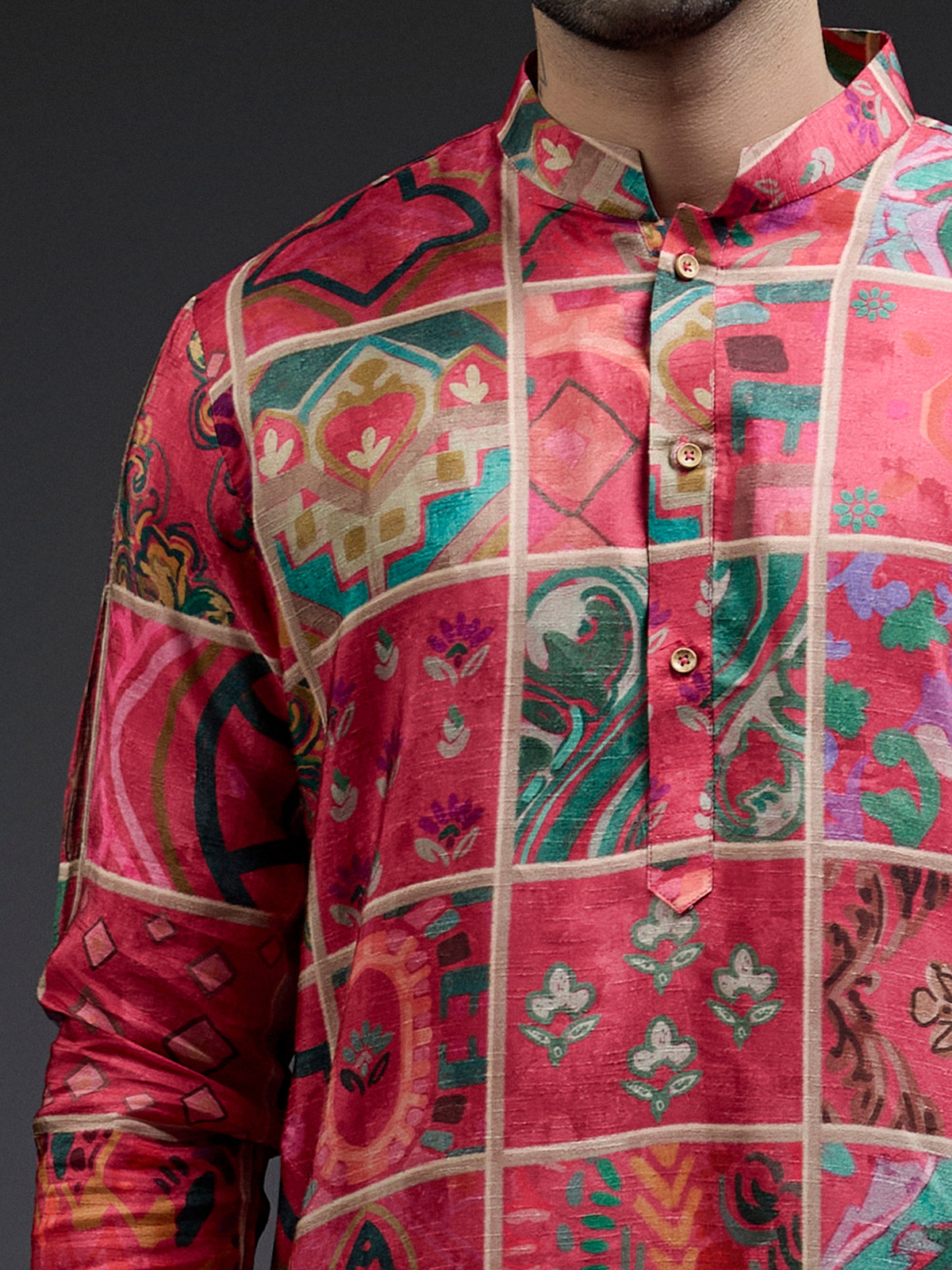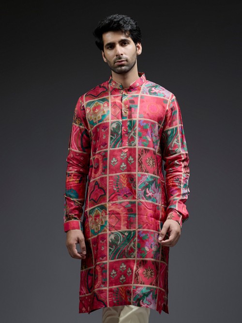 Wear this dark pink silk simple kurta suit to celebrate this holiday season in elegance and tradition. has long sleeves and a mandarin collar. A cream bottom is included.