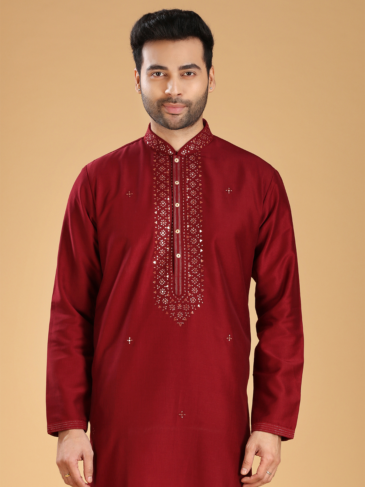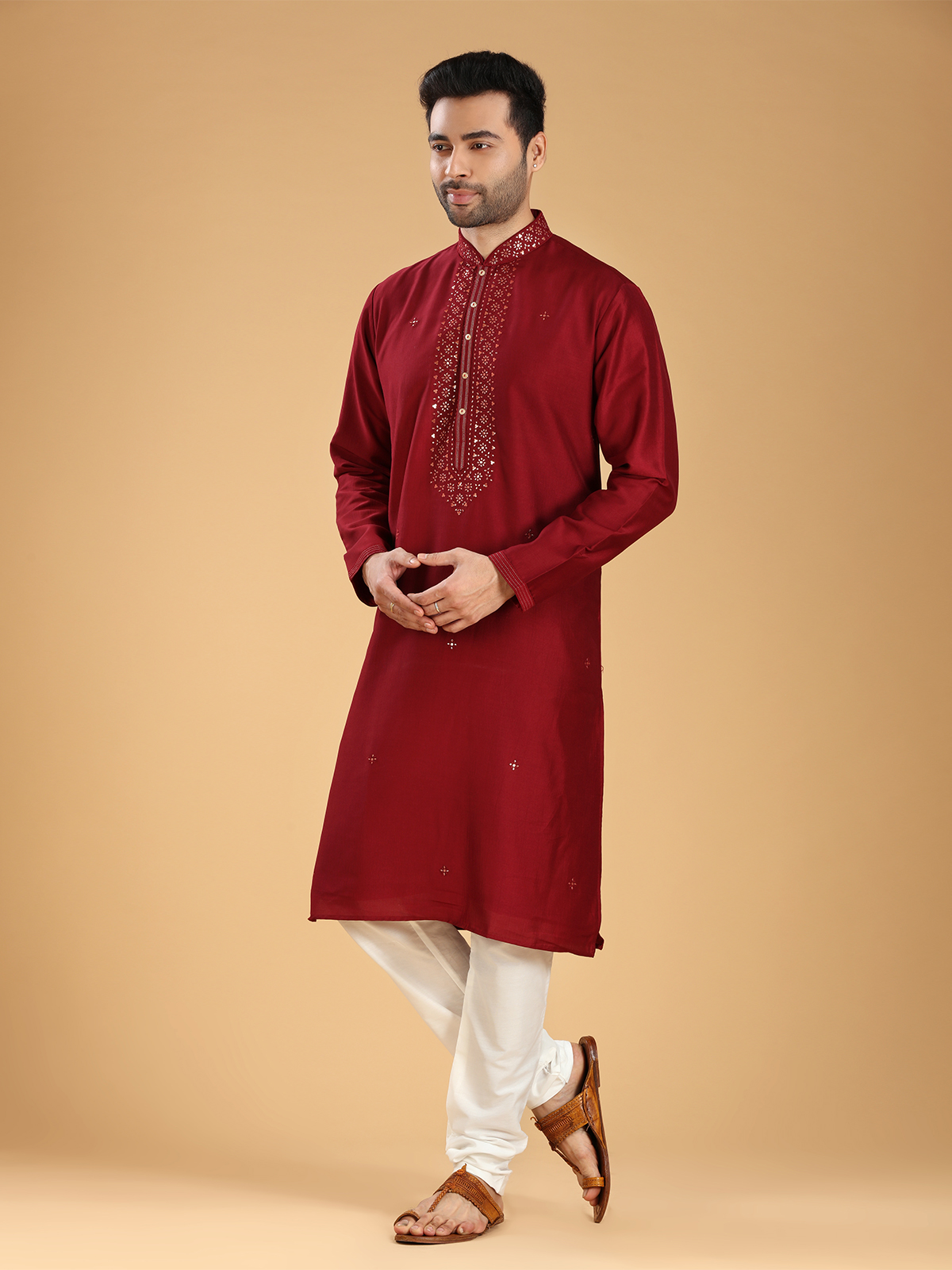 This silk kurta suit made out of comfortable fabric, intricate aabla and thread work designs and classy maroon color, this set needs to make a space in your ethnic collection. It has a mandarin collar and full sleeves. Comes with a bottom.