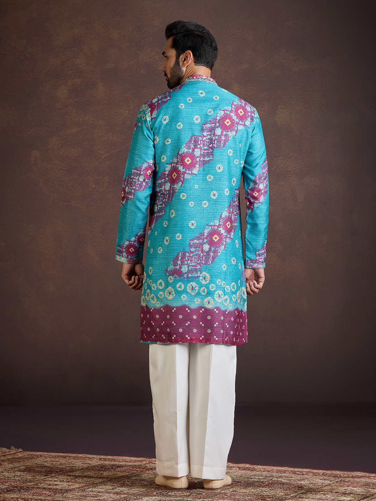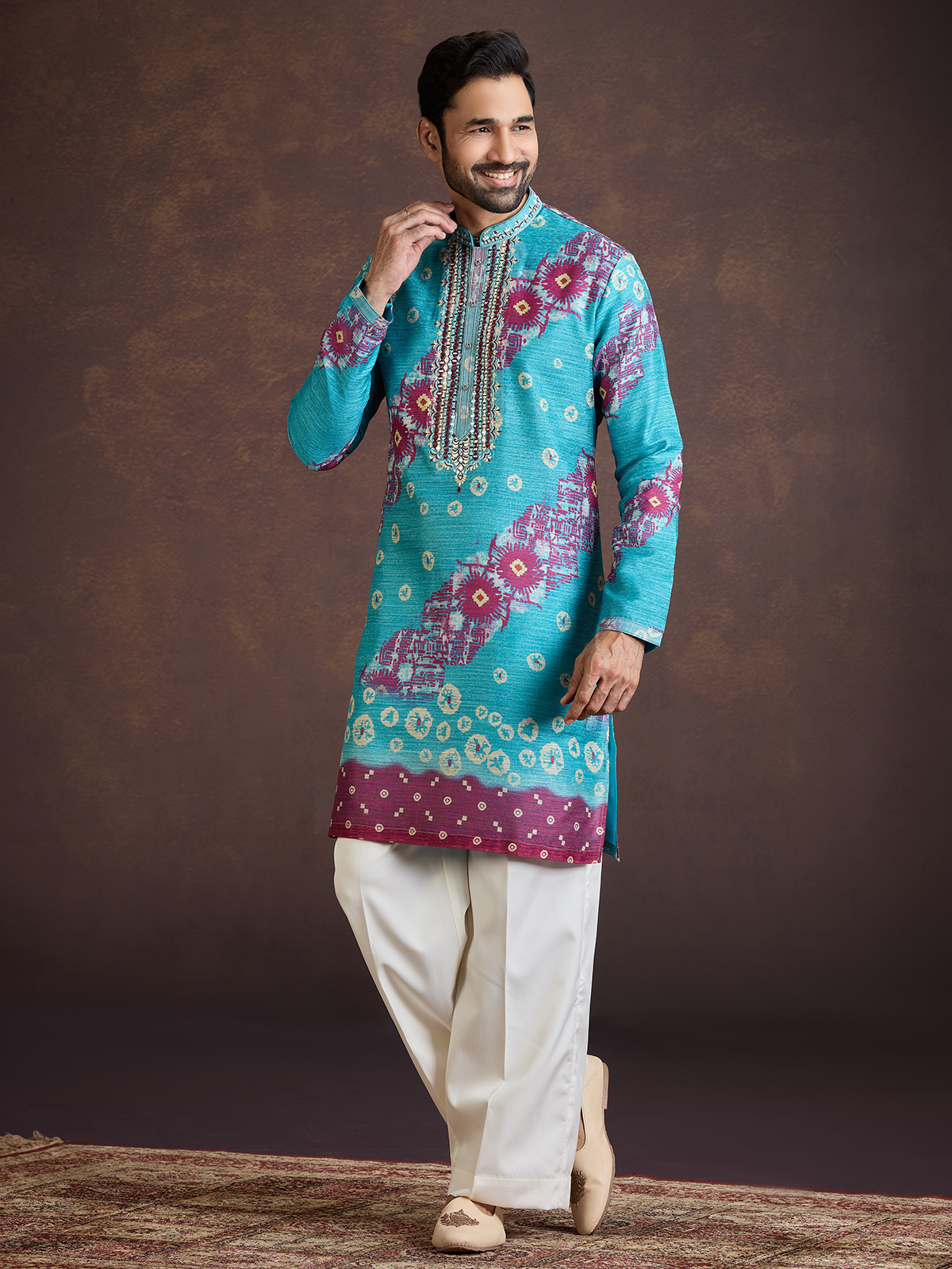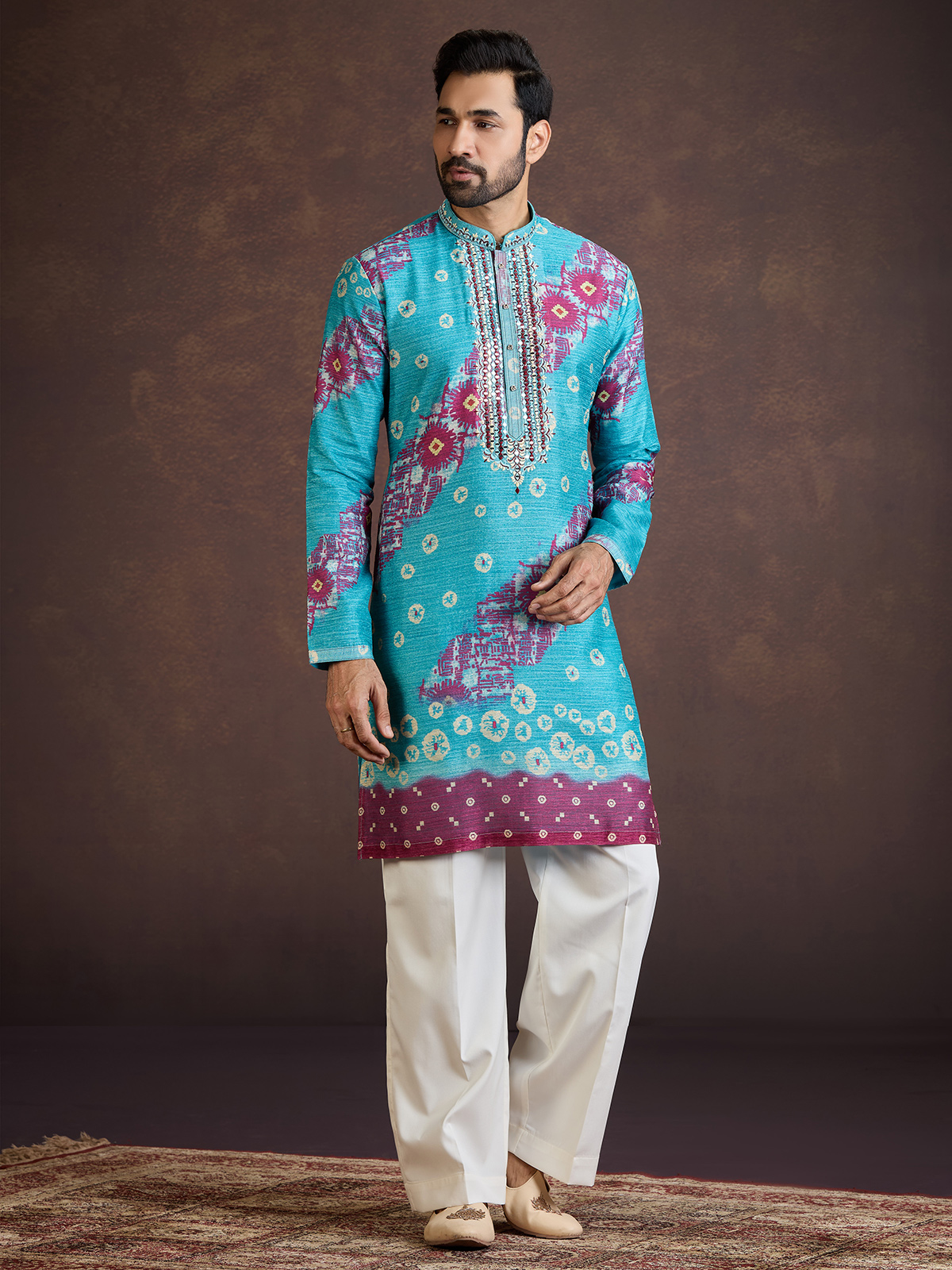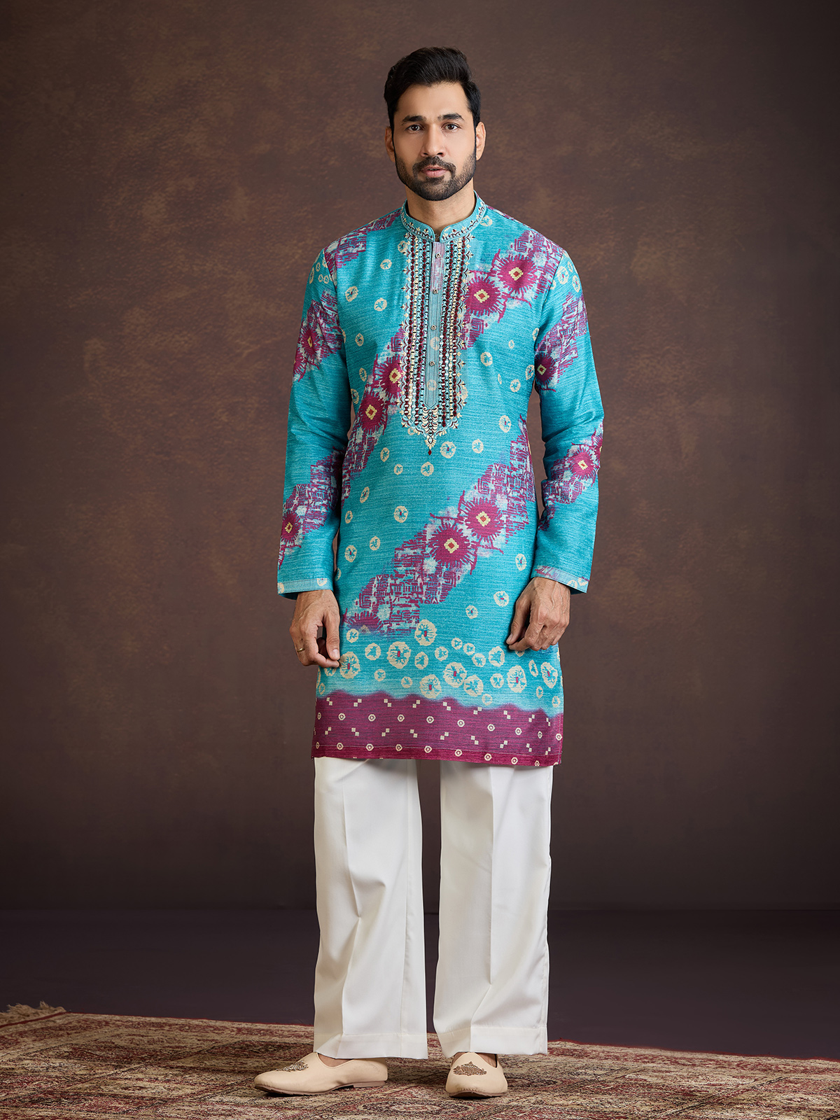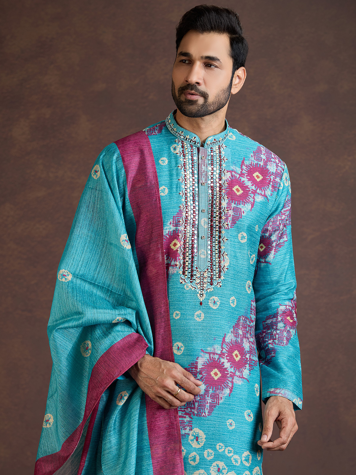 This vibrant turquoise blue silk kurta suit is a contemporary expression of classic ethnic wear. The kurta features a striking bandhani-inspired print in shades of magenta, elevated with heavy aabla and thread embroidery along the neckline and placket. Paired with clean white trousers and a dual-toned turquoise and magenta stole, the ensemble creates a regal festive look, making it an ideal choice for wedding celebrations and special festive occasions.