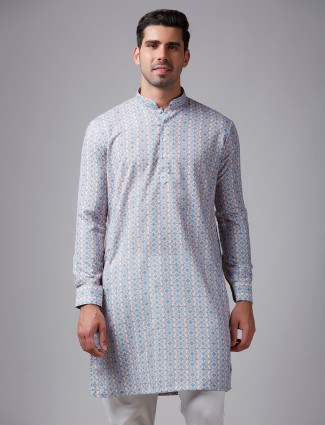 Achieve a smart and sophisticated look with this white and blue printed silk kurta suit. Featuring a mandarin collar, full sleeves, and a coordinating bottom, it offers a timeless appeal for your festive attire.