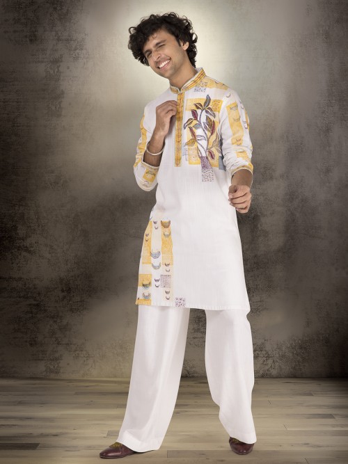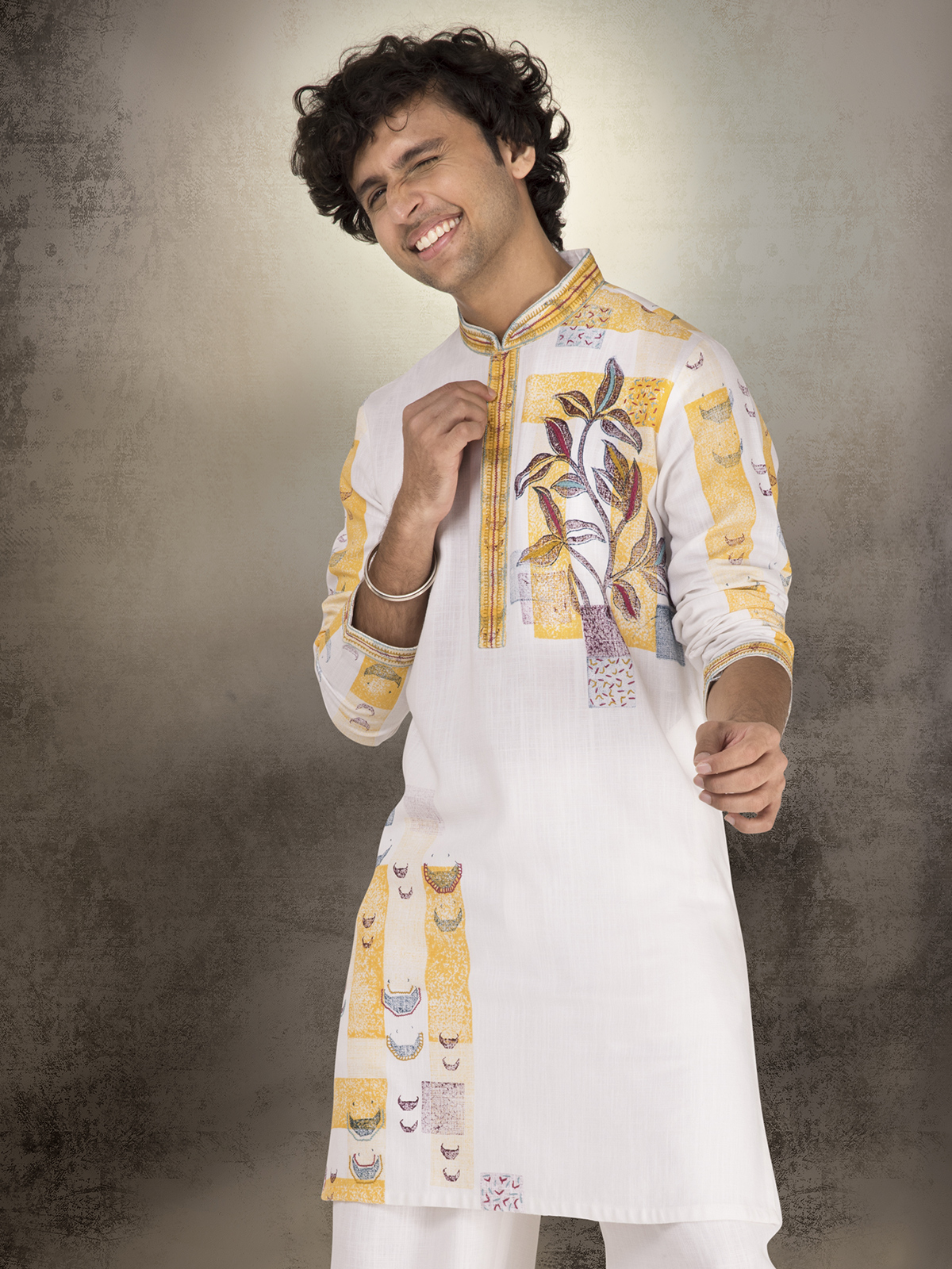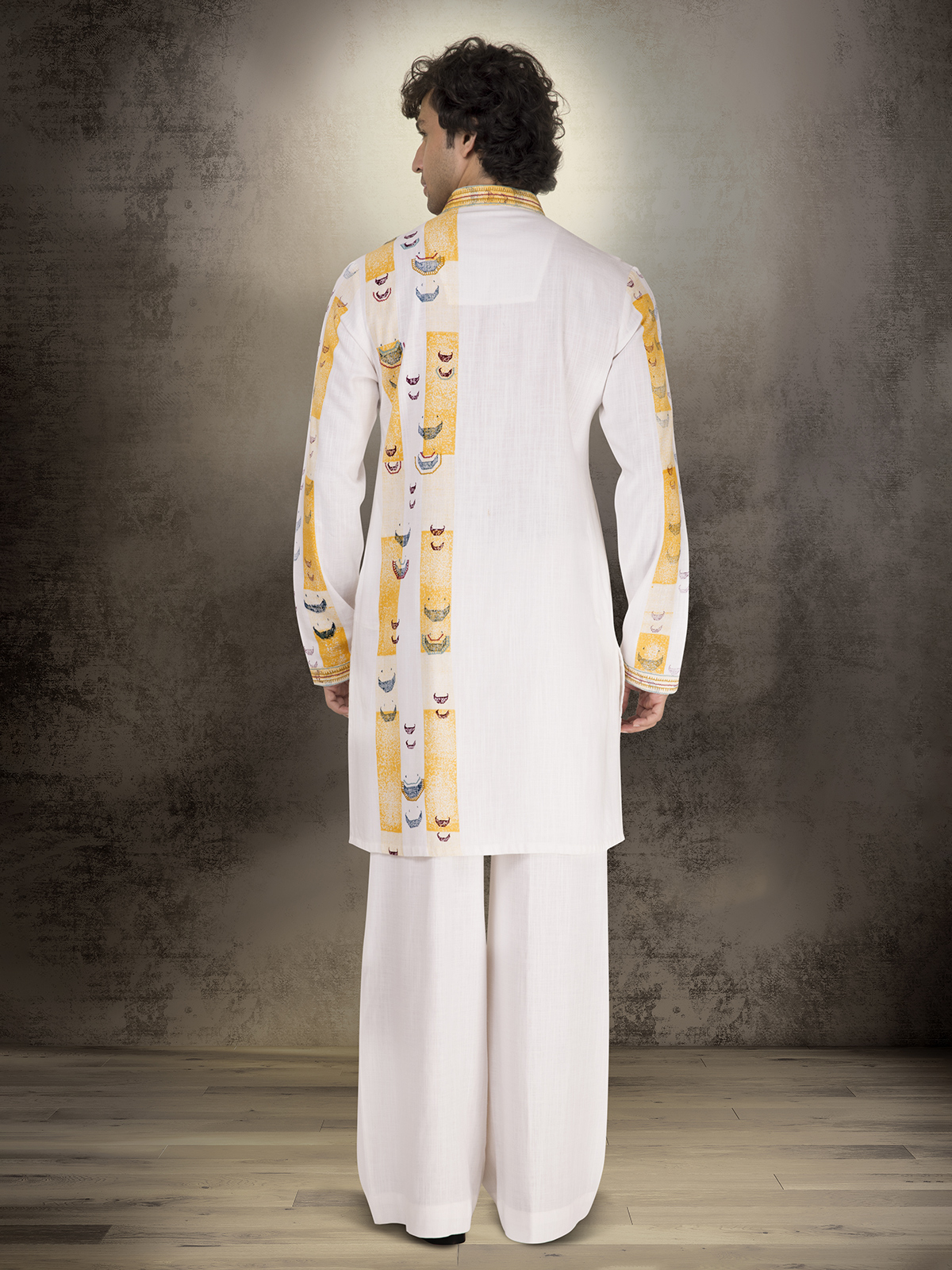 Designed in soft linen cotton, this white and yellow printed kurta suit radiates joyful warmth. The mandarin collar accentuates its refined design, capturing festive vibrance ideal for weddings and joyous ceremonies. Comes with a matching bottom for effortless elegance.