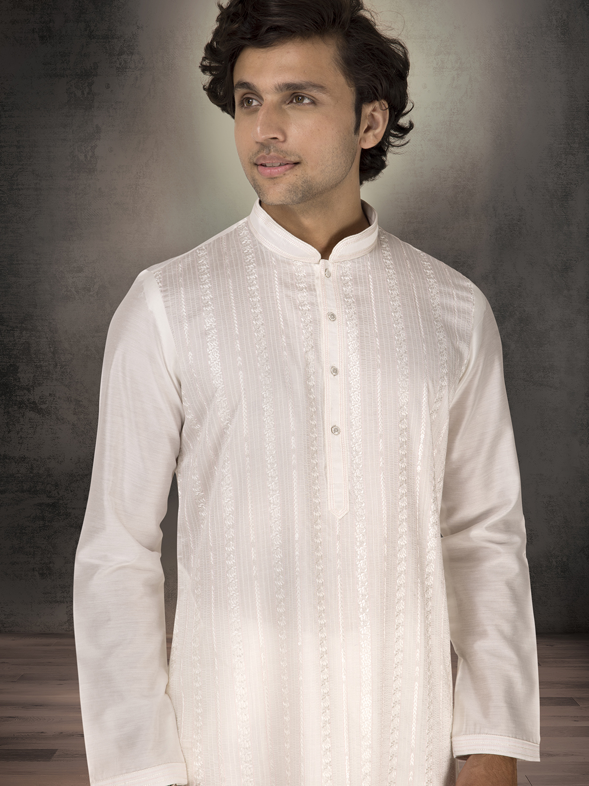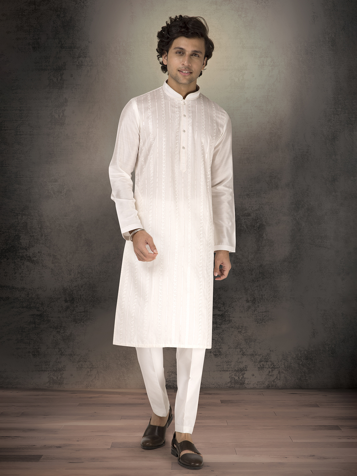 Shimmering softly in white Chanderi silk, this kurta suit features delicate thread and sequins detailing. The mandarin collar and pant pairing create a radiant festive ensemble for joyful rituals.