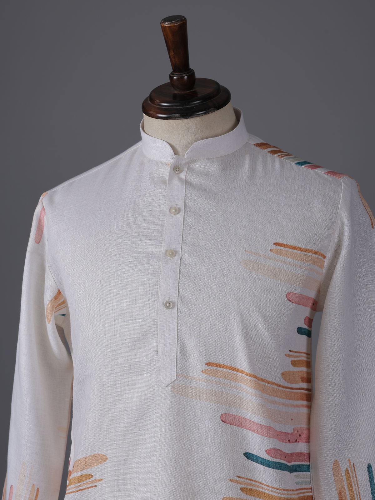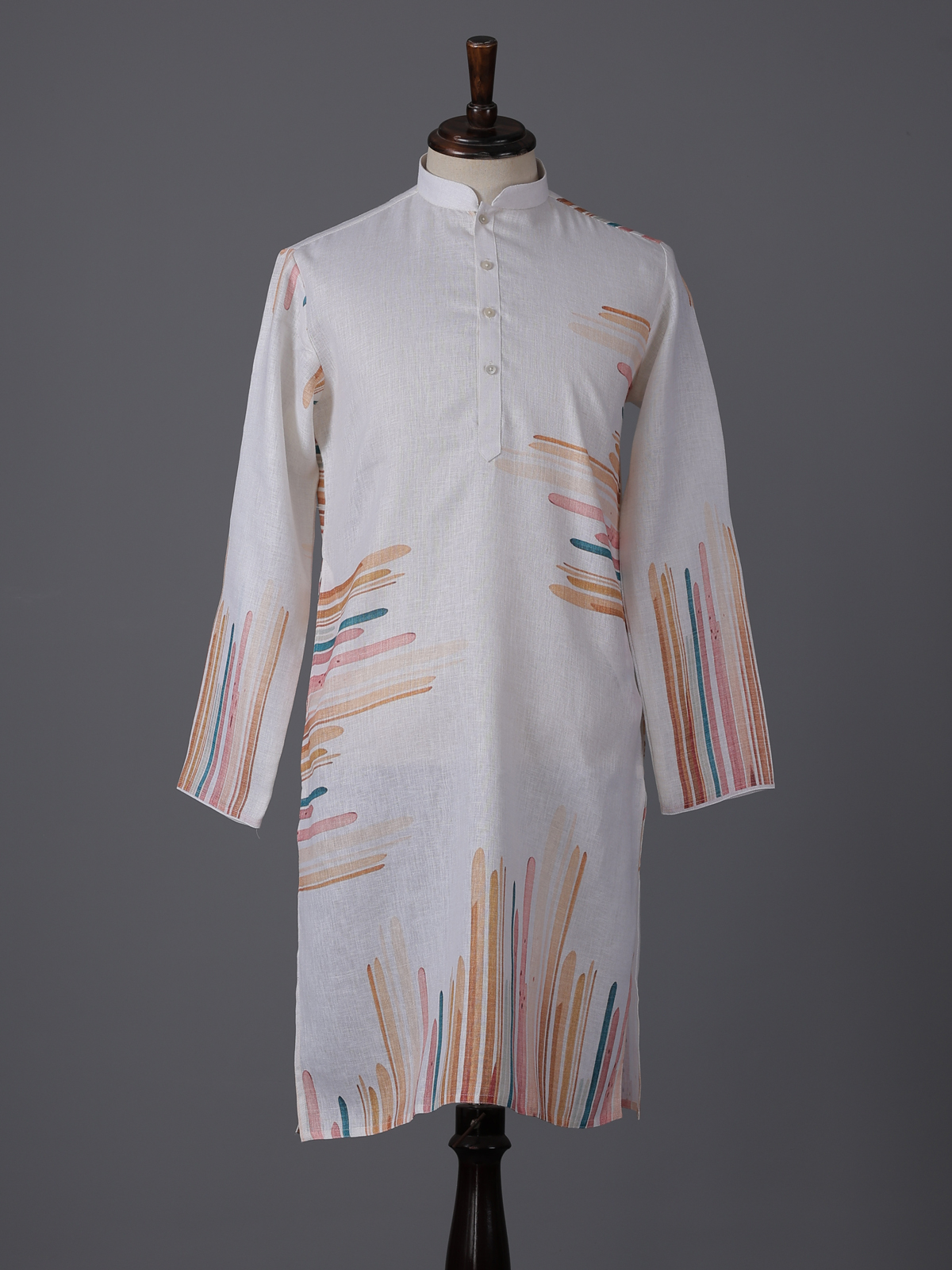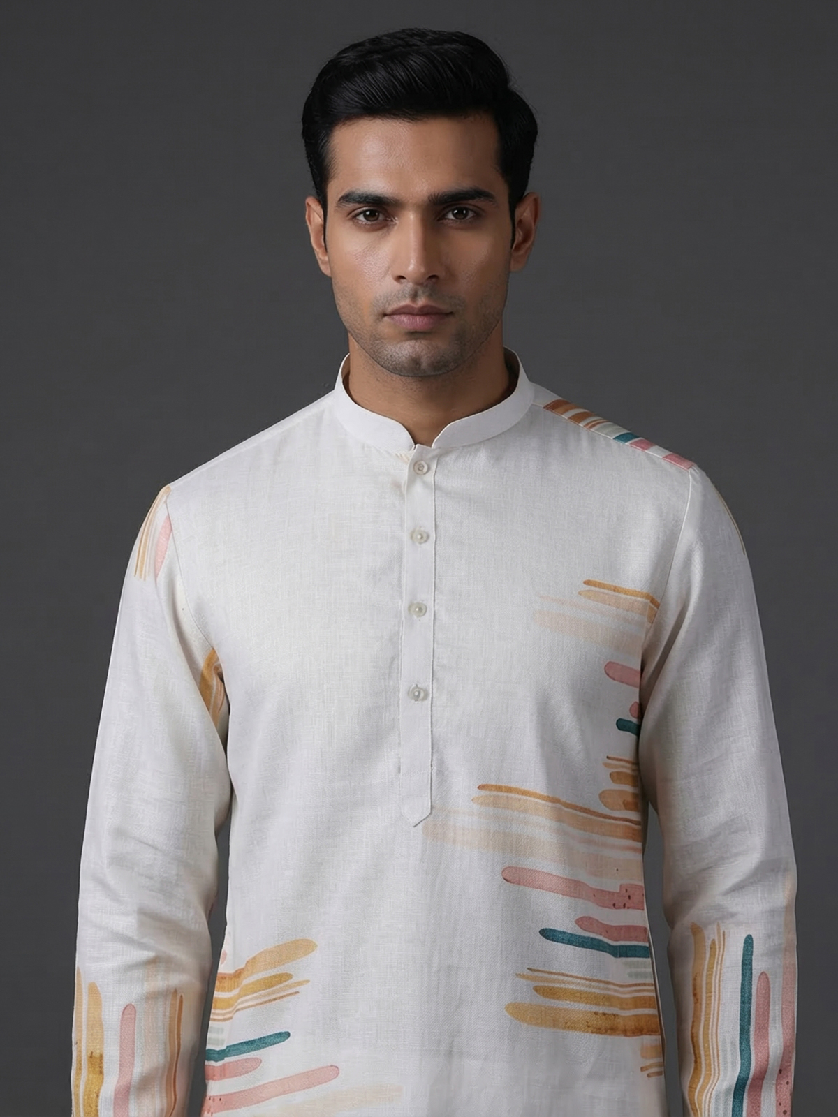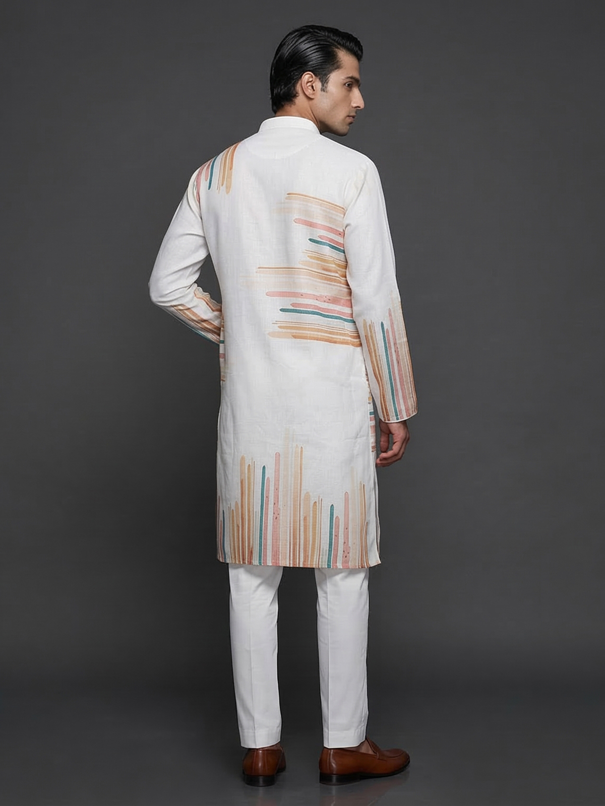 Light and refreshing white cotton linen kurta suit captures effortless festive style. The mandarin collar kurta showcases graceful printed detailing that adds a modern ethnic charm. Crafted from breathable cotton linen and paired with comfortable pants, the ensemble offers relaxed sophistication, making it ideal for festive gatherings and joyful eid celebrations.