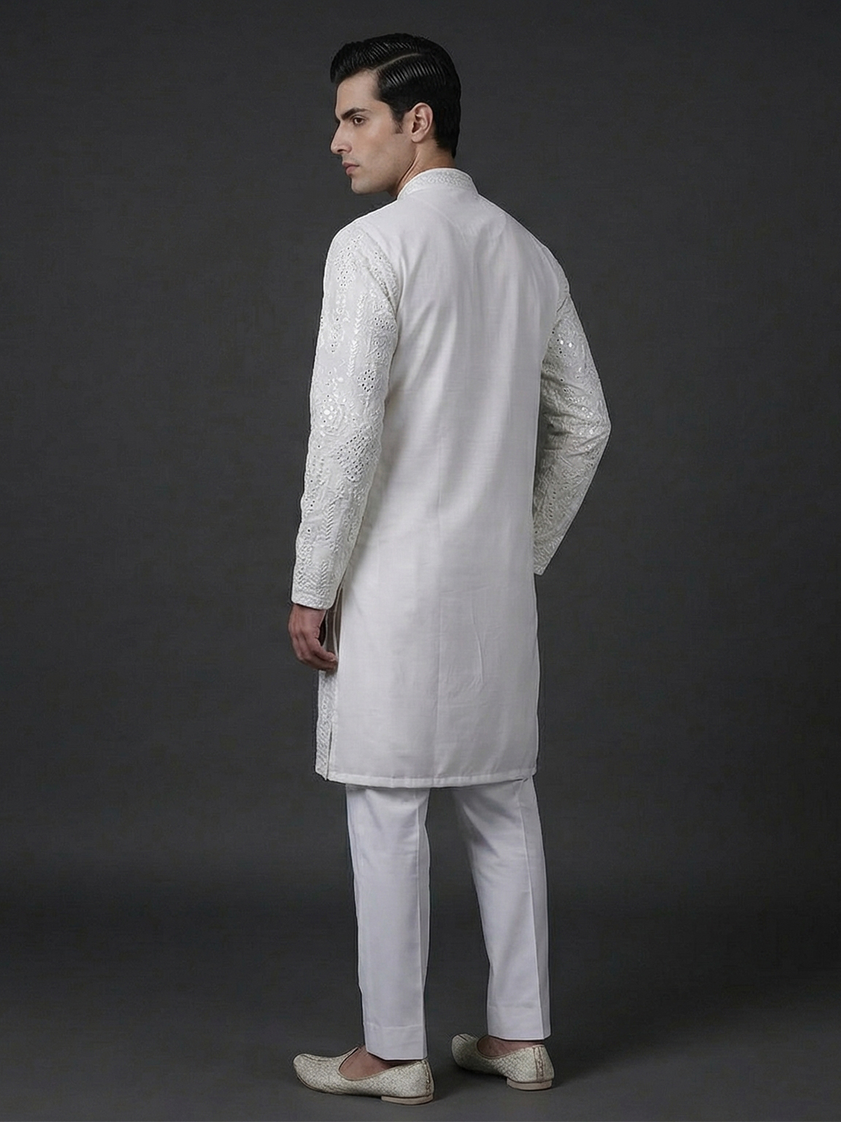 White Cotton Silk Embroidered Work Festive Kurta Suit