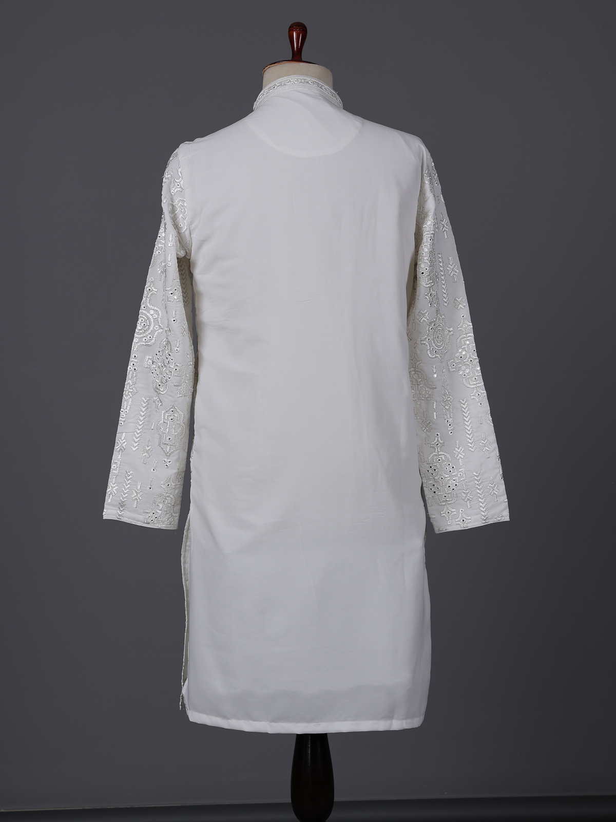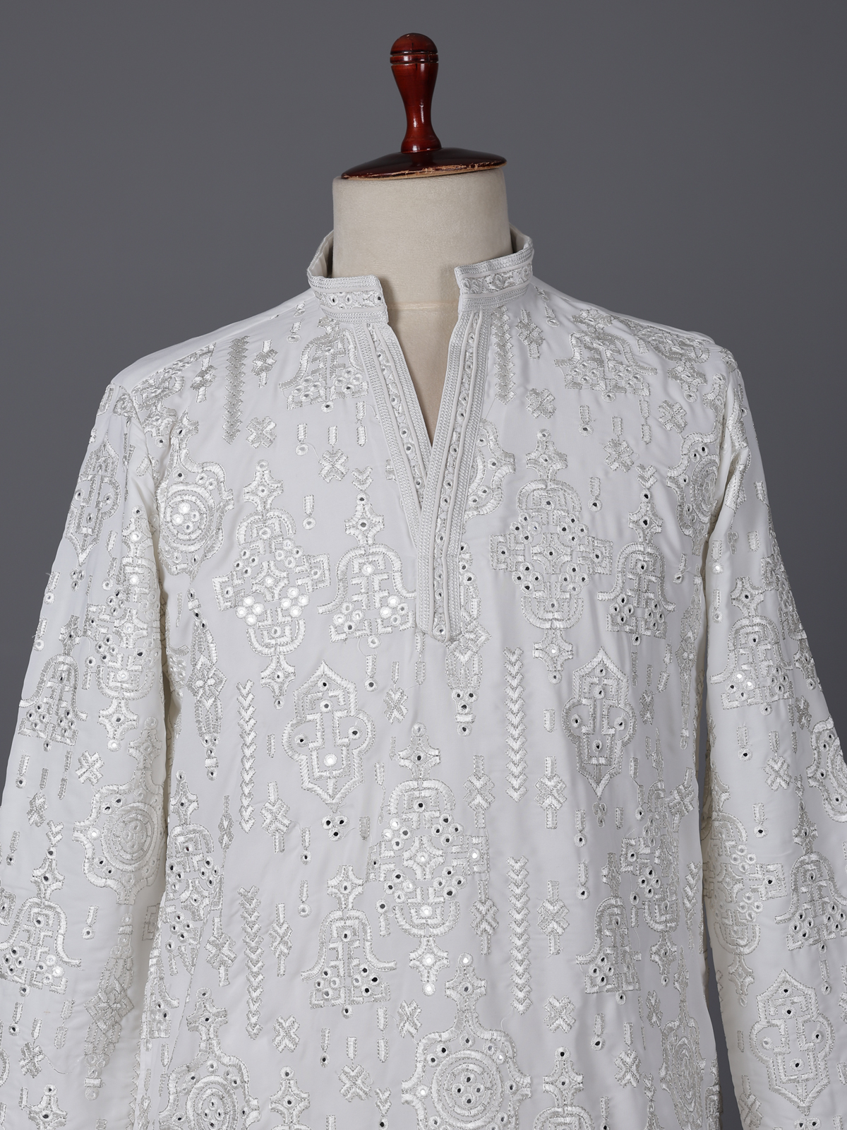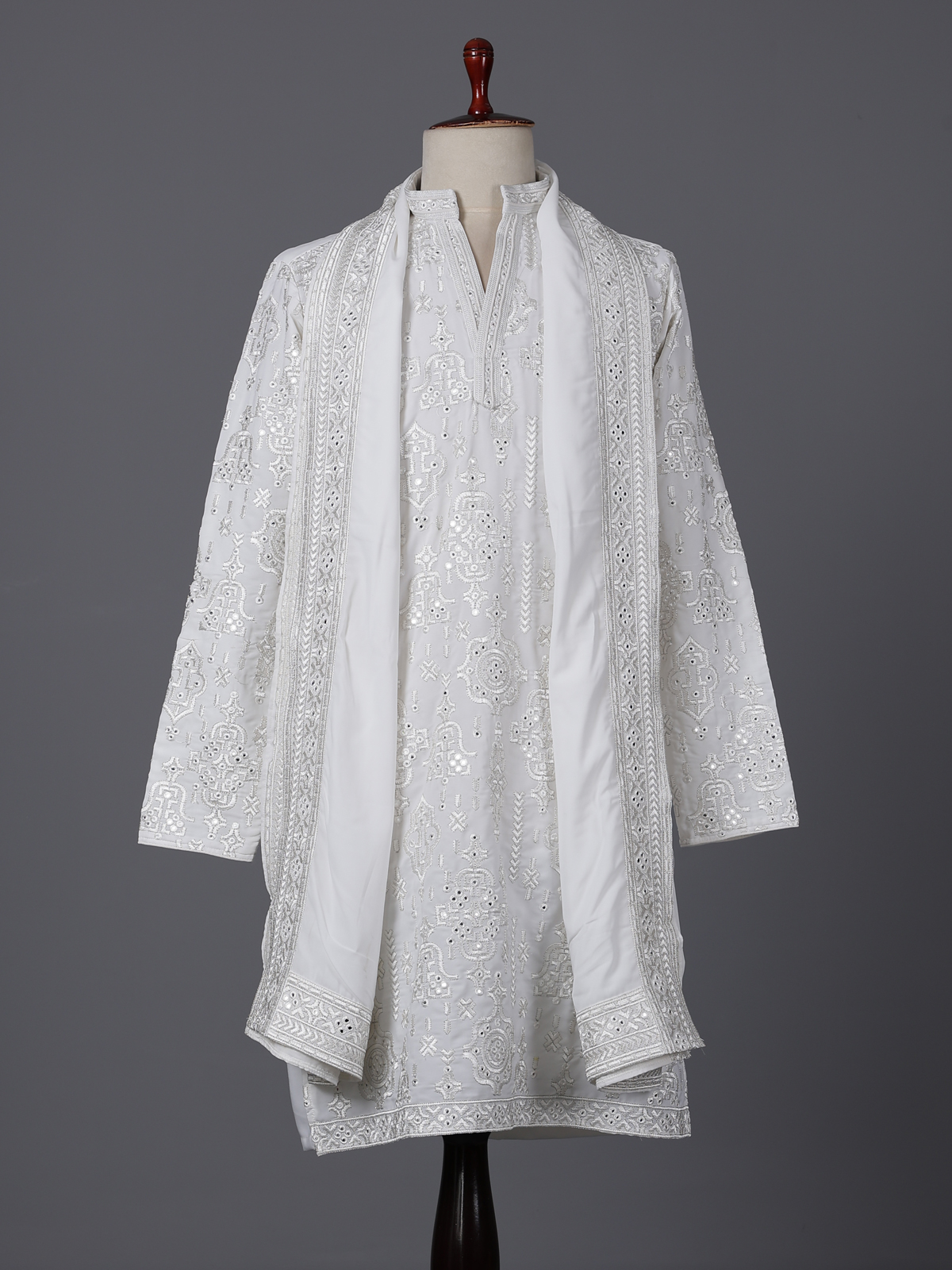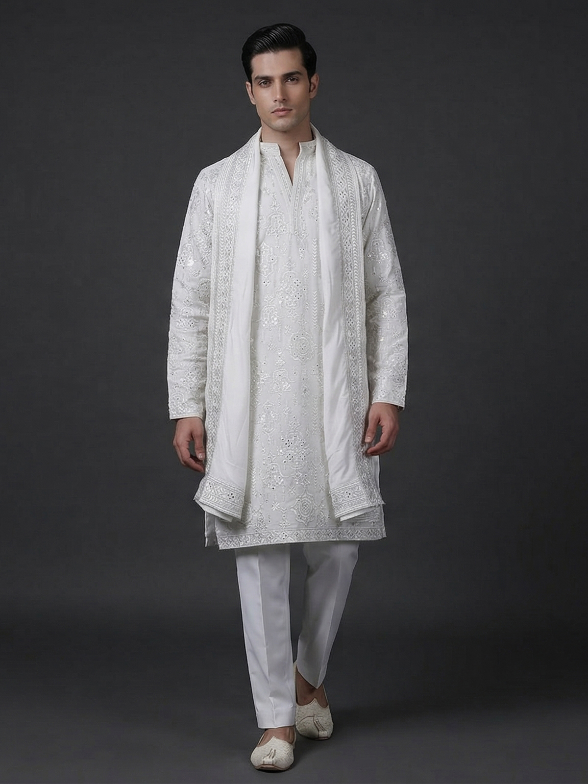 Graceful in white, this cotton silk kurta set features delicate embroidery with aabla detailing. The mandarin collar adds a refined finish, while the pant and dupatta complete the ensemble. Perfect for weddings and festive celebrations, it reflects serene elegance.