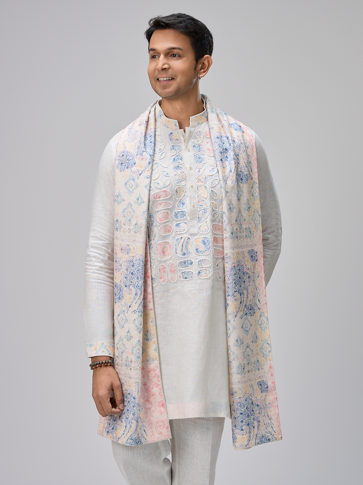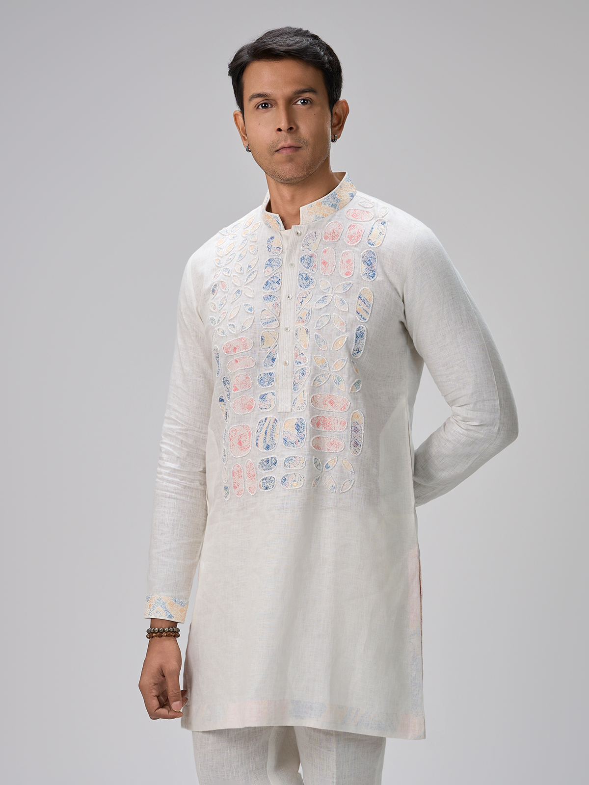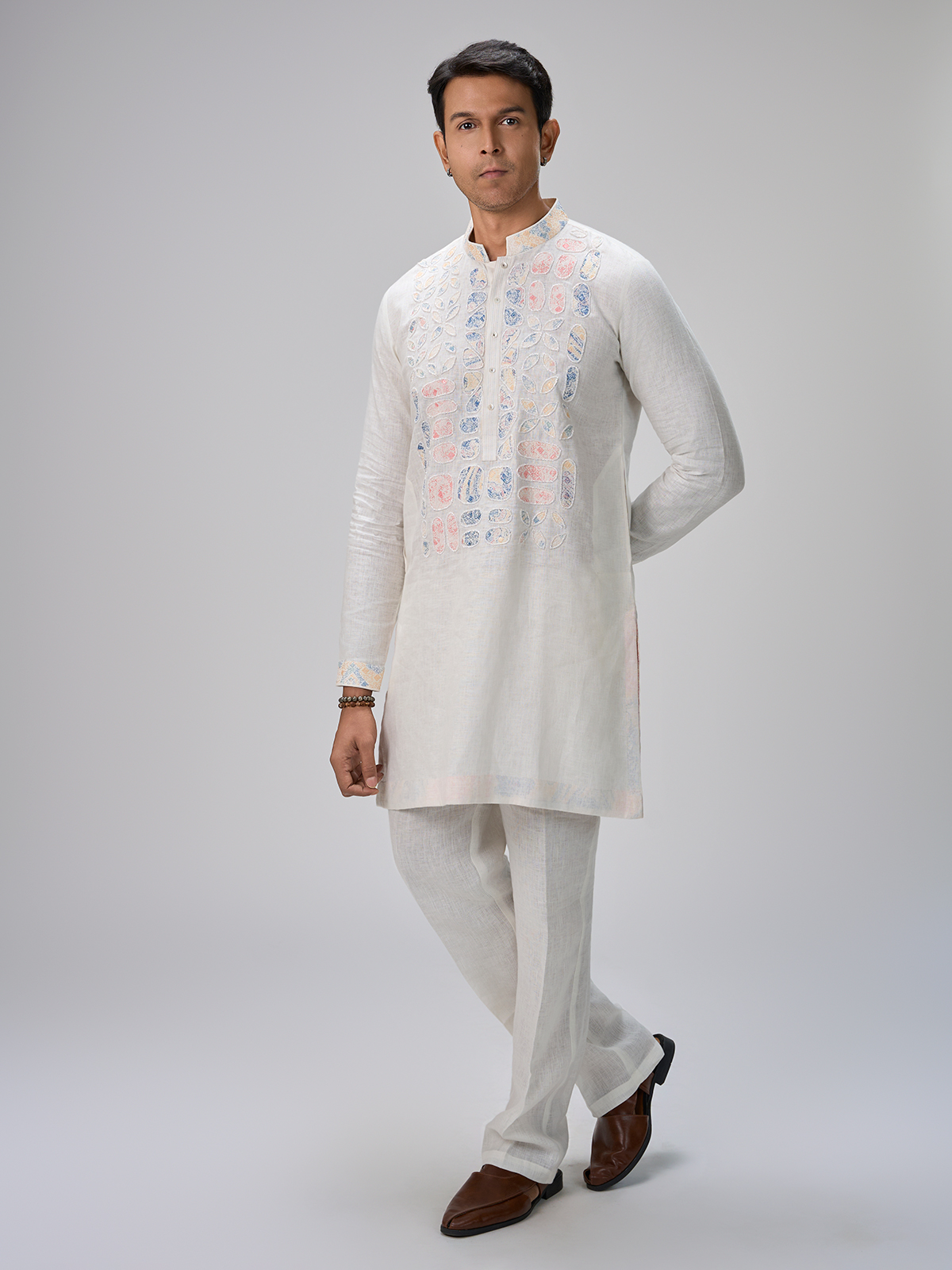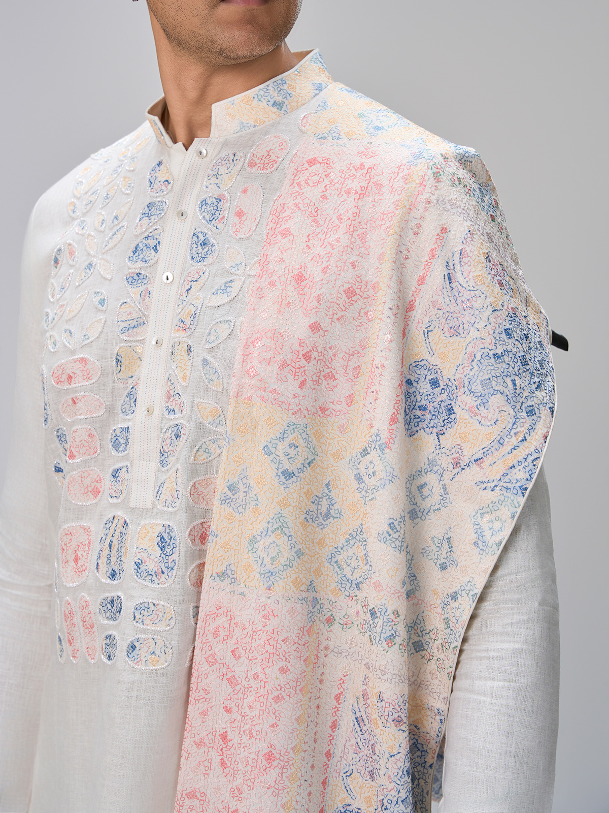 In white linen, this kurta displays cutdana and thread work paired with a coordinated dupatta for enhanced festive appeal. The dupatta showcases subtle detailing that ties the whole look together for weddings and sangeet. The chinese collar sharpens the silhouette, while the pant adds relaxed elegance.