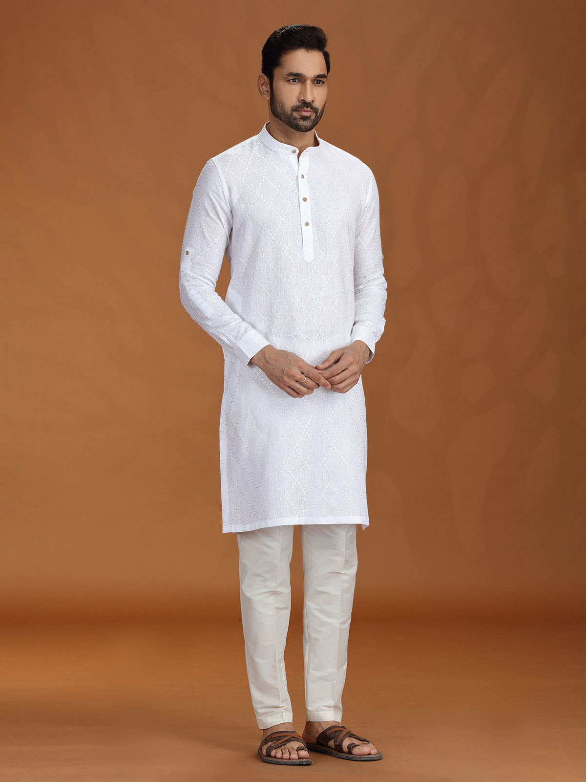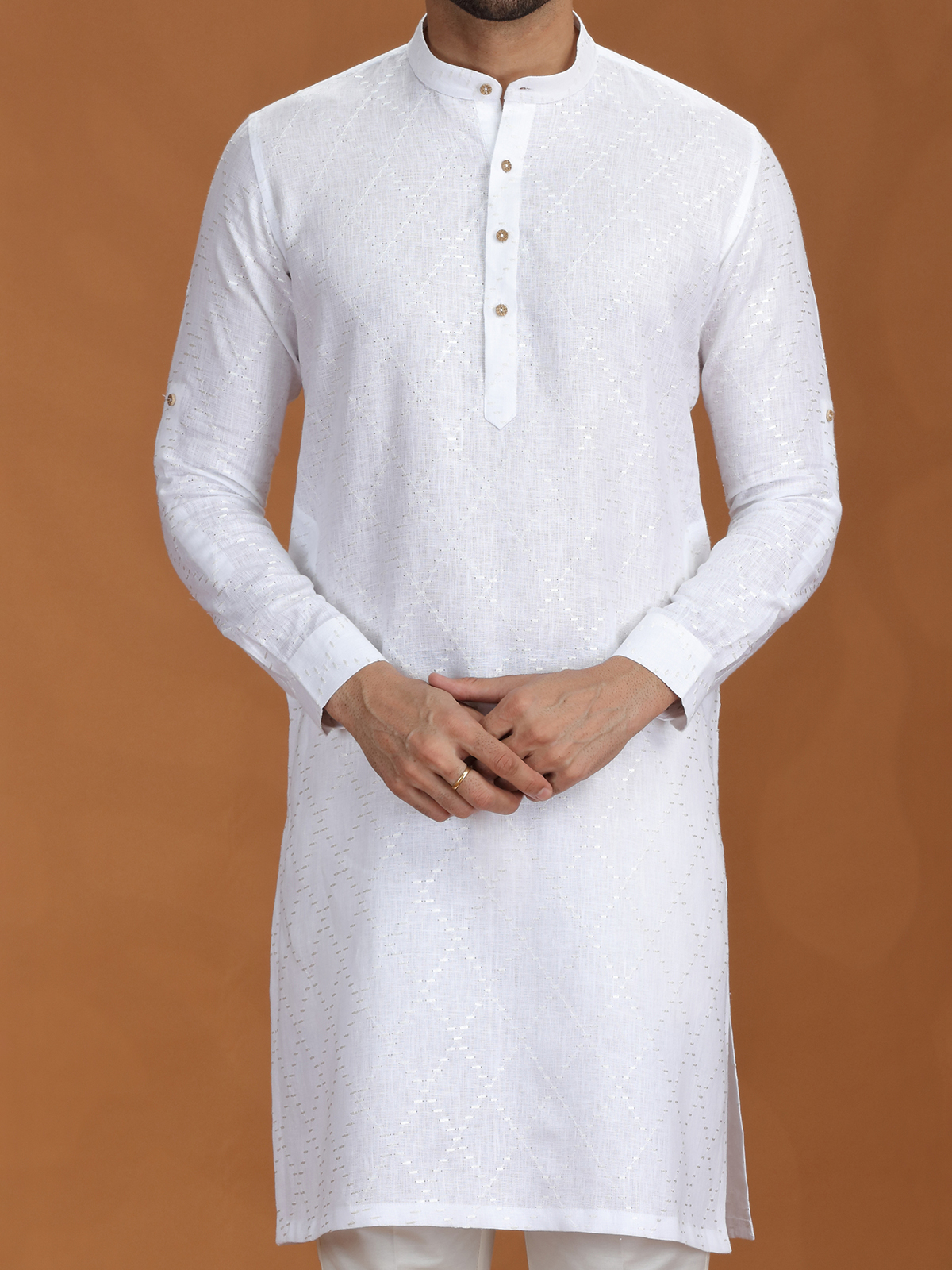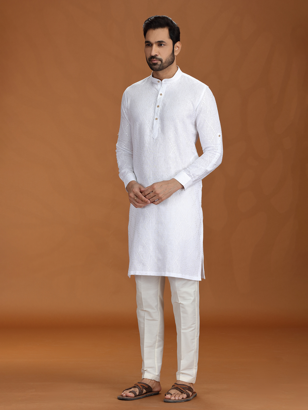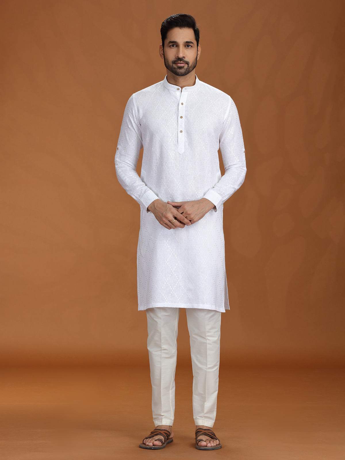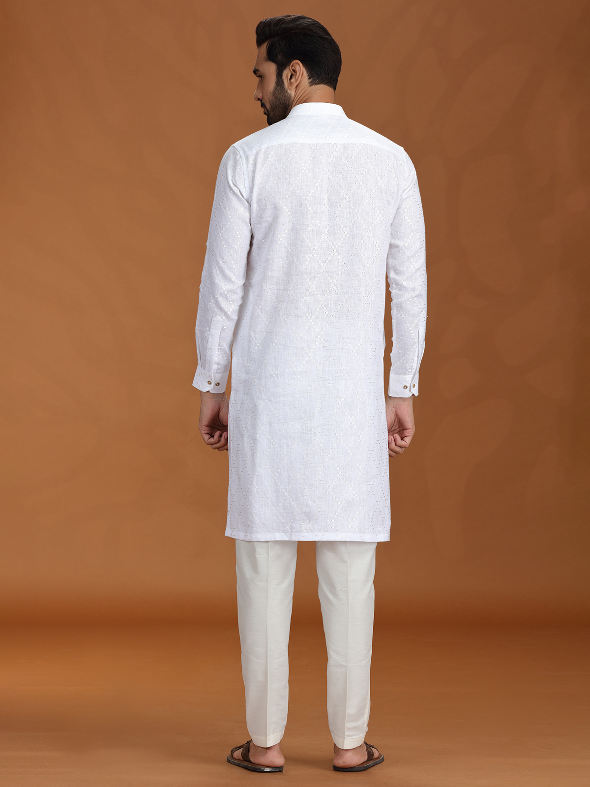 Crisp and majestic, this white linen kurta set is the embodiment of purity in festive wear. Delicate embroidery lends refined detail, while the structured fit and Chinese collar add a contemporary twist. Ideal for ceremonial functions, rituals, or timeless celebrations that call for grace and tradition.