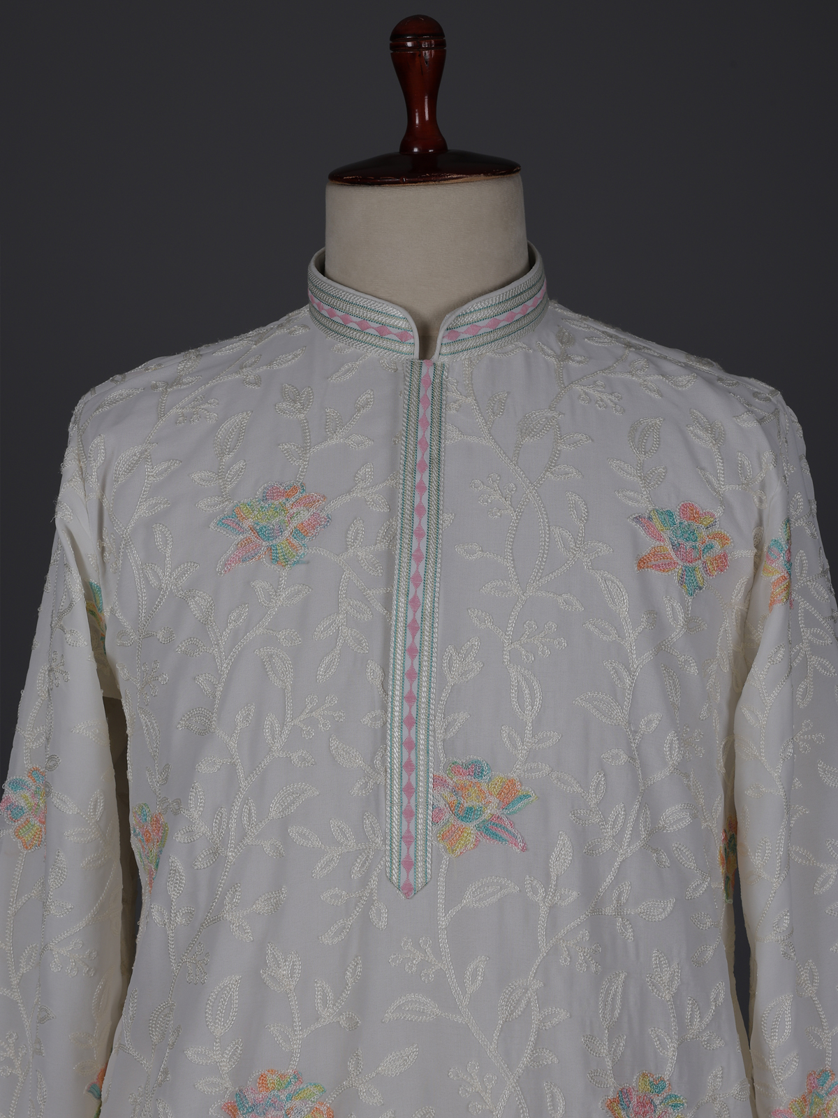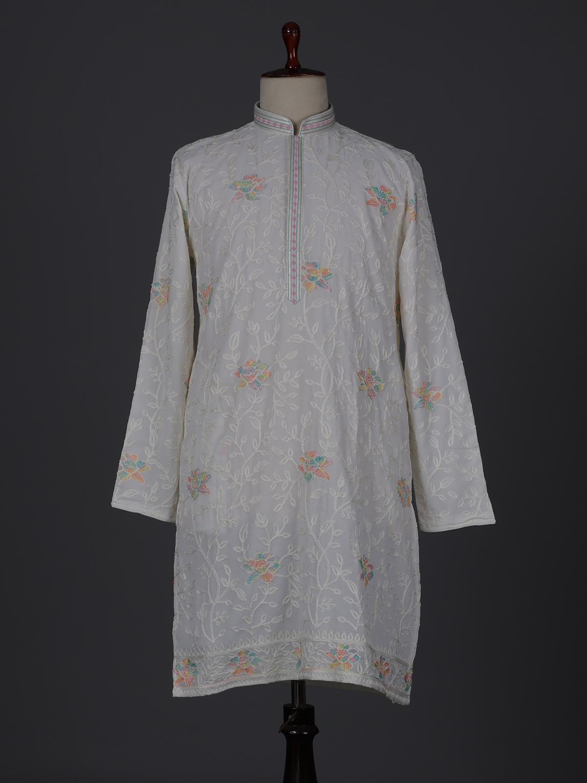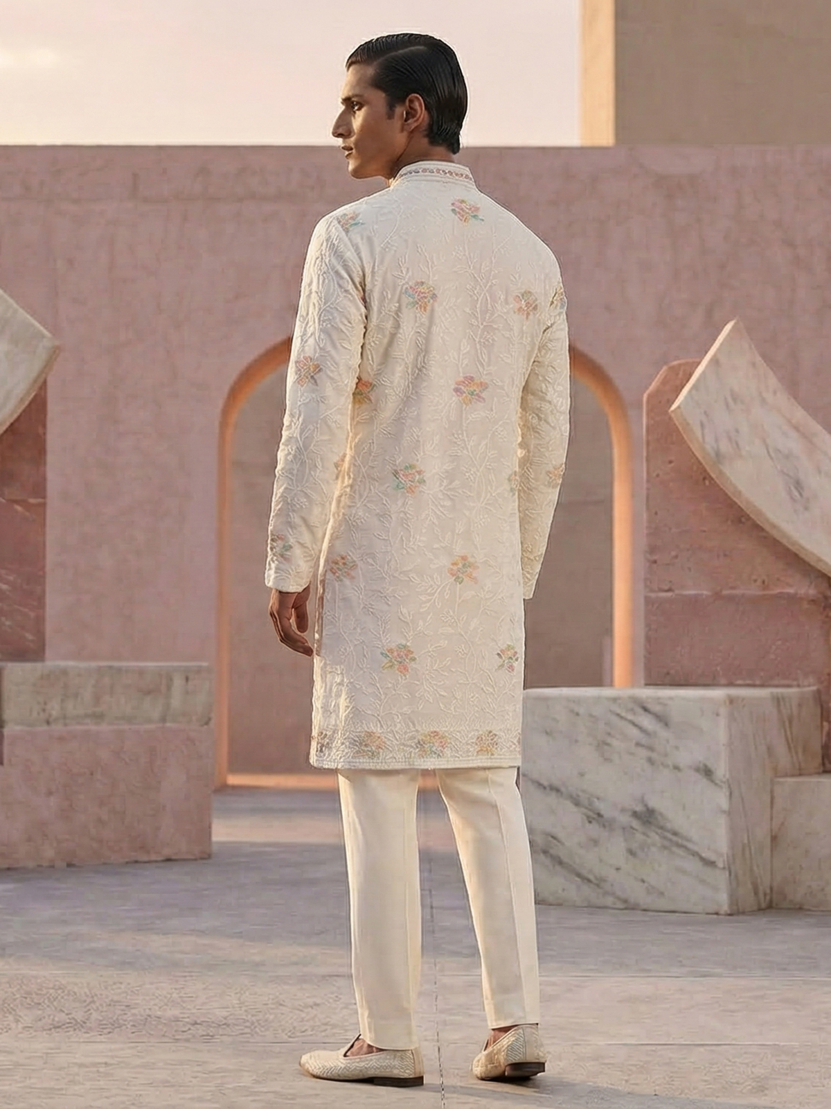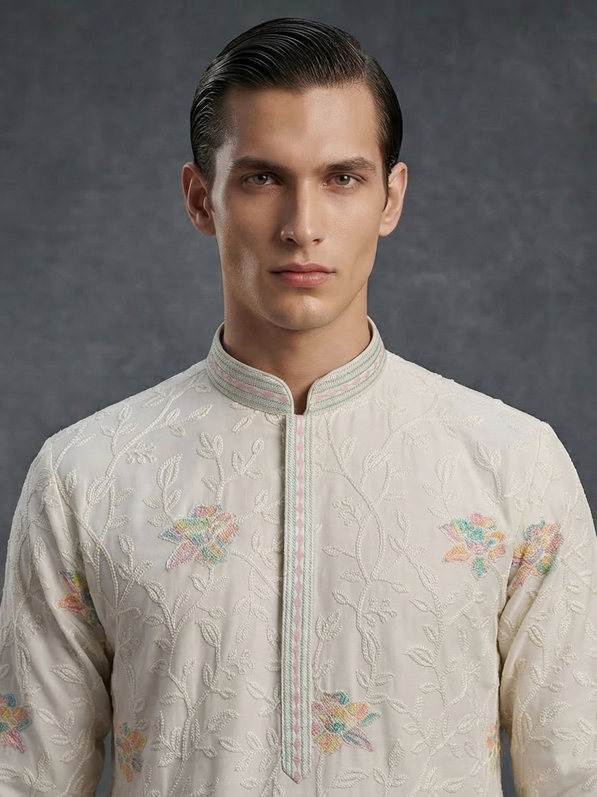 Elegant white georgette kurta suit offers timeless festive sophistication. Designed with a mandarin collar, the kurta is adorned with fine thread embroidery that adds subtle traditional detail. Paired with tailored pants, it creates a graceful ethnic look for celebrations and special occasions.