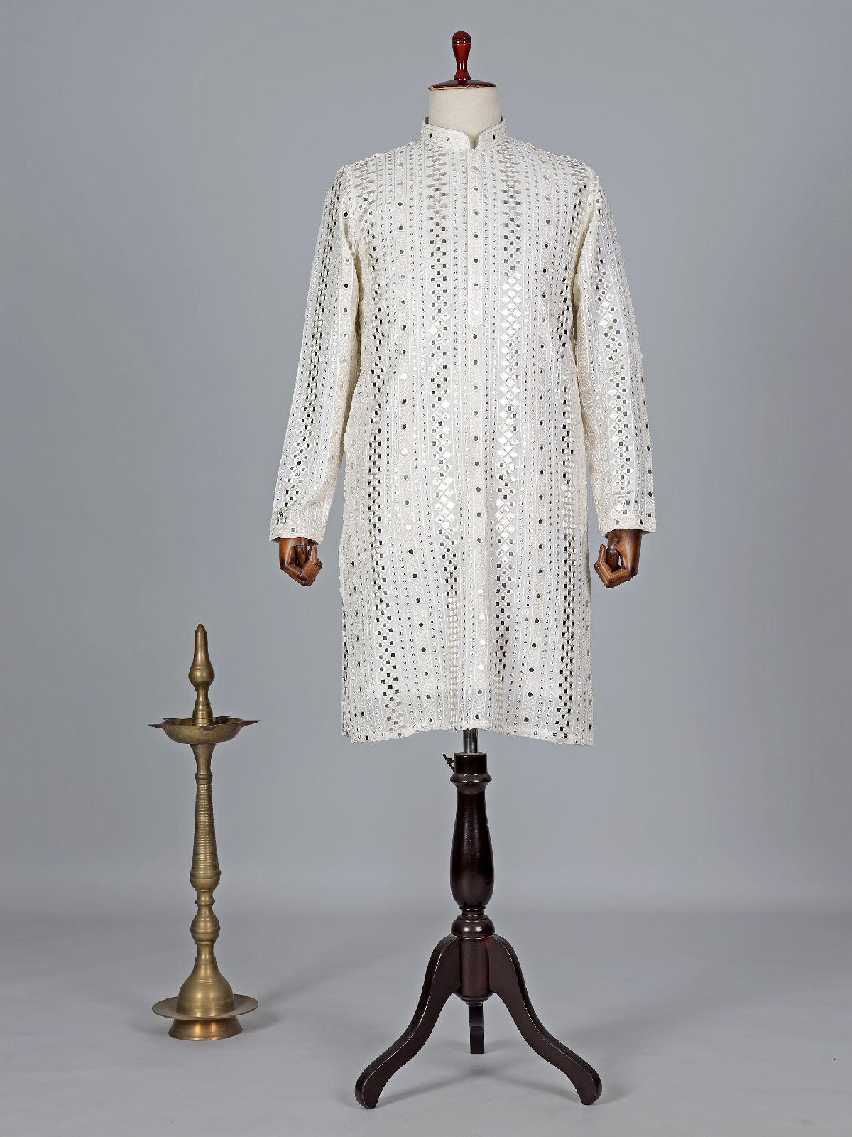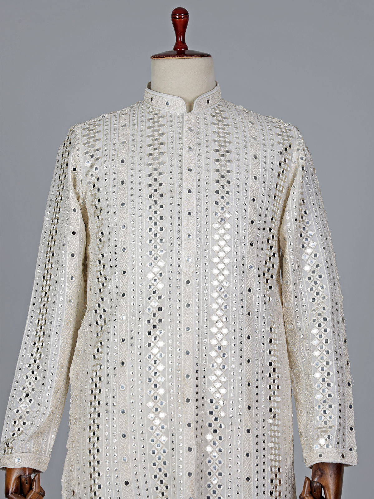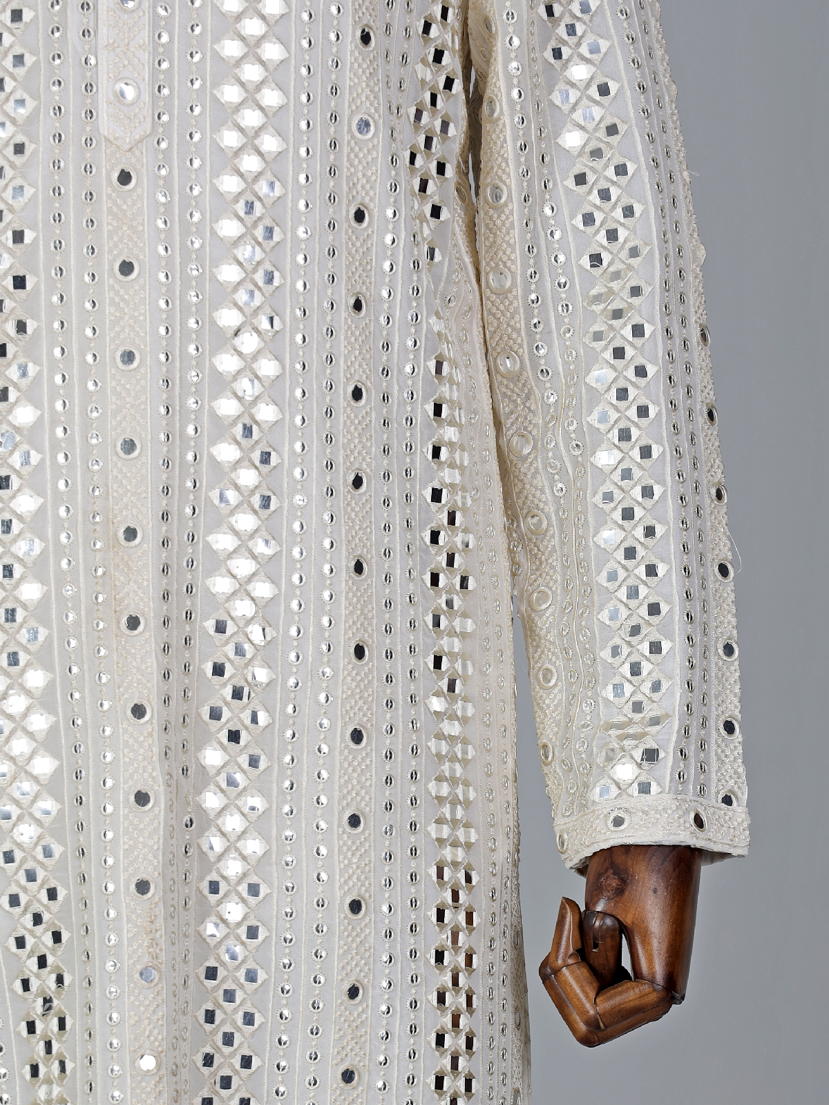 This white georgette kurta suit for weddings. Tailored in mirror, sequins and embroidery work, features a mandarin collar and full sleeves, comes with a bottom.