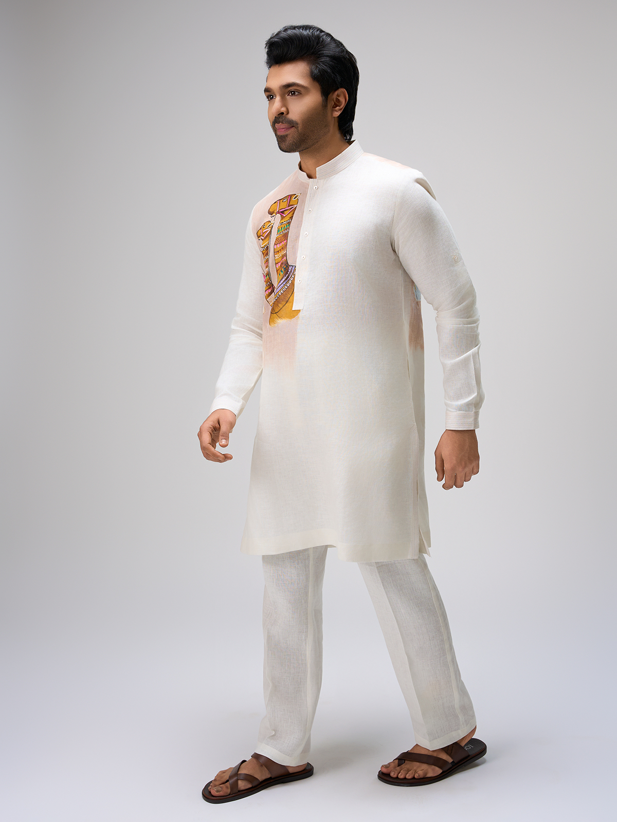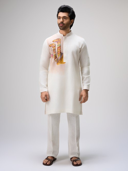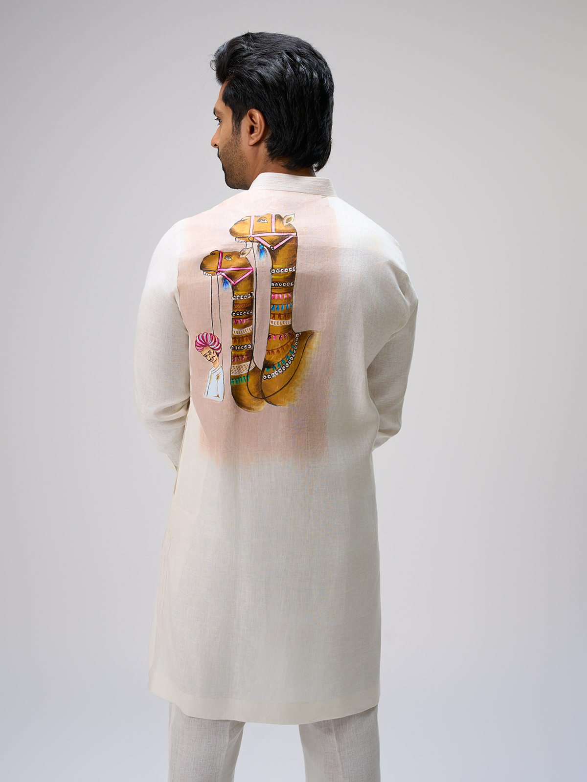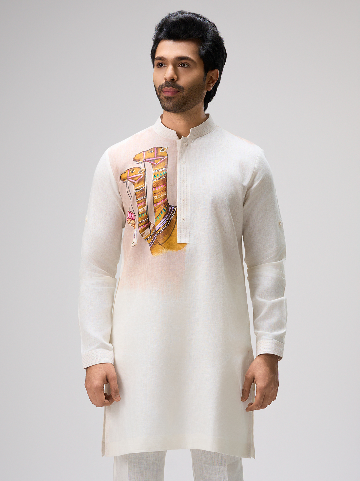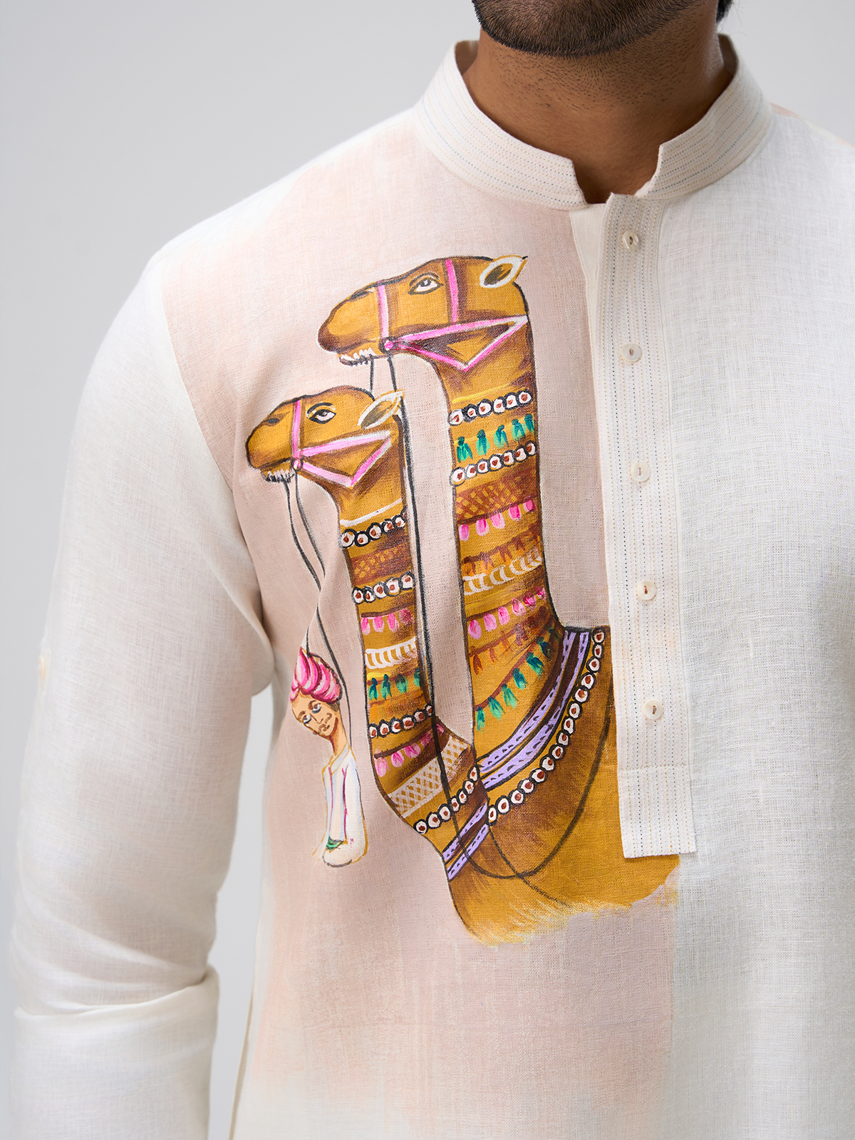 This white linen kurta with hand-painted camel artwork brings traditional storytelling charm ideal for weddings and festive gatherings. The chinese collar provides poised structure, while the pant ensures an easy yet elegant look.