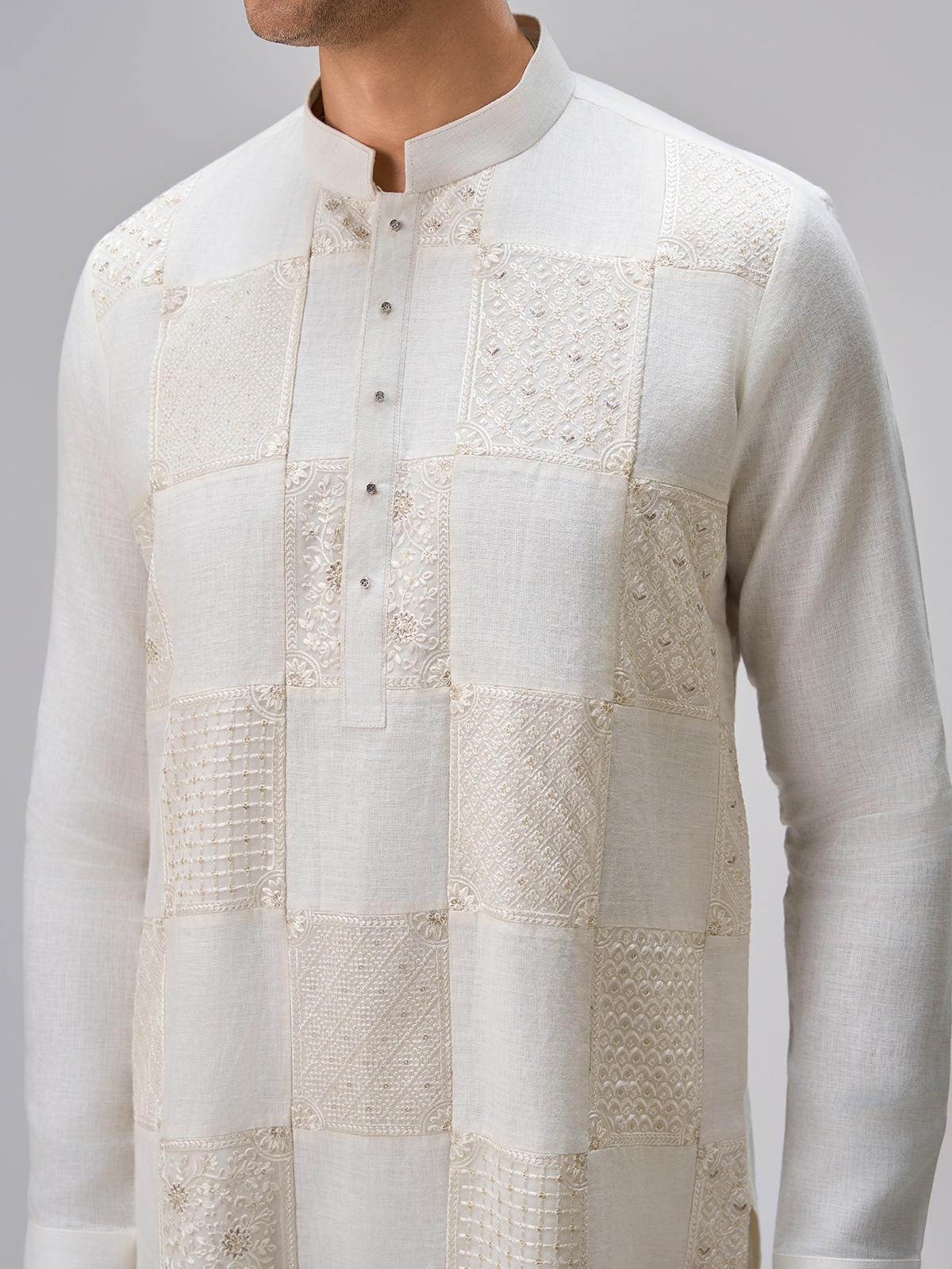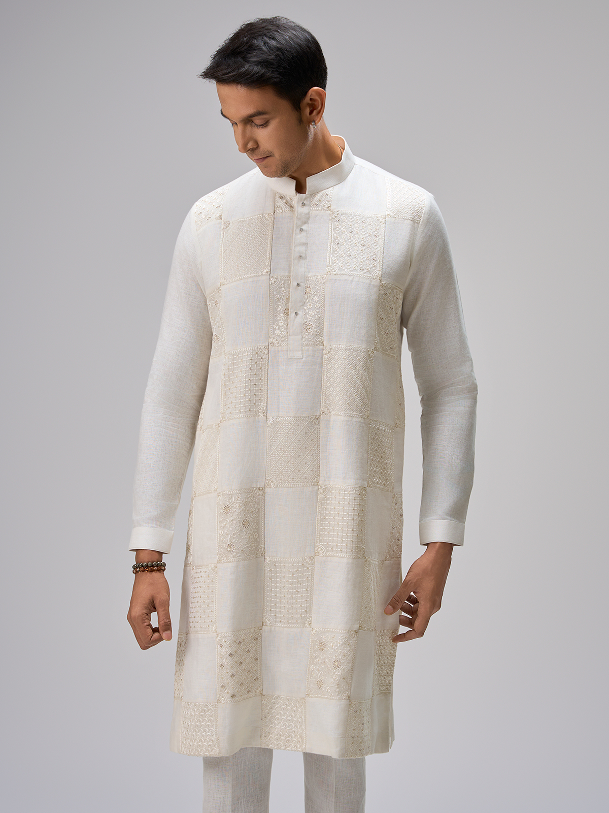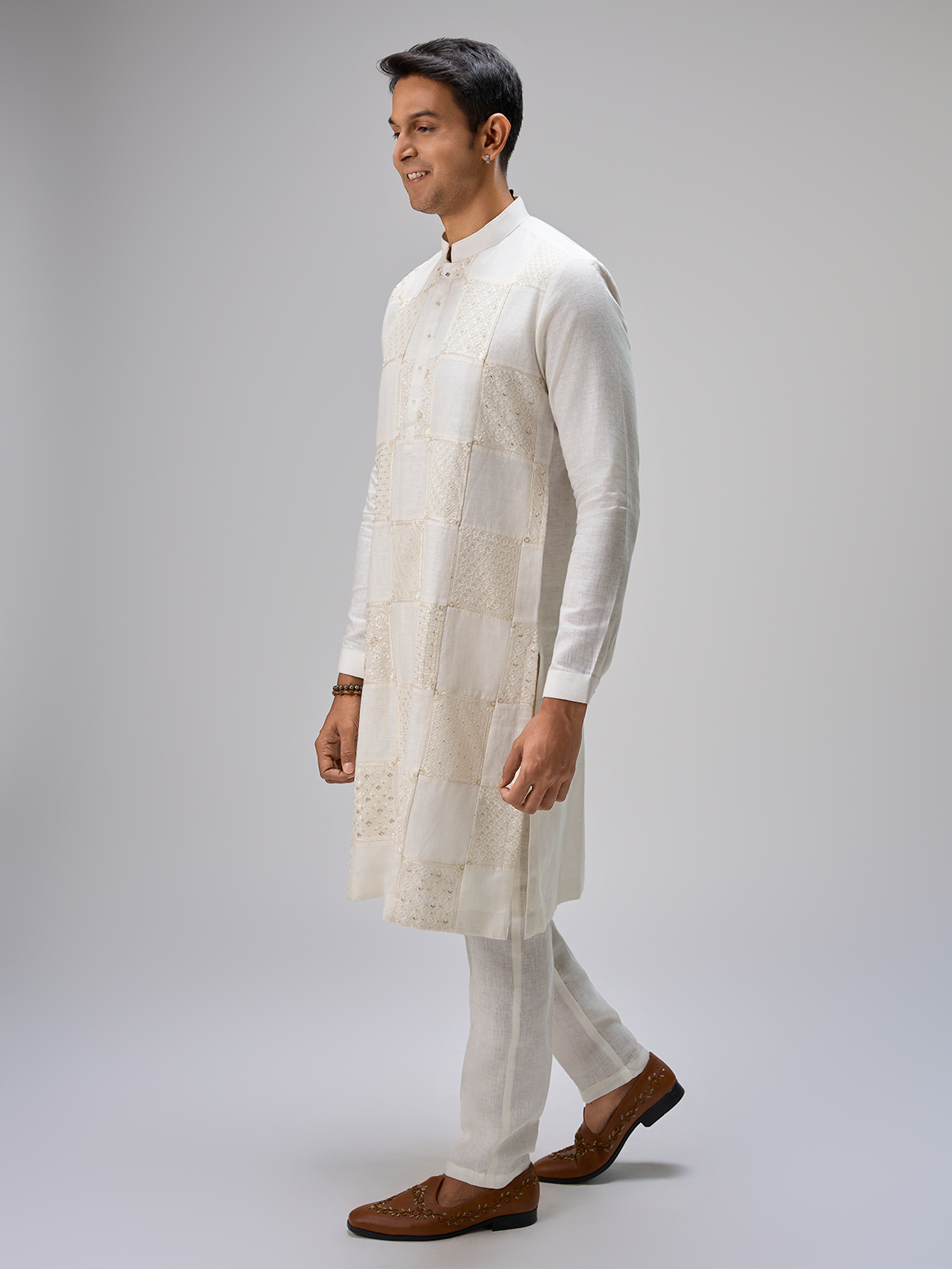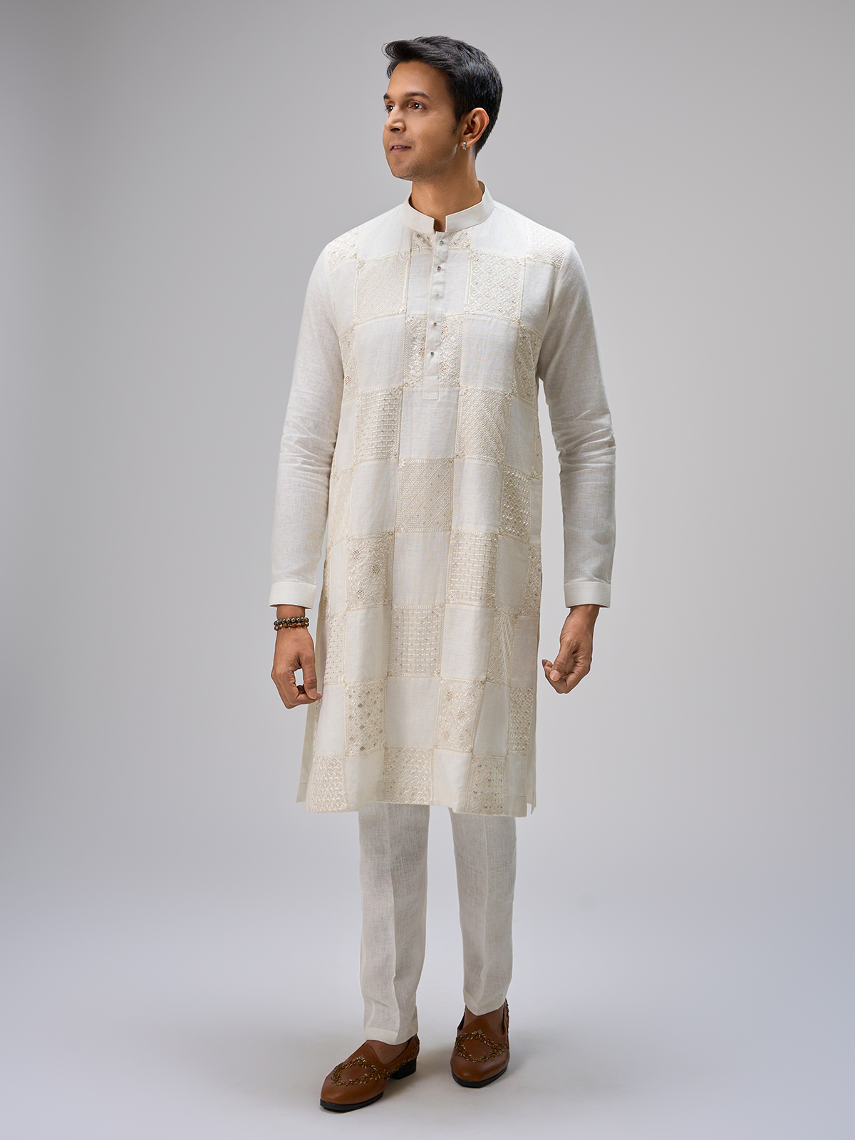 Soft white linen complements the sequins and embroidery layered across this kurta, creating a gentle celebratory shimmer ideal for receptions, weddings and festive gatherings. The chinese collar adds crisp structure, while the pant offers an effortless, polished finish.