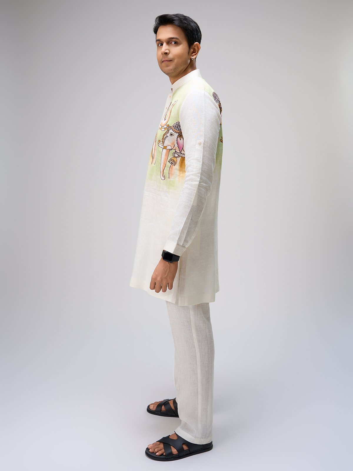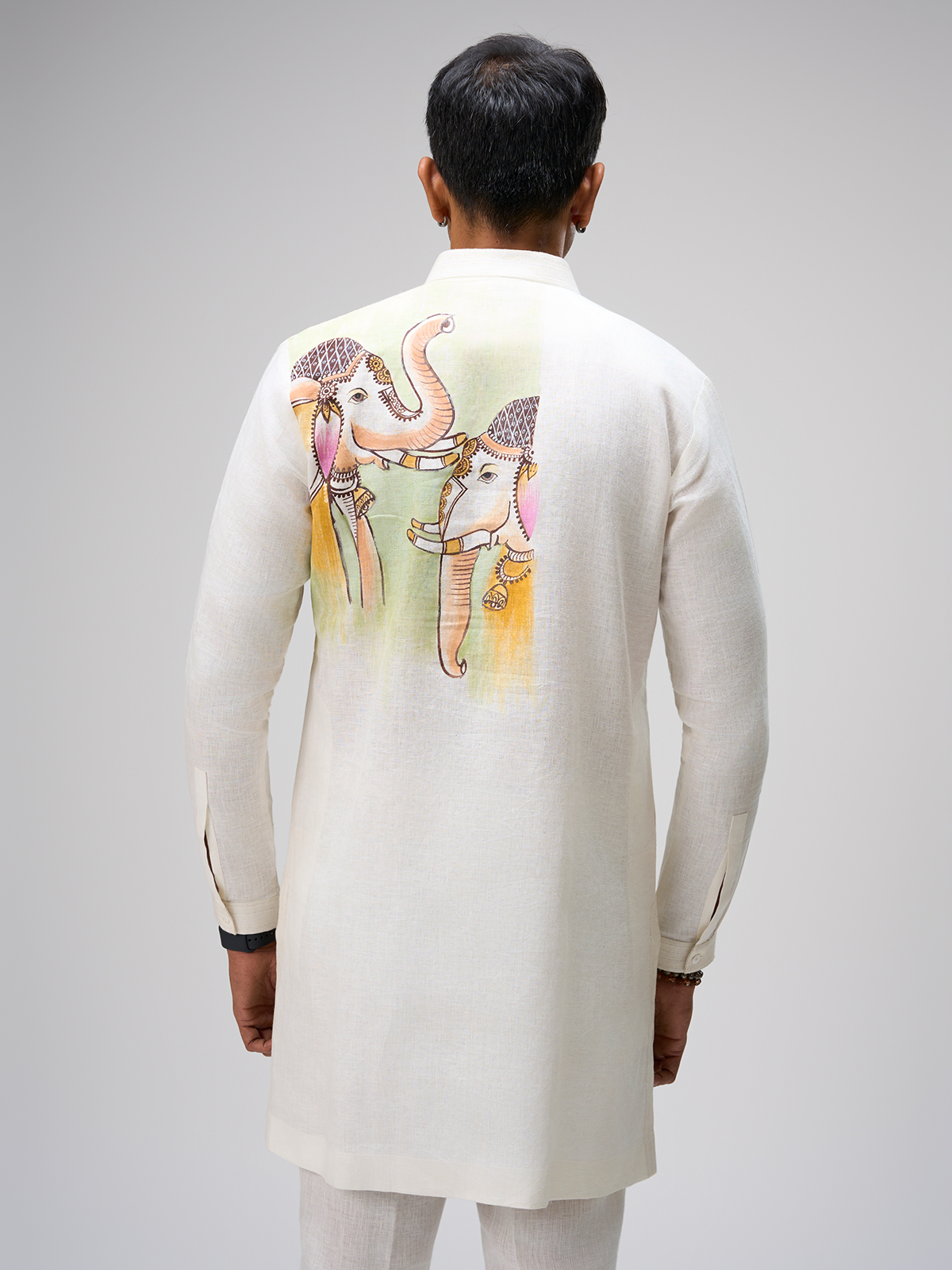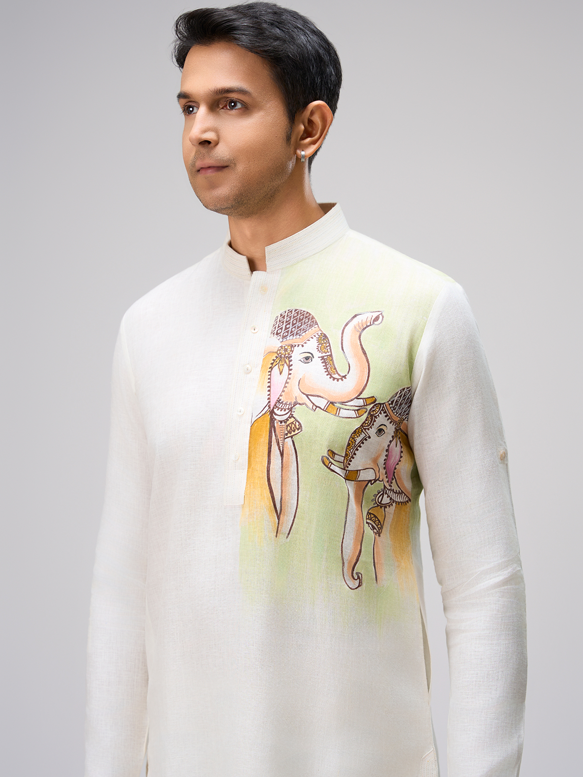 A white linen kurta adorned with elephant artwork expresses strong cultural elegance fit for festive and sangeet functions. The chinese collar adds tidy balance, and the pant enhances the composed, artistic appeal.