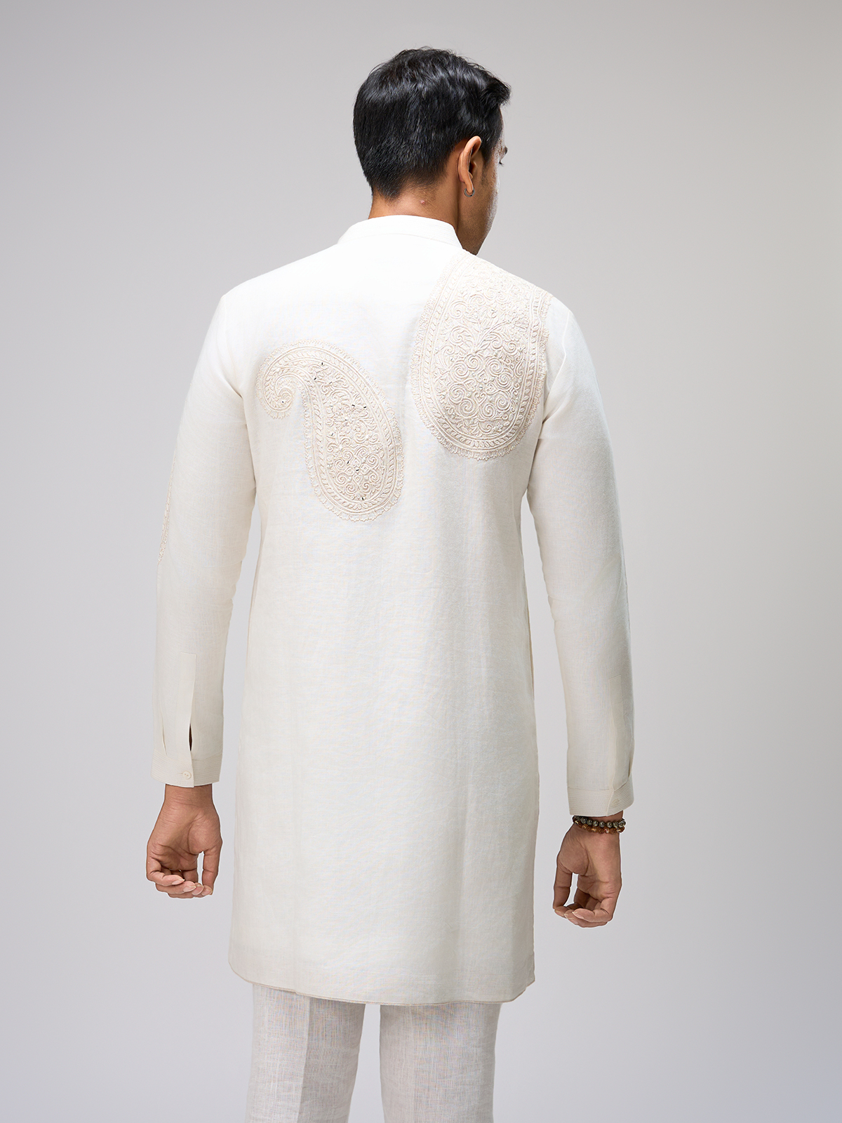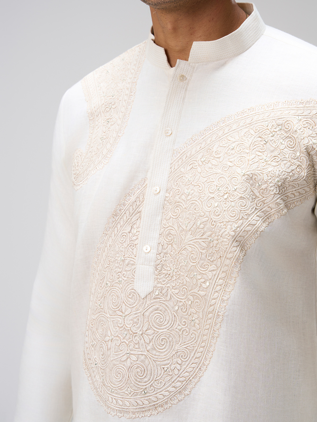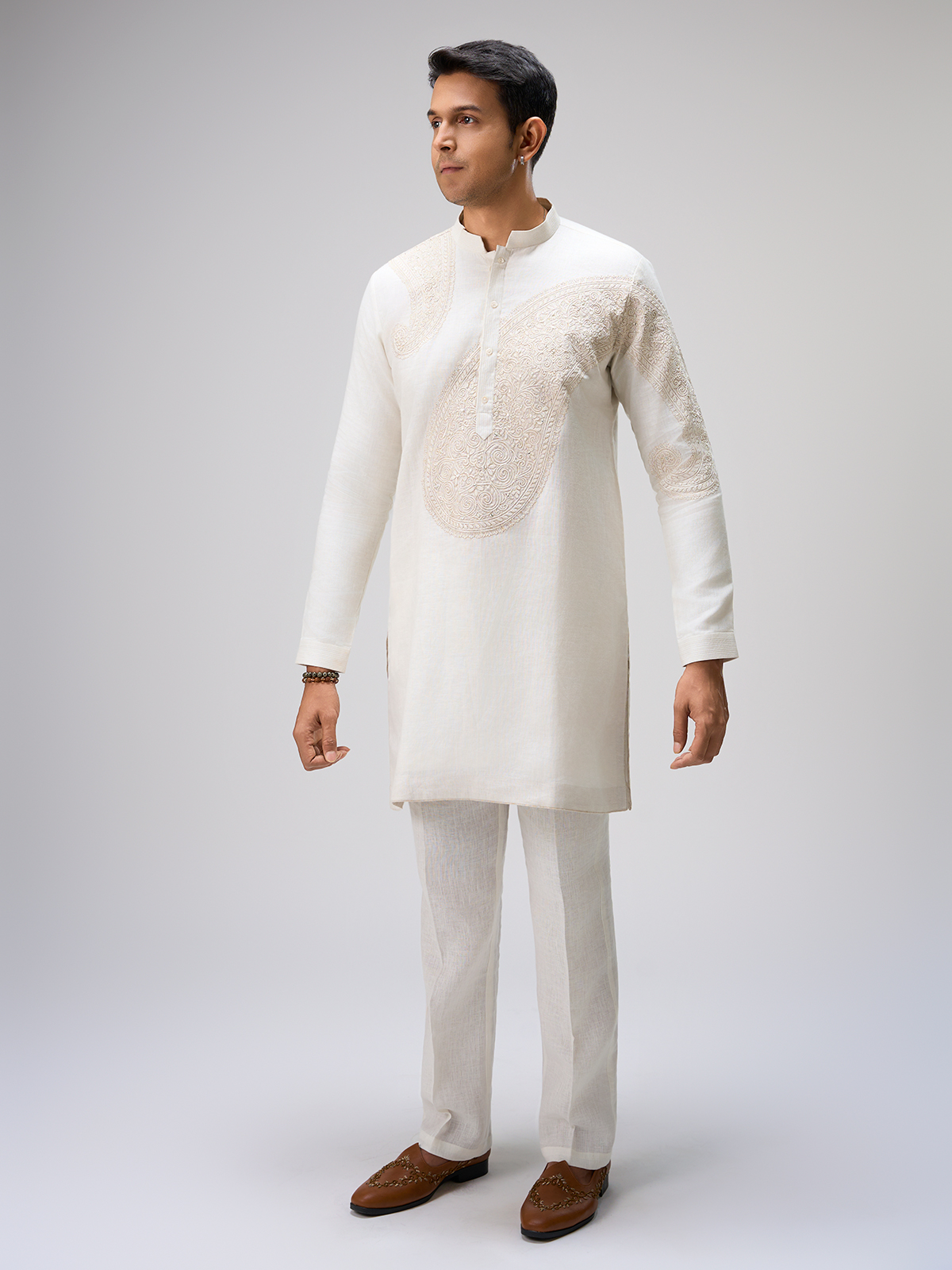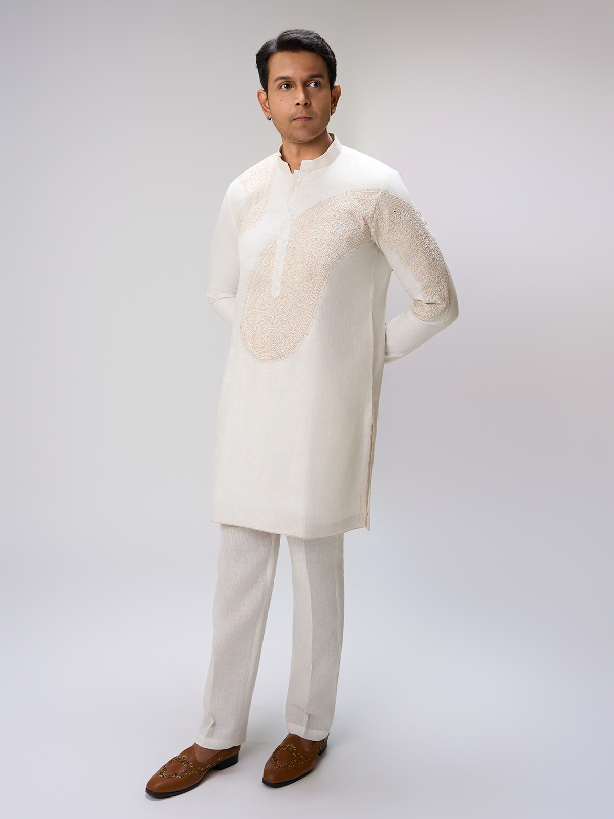 This white linen kurta carries aabla, thread and resham work that gives it a serene festive appeal. The chinese collar ensures a well-defined look perfect for receptions and celebrations. With the pant, it offers refined ease and versatility.