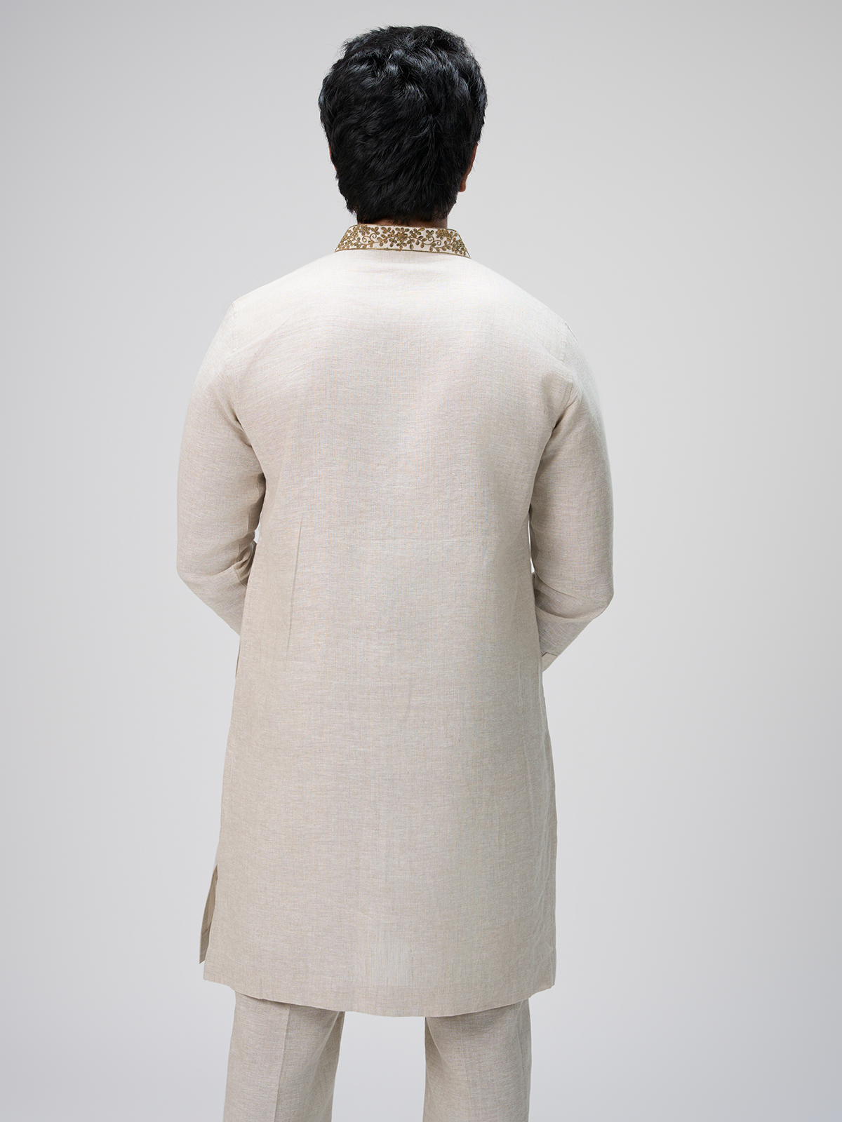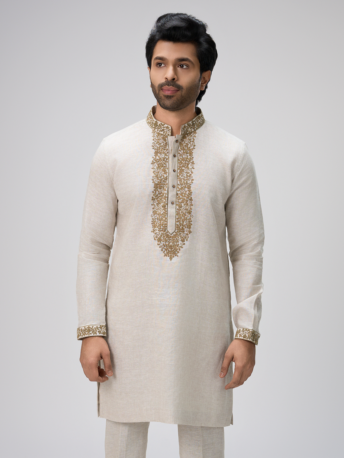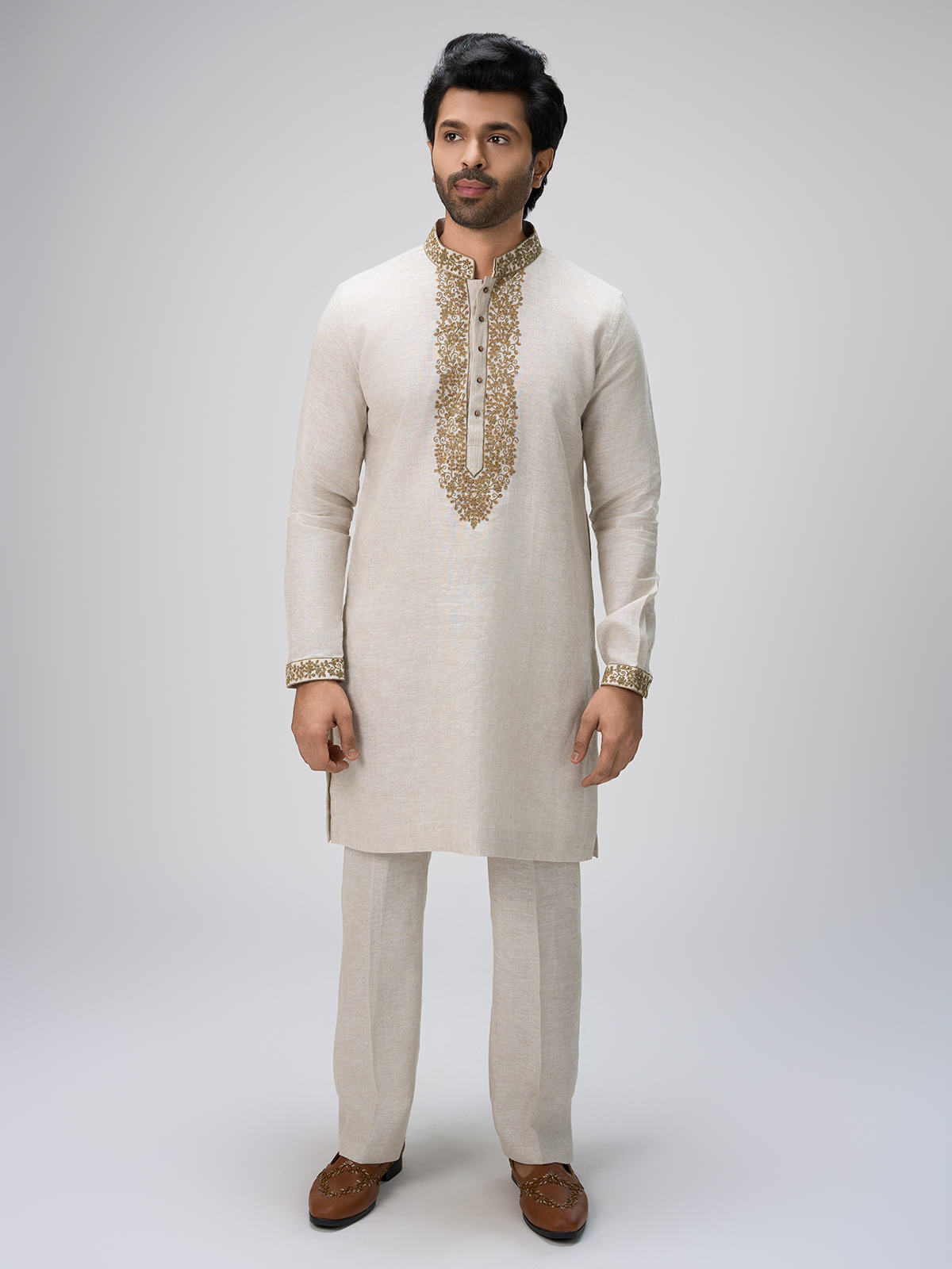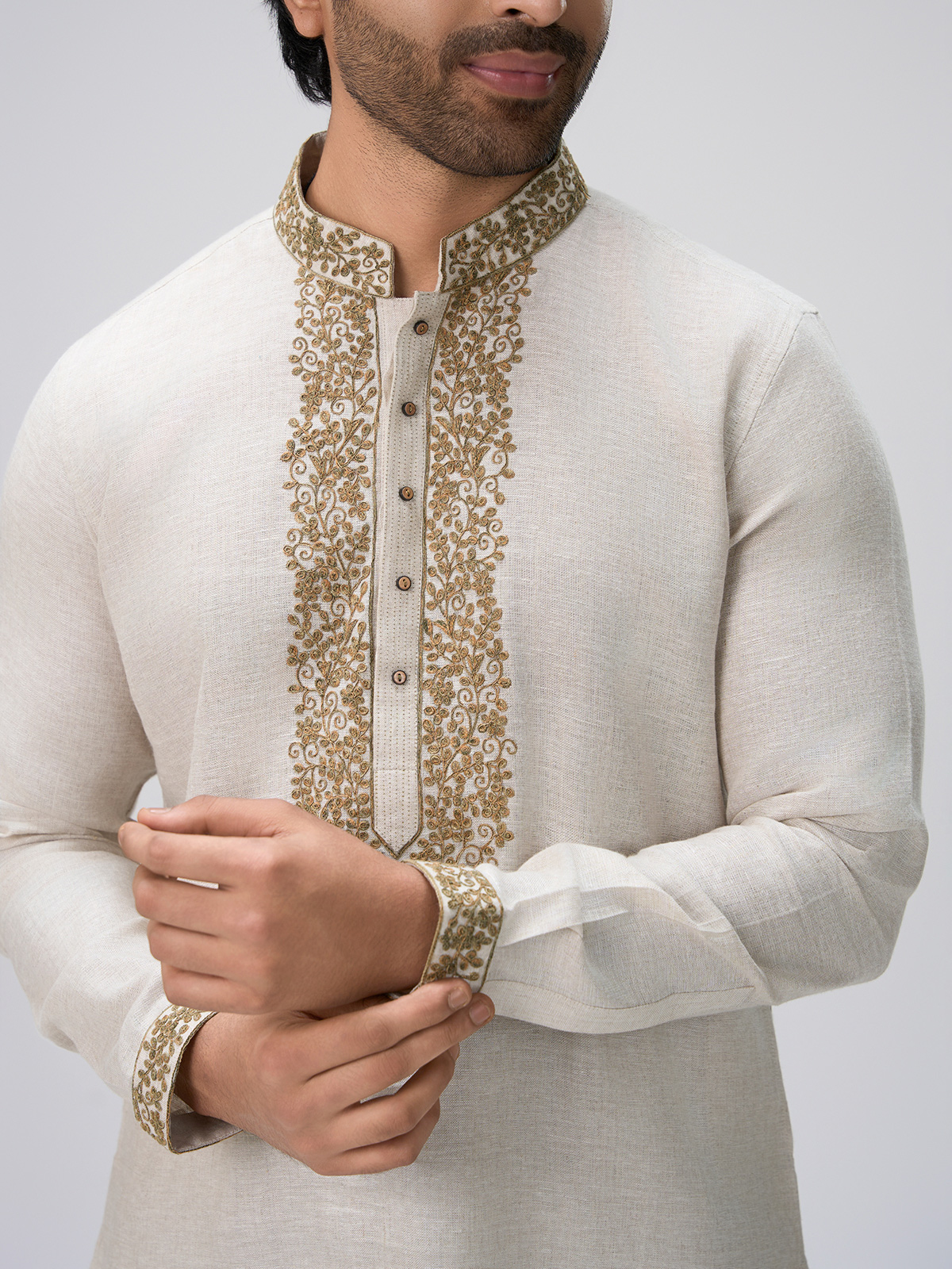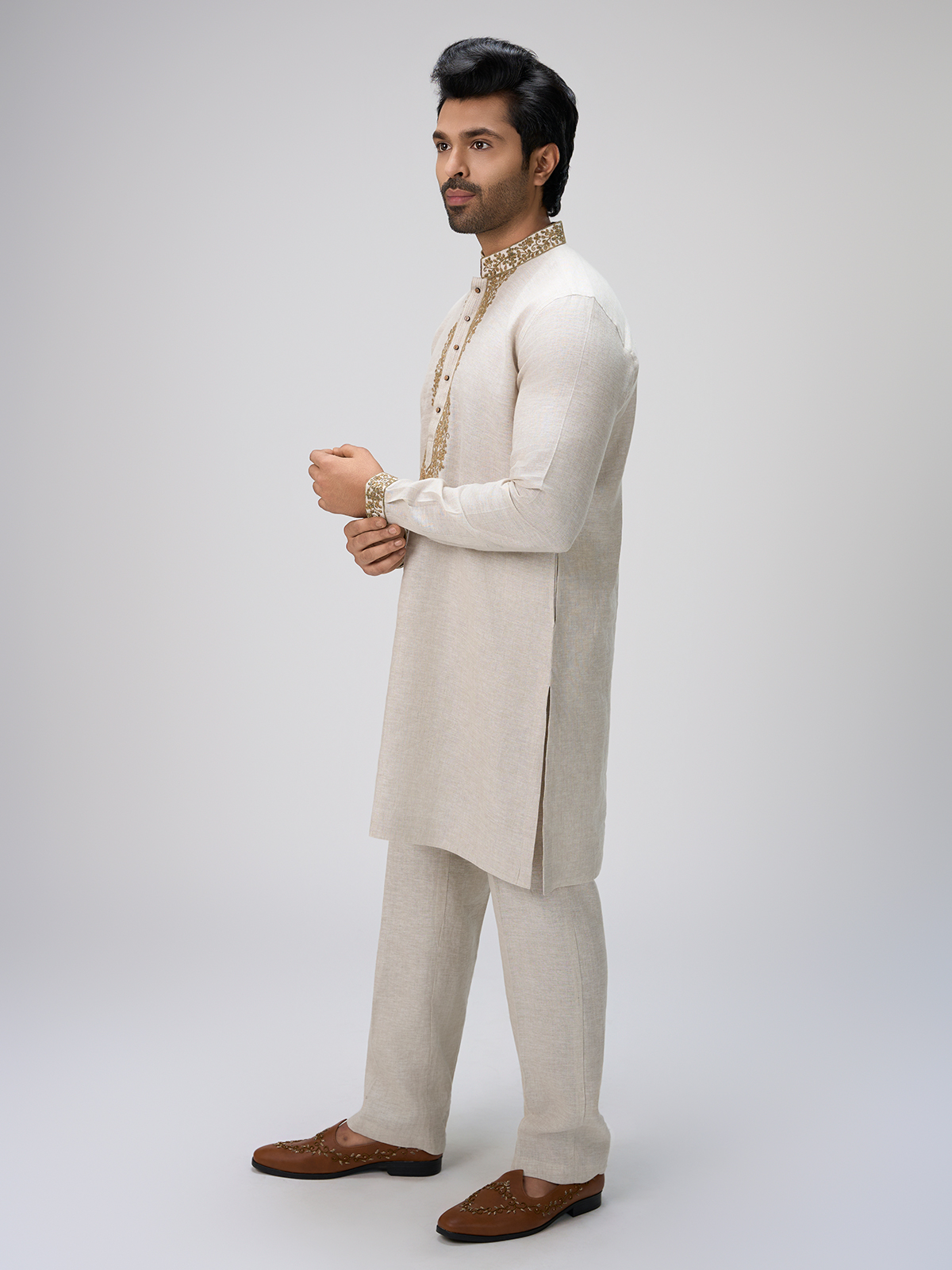 This white linen kurta detailed with soft thread work offers subtle festive refinement suitable for sangeet and celebrations. The chinese collar adds modern clarity, and the pant ensures smooth comfort.