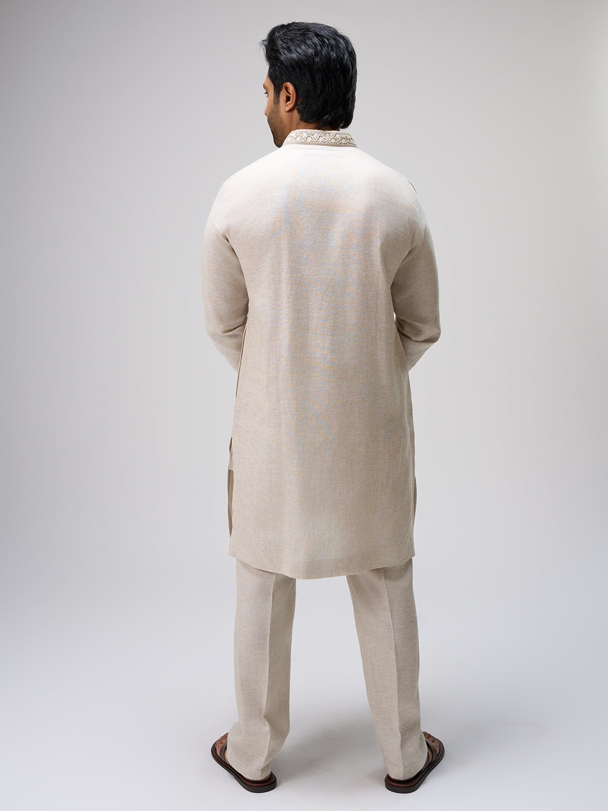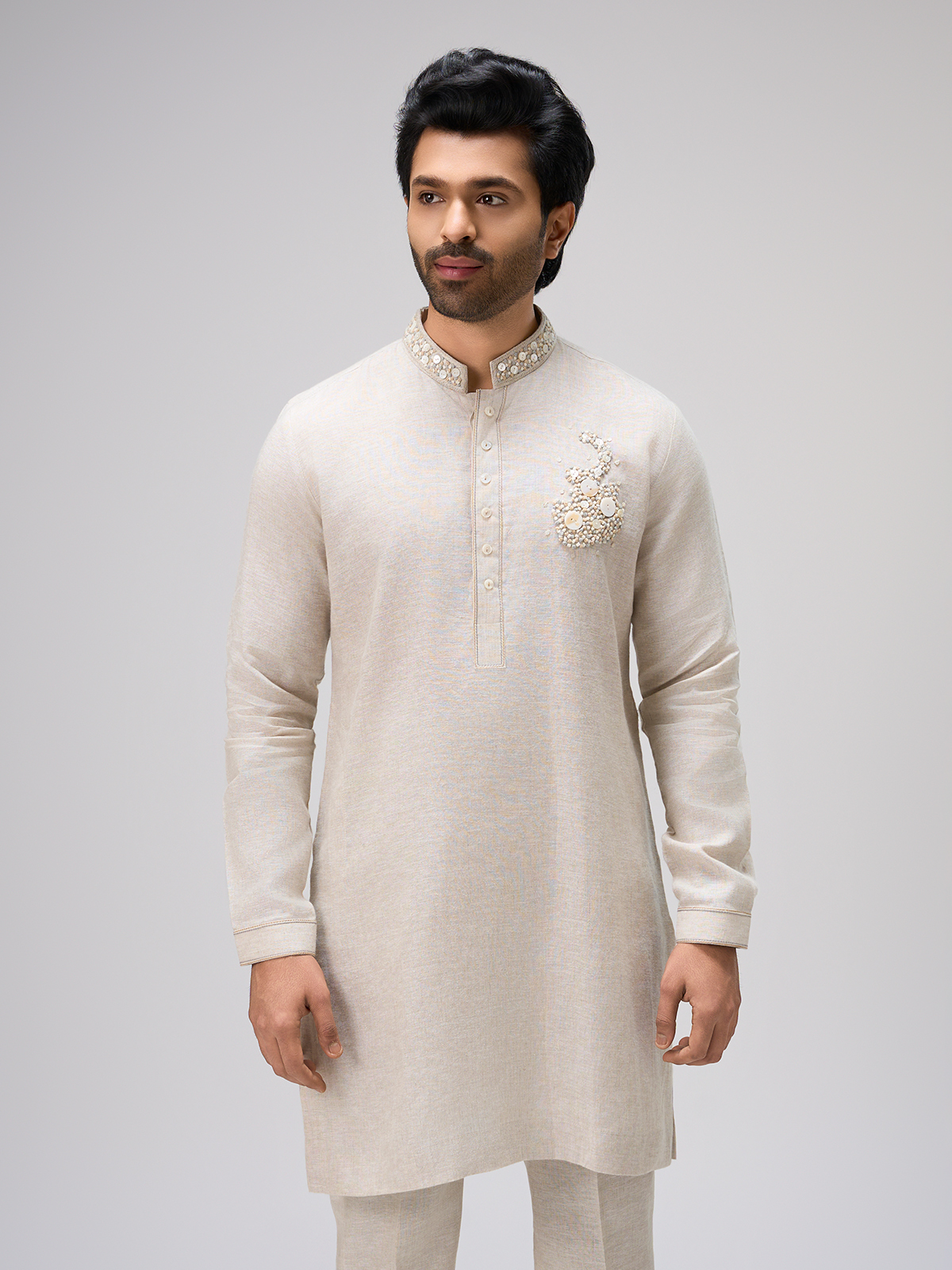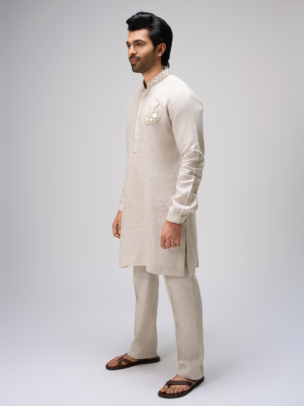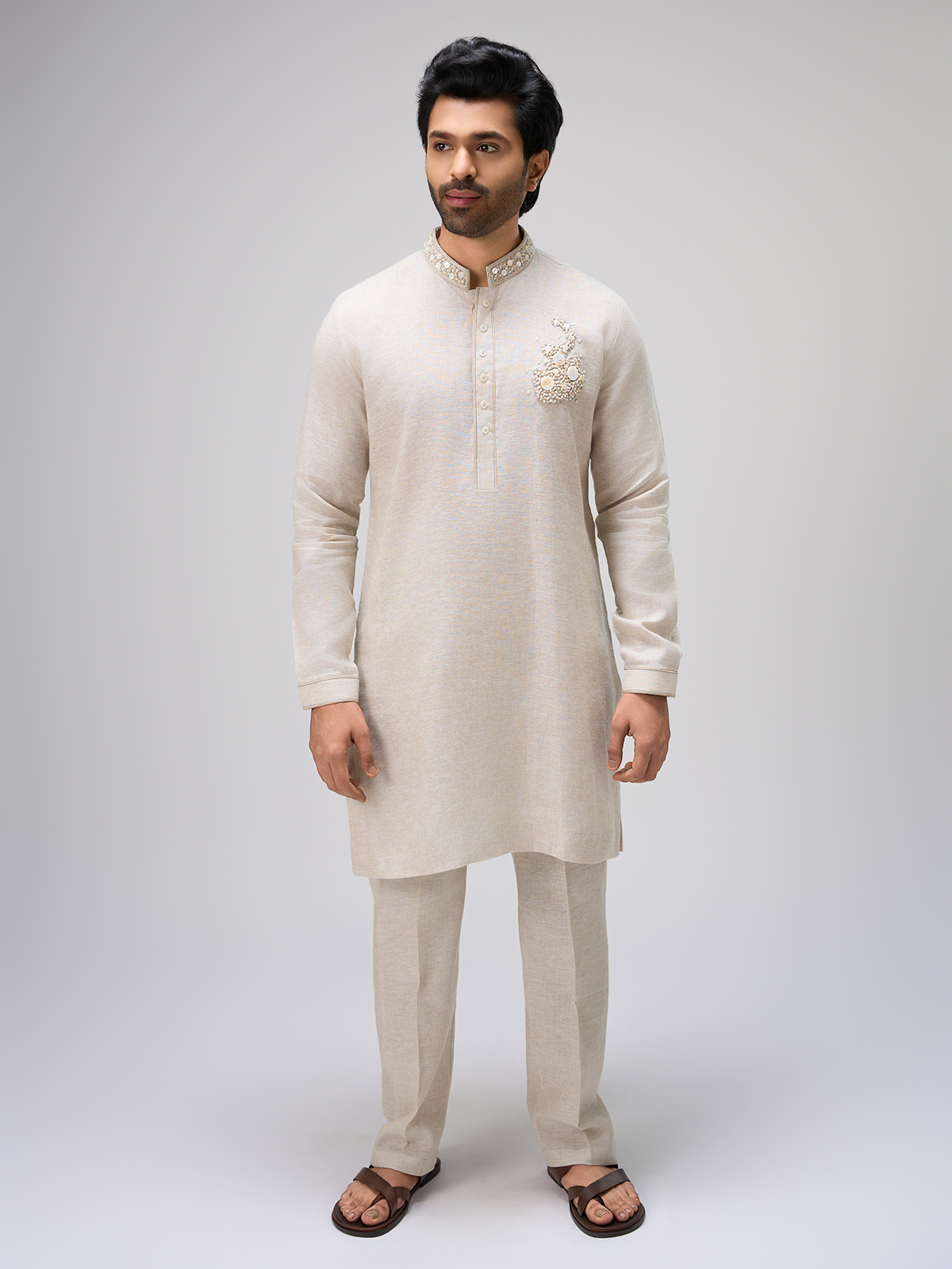 This white linen kurta decorated with beads, thread, buttons and embroidery creates a tasteful festive texture suited for sangeet and cultural gatherings. The chinese collar brings polished definition, and the pant completes the look with comfort.