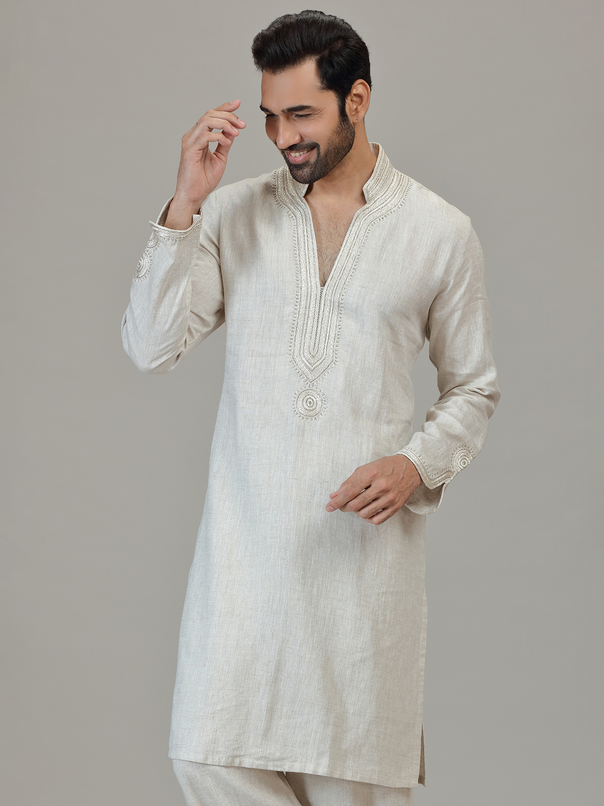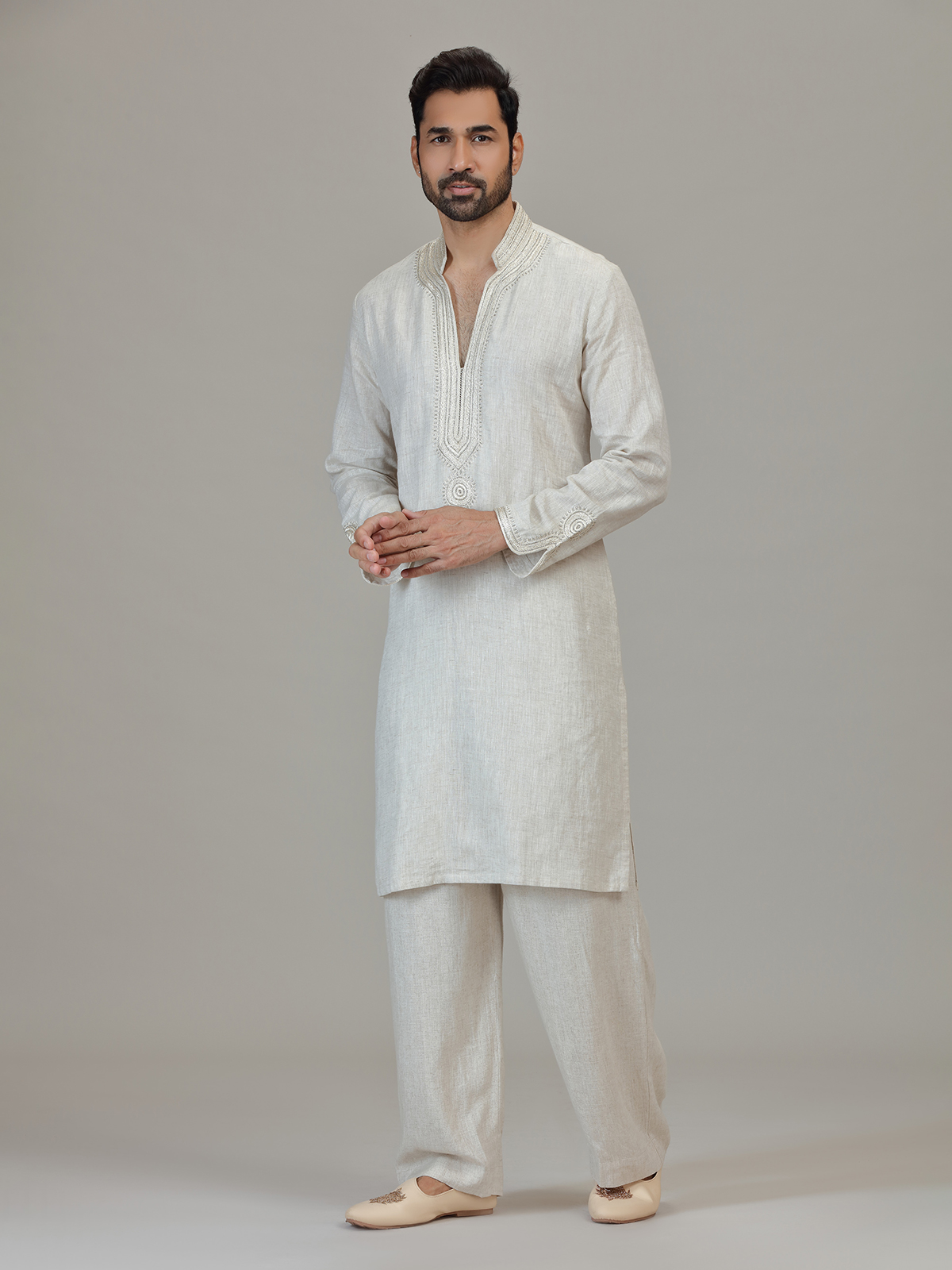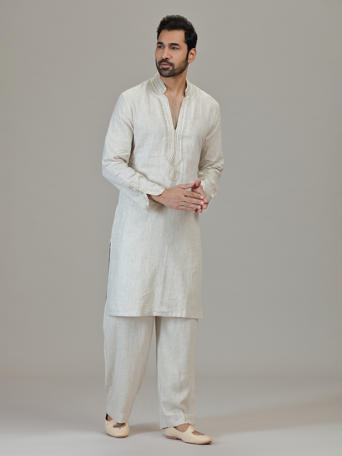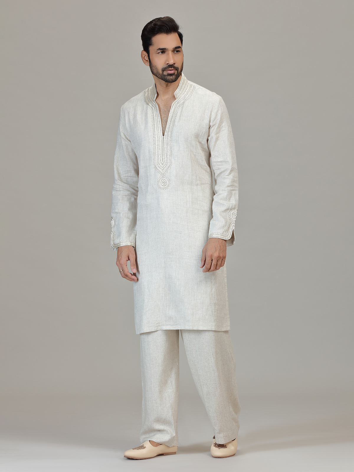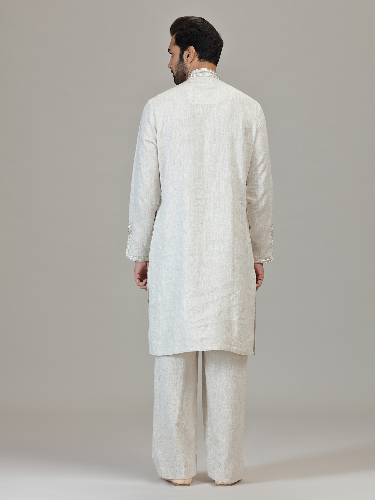 Designed in white linen, this piece highlights cutdana and embroidery craftsmanship. The mandarin collar, distinctive bell sleeves and straight-fit pants enhance its unique festive silhouette. Perfect for wedding and sangeet gatherings with sophisticated presence.