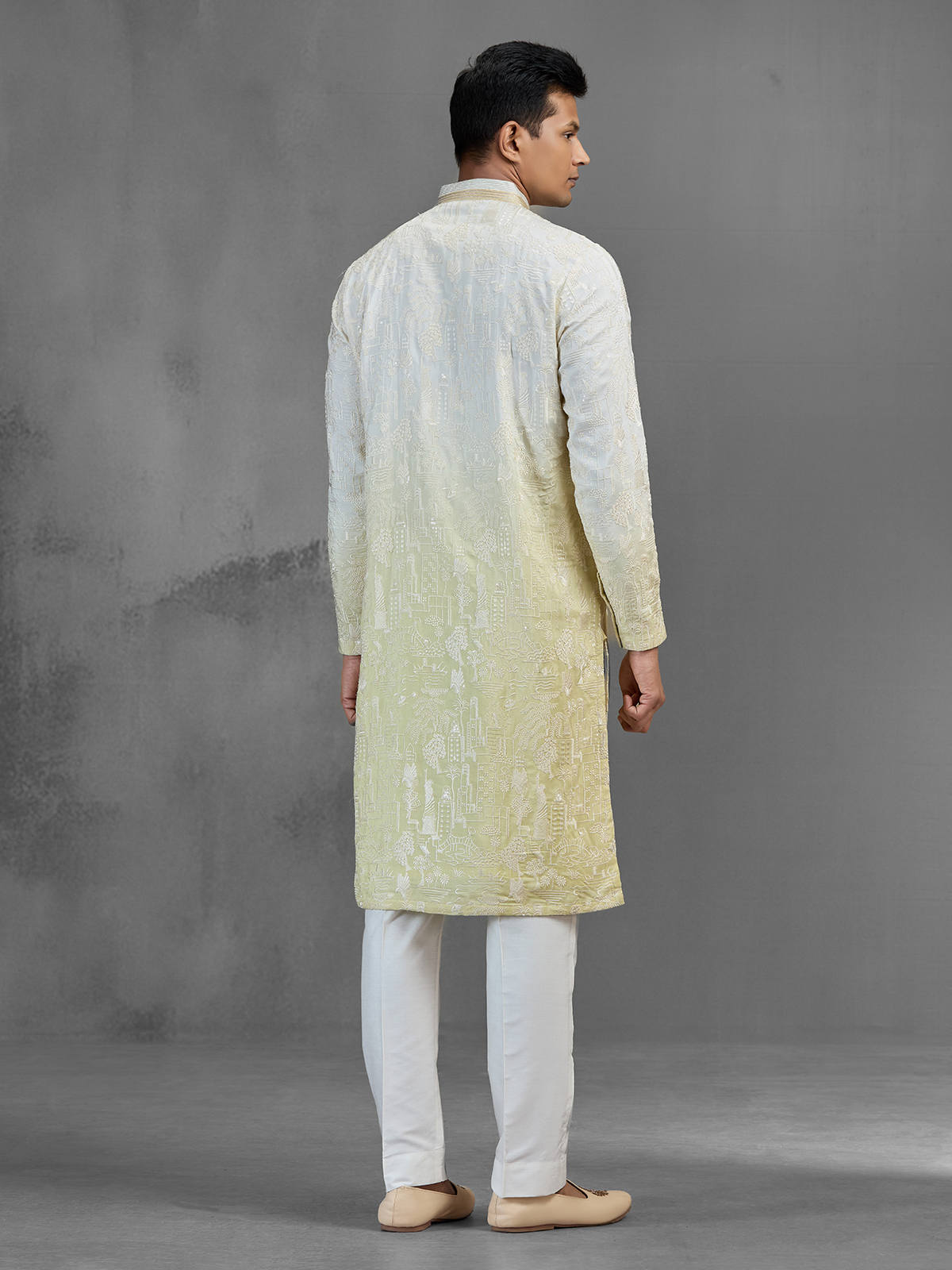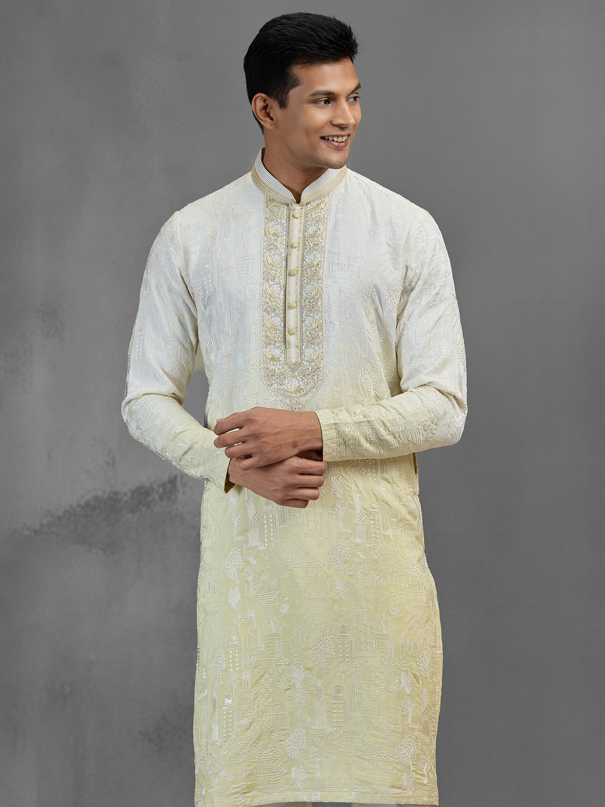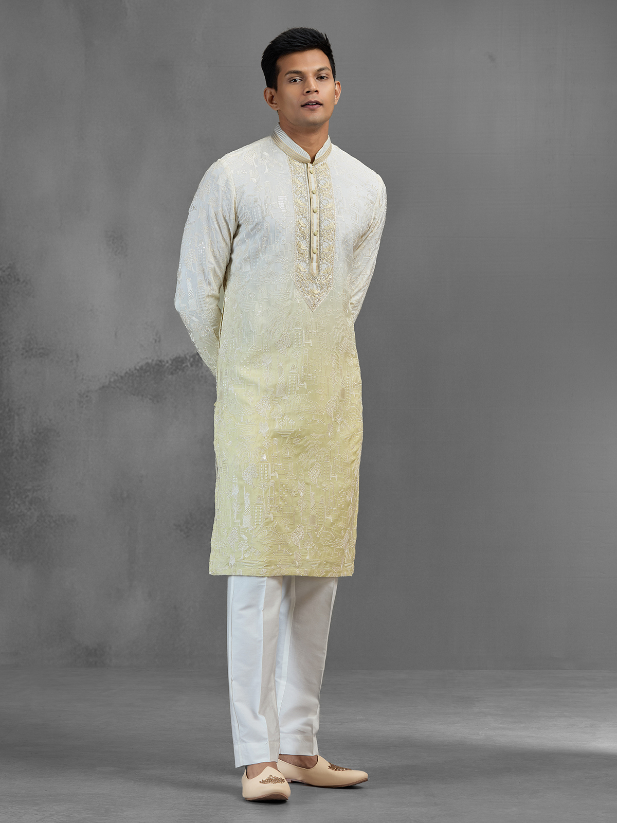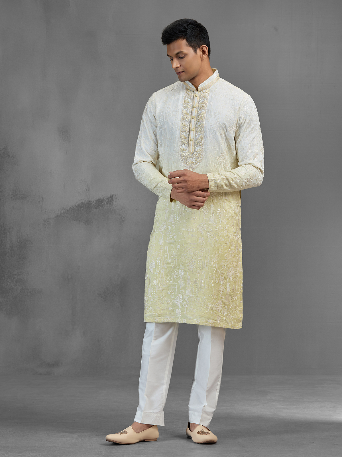 Radiating subtle luxury, this white silk kurta suit is adorned with cutdana, beads, and thread embroidery in soft shaded tones. The delicate embellishments enhance the neckline and placket, creating a refined festive look. Designed with a chinese collar and full sleeves, it pairs perfectly with pants for celebrations.