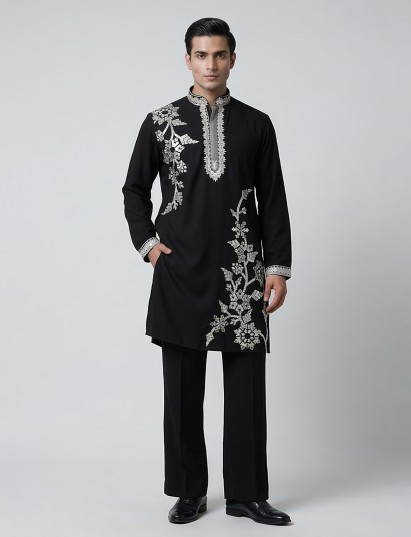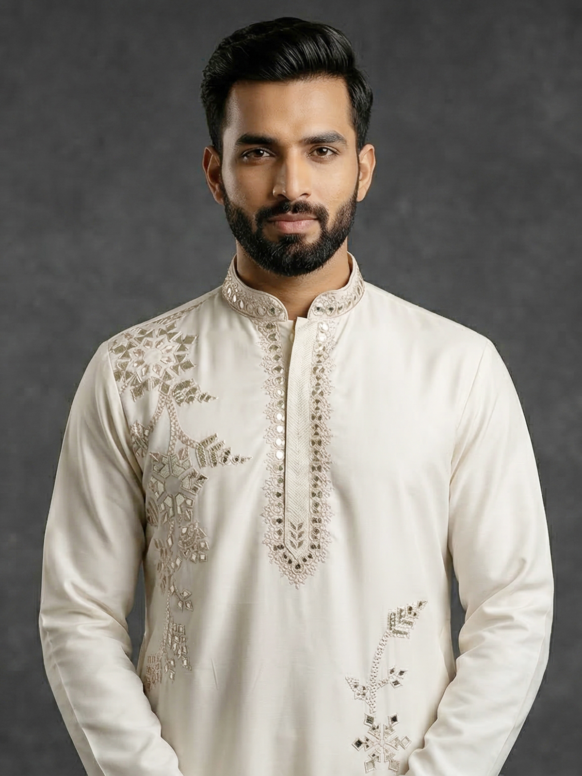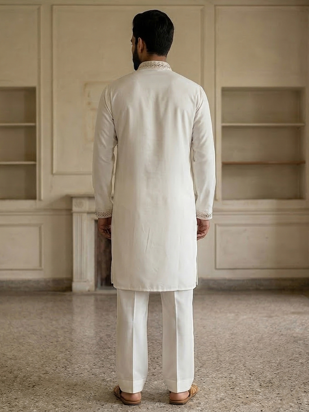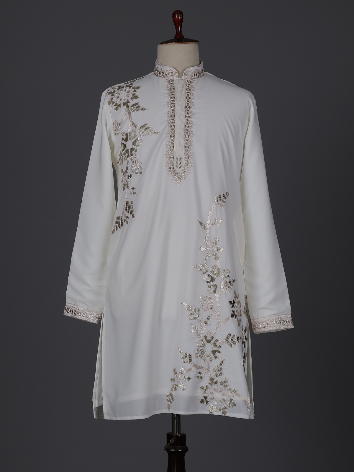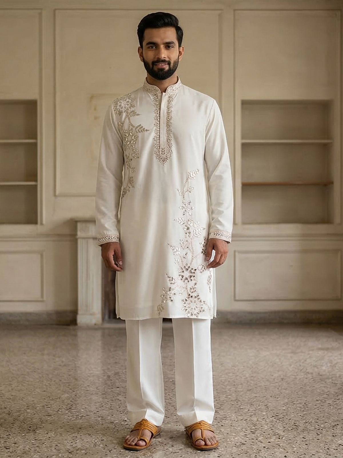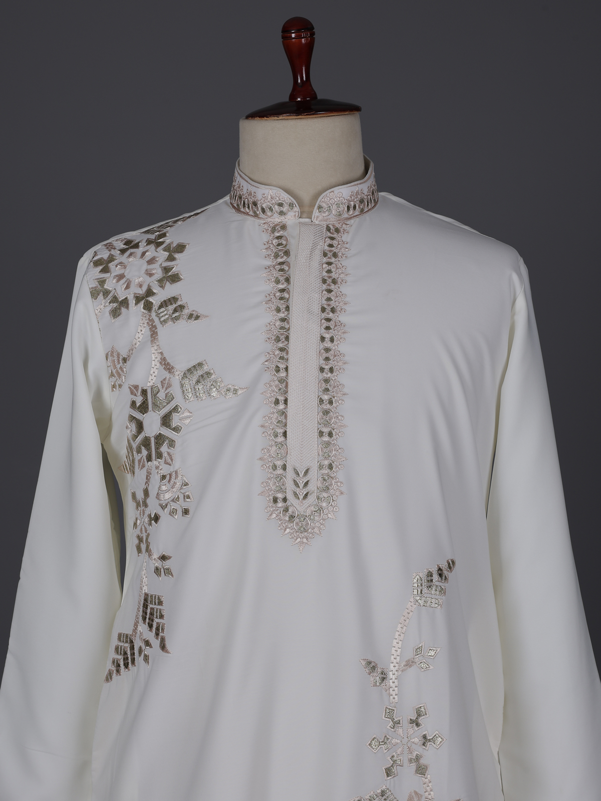 Classic white elegance enhances the charm of this silk kurta suit crafted for festive occasions. Designed with a refined mandarin collar, the kurta is beautifully adorned with delicate embroidery and traditional gota work that adds graceful festive shimmer. Paired with tailored pants. The ensemble forms a sophisticated ethnic silhouette perfect for eid celebrations and cultural gatherings.