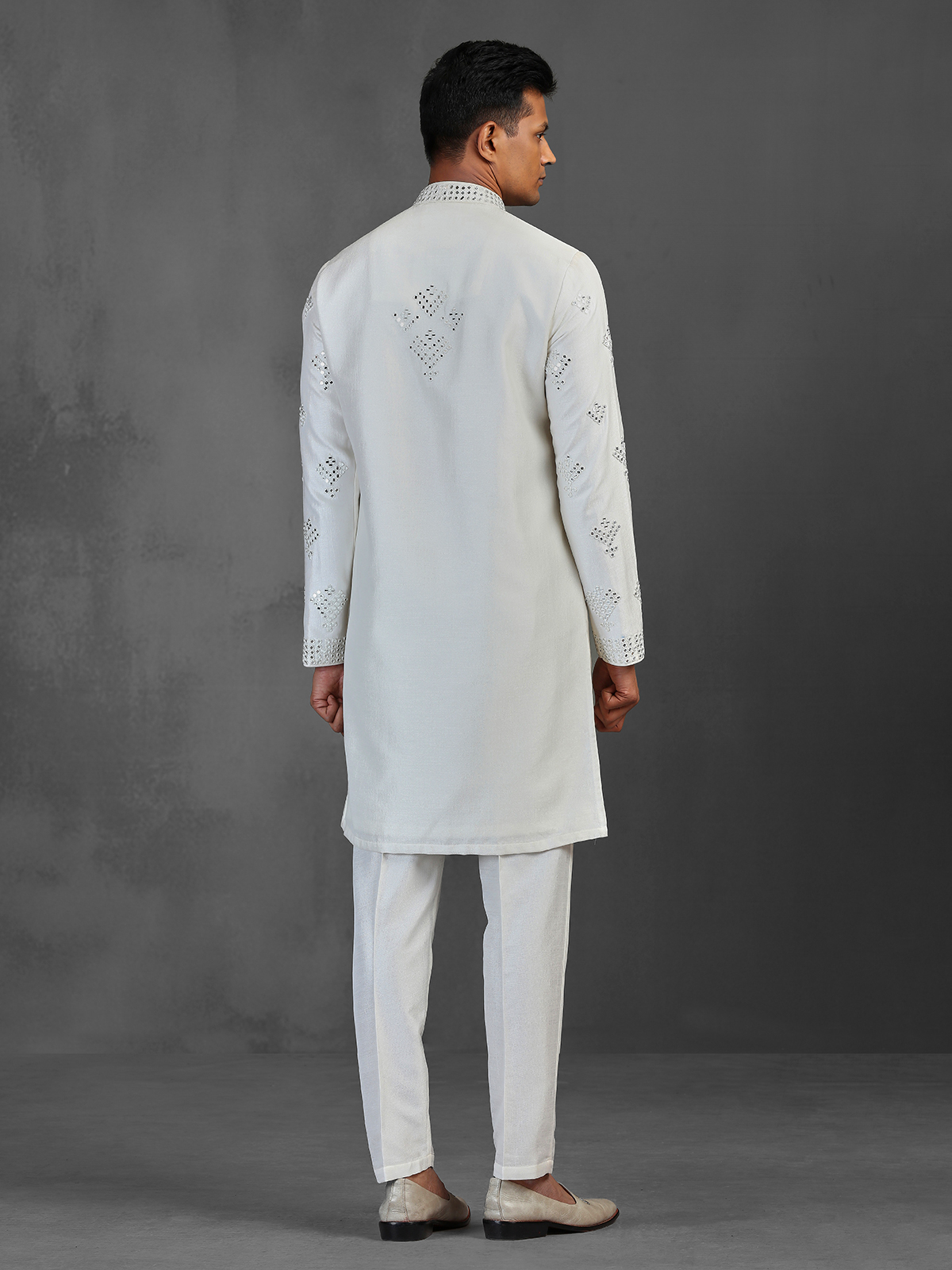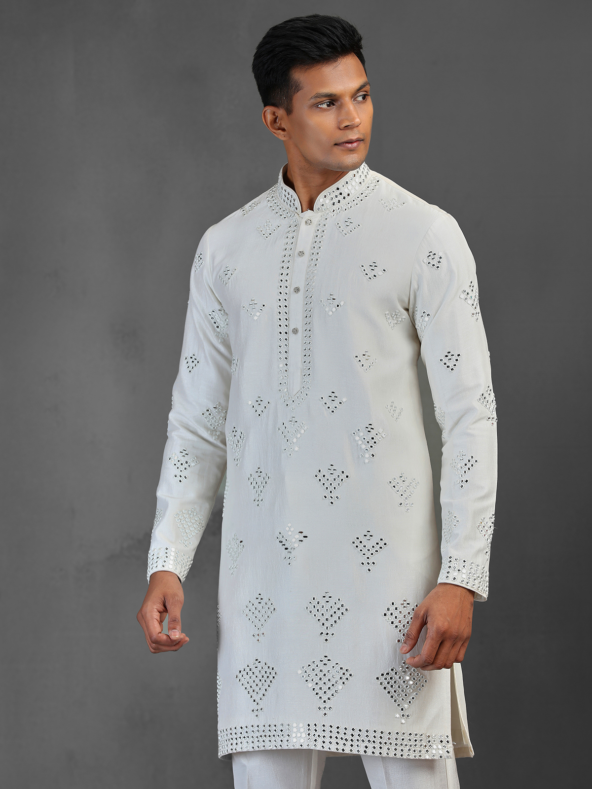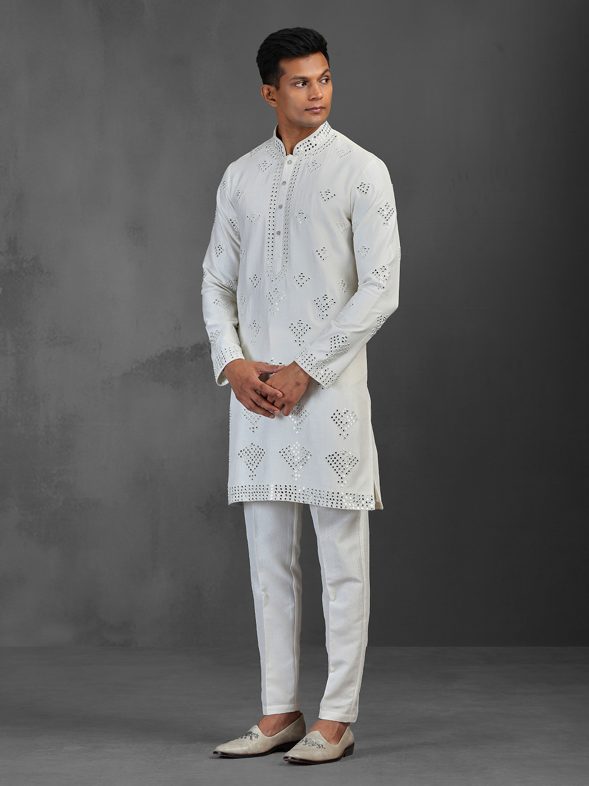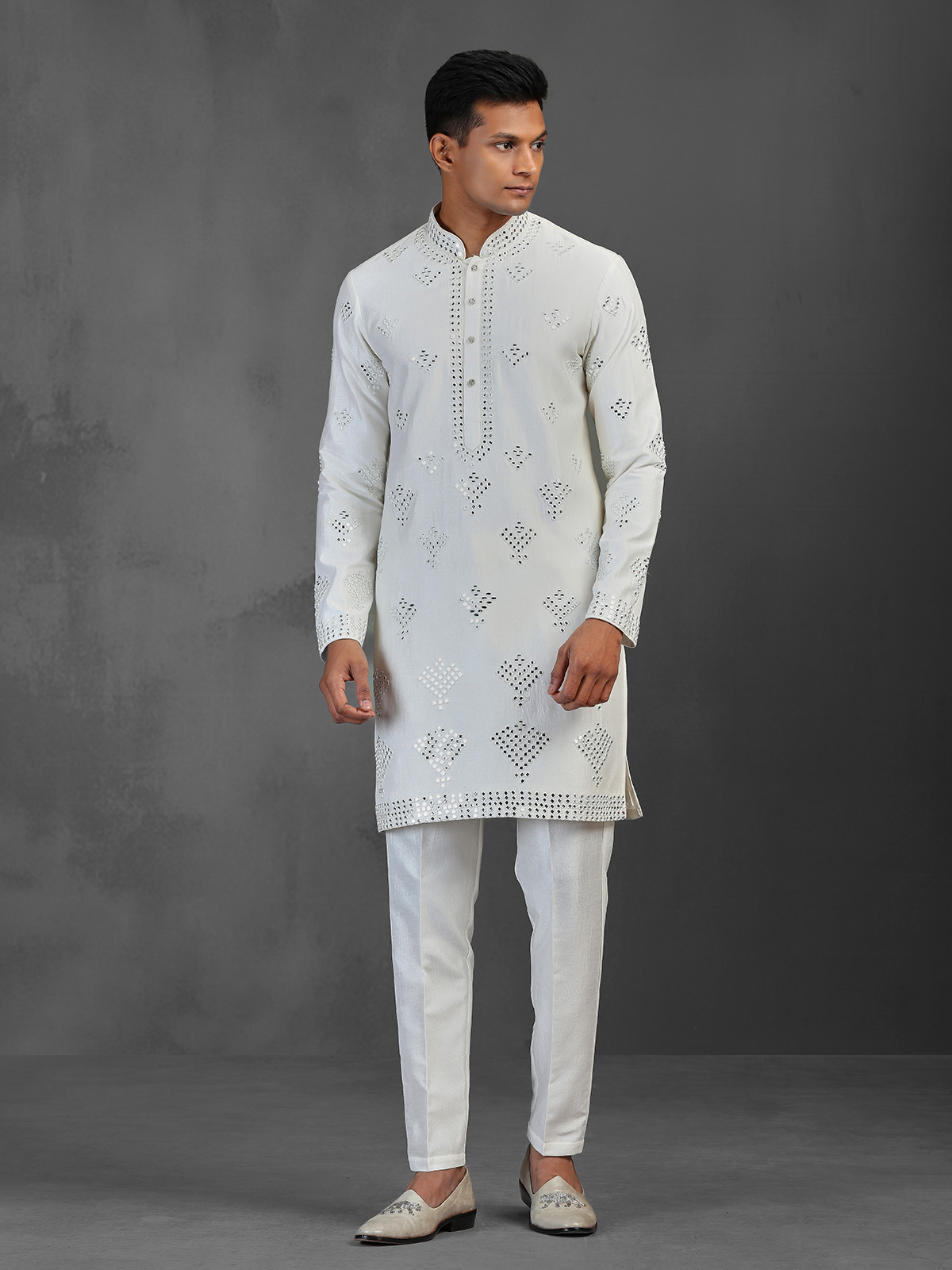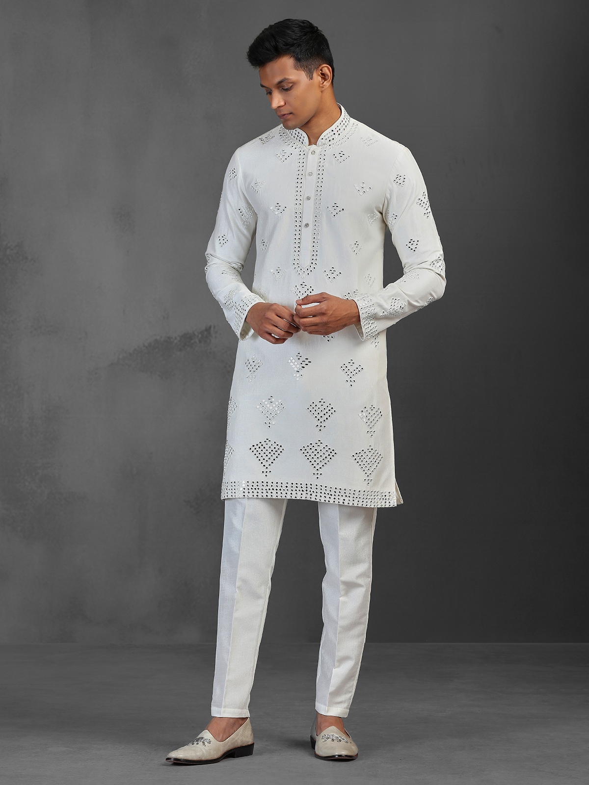 White Silk Kurta Suit For Weddings With Mirror Detailing