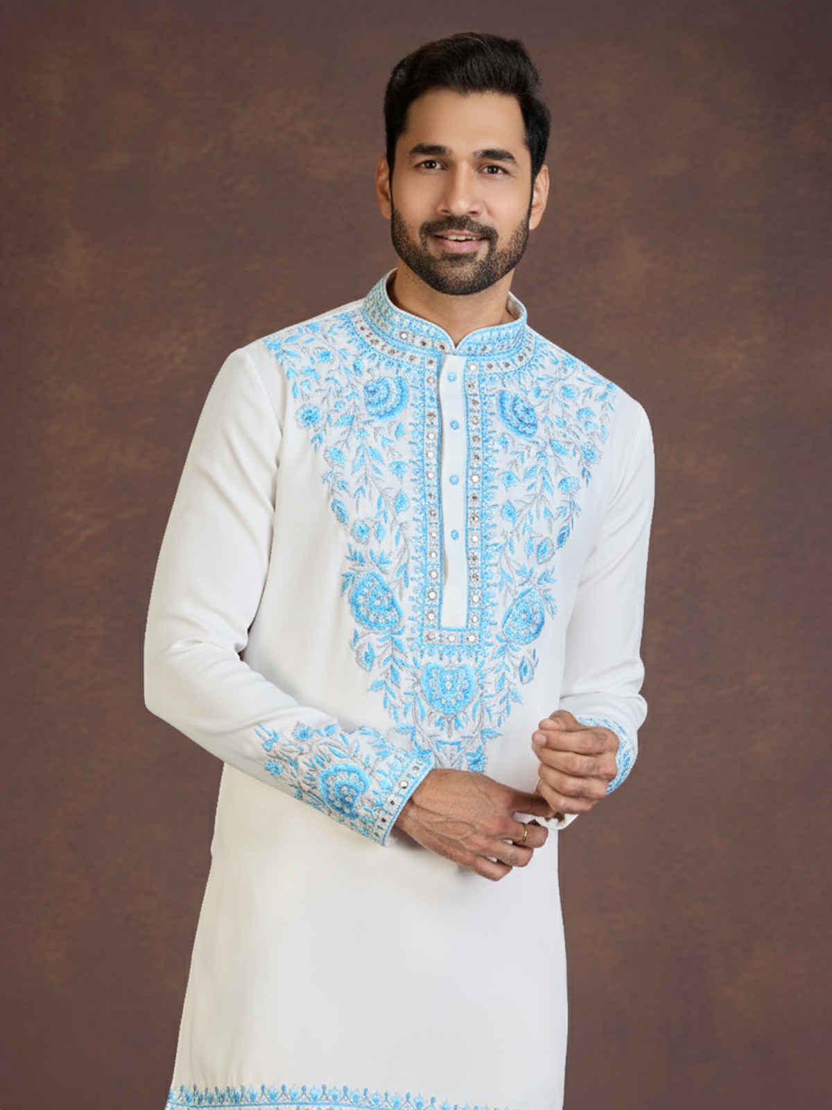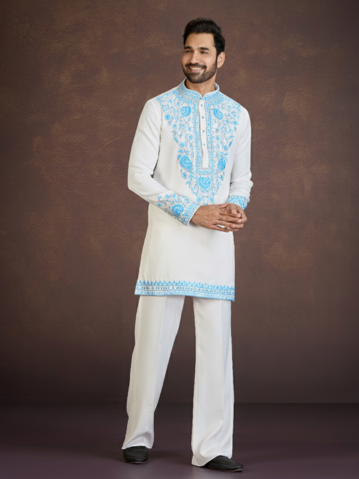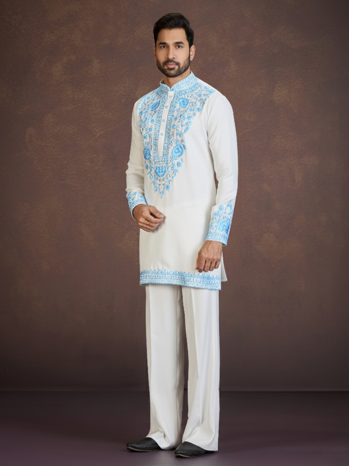 Embrace graceful ethnic style with this off-white kurta suit crafted in luxurious viscose blend fabric that delivers a refined festive look. The kurta is adorned with cutdana, mirror, stone, and sky blue thread embroidery in elegant floral and paisley motifs along the front panel, collar, cuffs, and hem border. Featuring a mandarin collar and full sleeves, it is paired with Korean pants, making it ideal for weddings, festive occasions, and traditional celebrations.