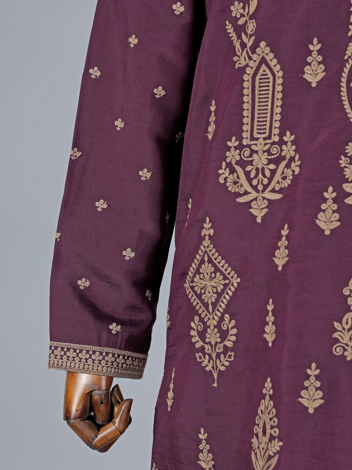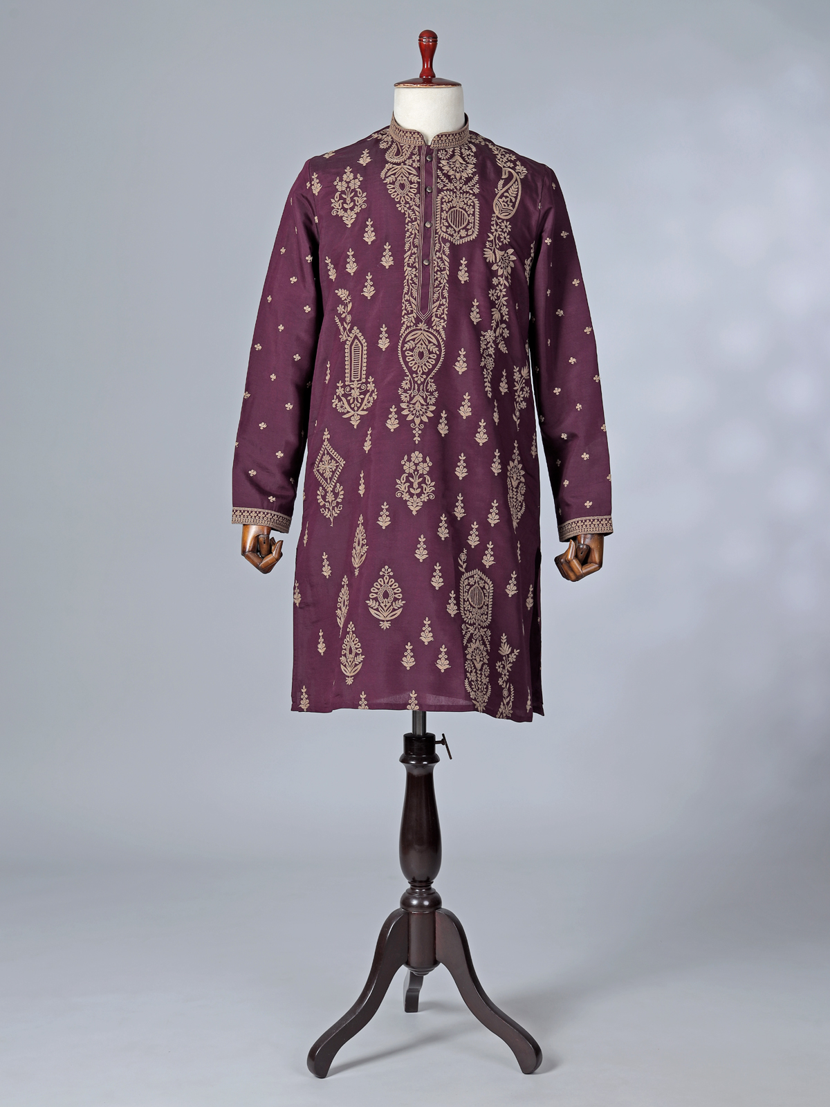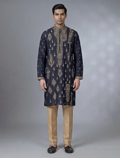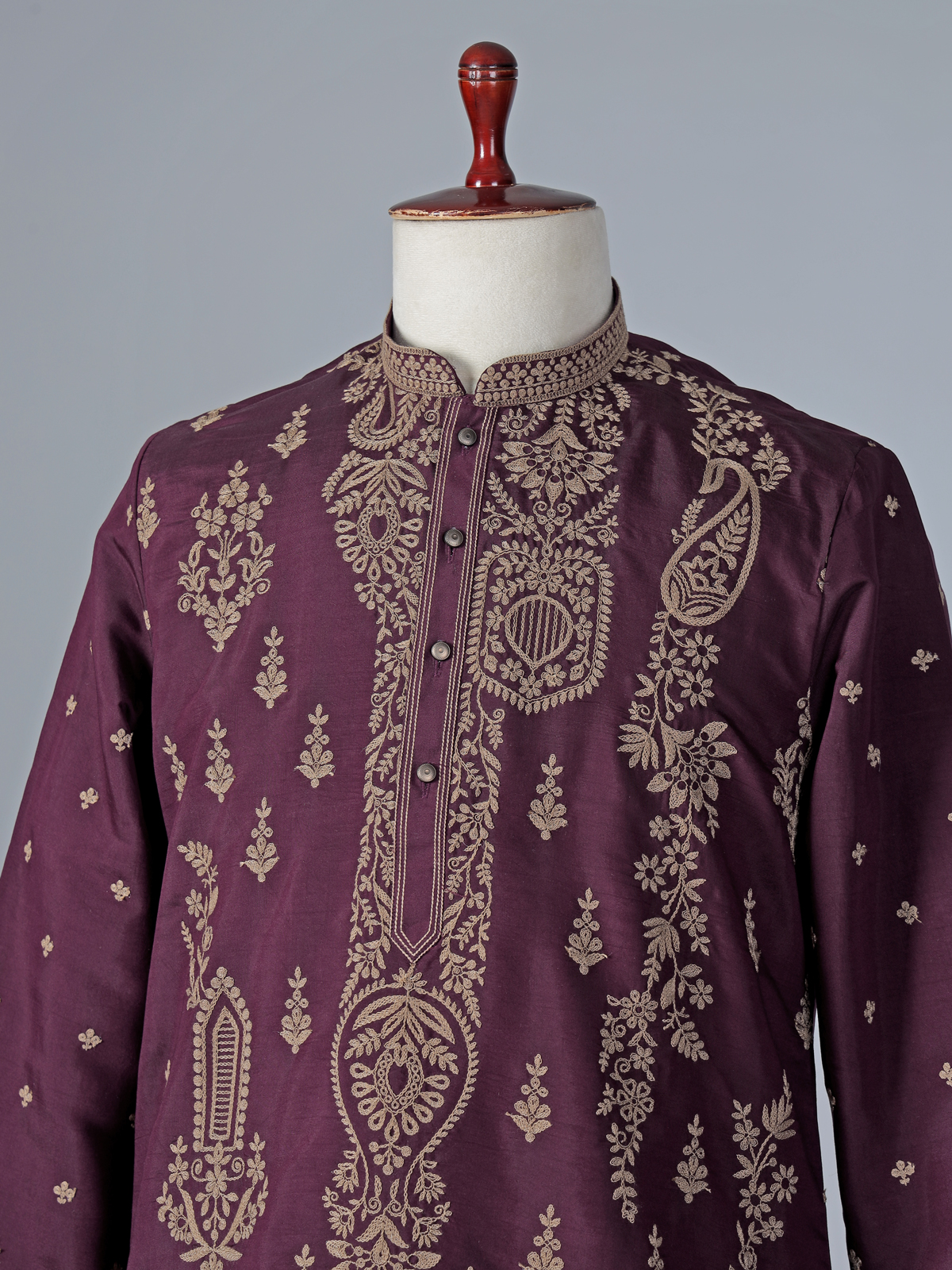 Tailored in royal wine silk, this kurta suit is made with the objective of making a regal statement at special events. Styled with a sharp chinese neckline, full sleeves, and fine thread embroidery, it exudes classic charm. Ideal for festive celebrations, eid functions, and wedding ceremonies, the kurta suit comes with a pant, offering elegance and comfort together.