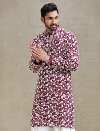 Embrace timeless elegance with our Wine Colored Kurta Salwar Set, crafted from luxurious georgette. Adorned with intricate sequins and delicate embroidery, this ensemble exudes sophistication and charm, making it the perfect choice for any festive occasion. The mandarin collar with front button placket and full sleeves add refined detail to this classic design. Complete with a coordinating salwar, this set promises both grace and style for your special celebrations.