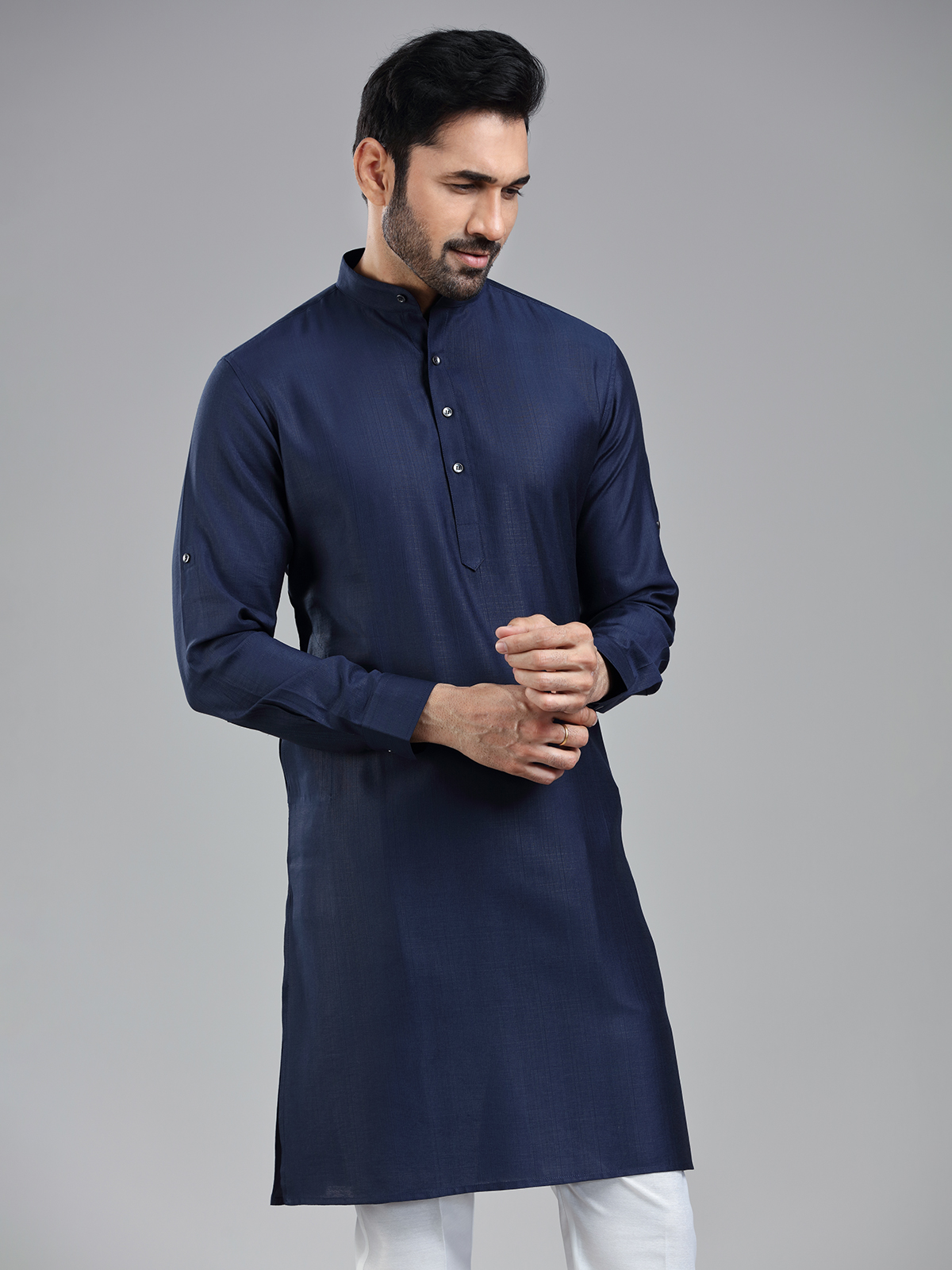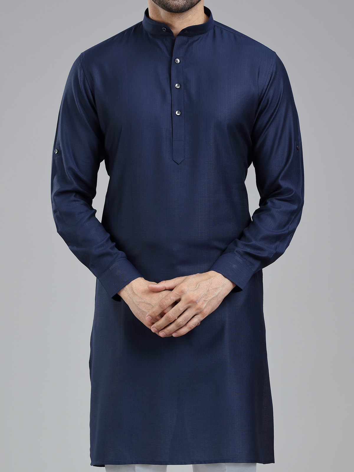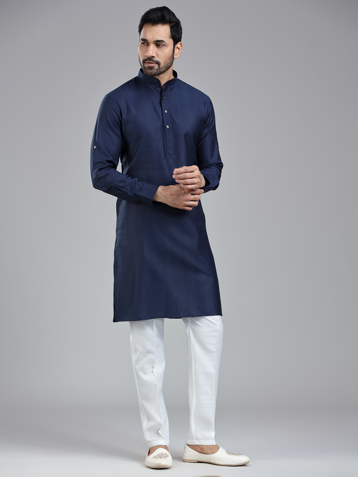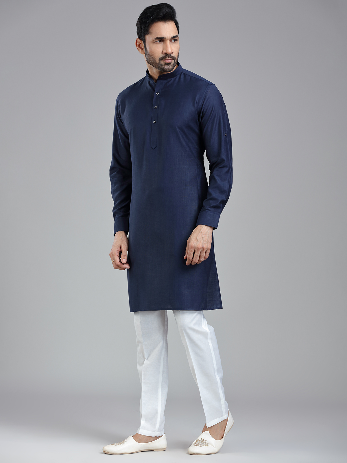 This oxford navy kurta suit, crafted from rayon cotton fabric, features a refined, sober design. The mandarin collar adds an elegant touch, and the white bottom ensures a coordinated appearance, making it perfect for weddings and celebrations.