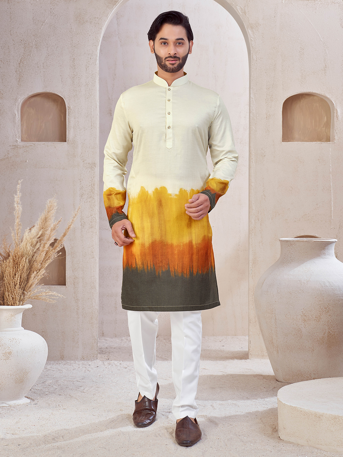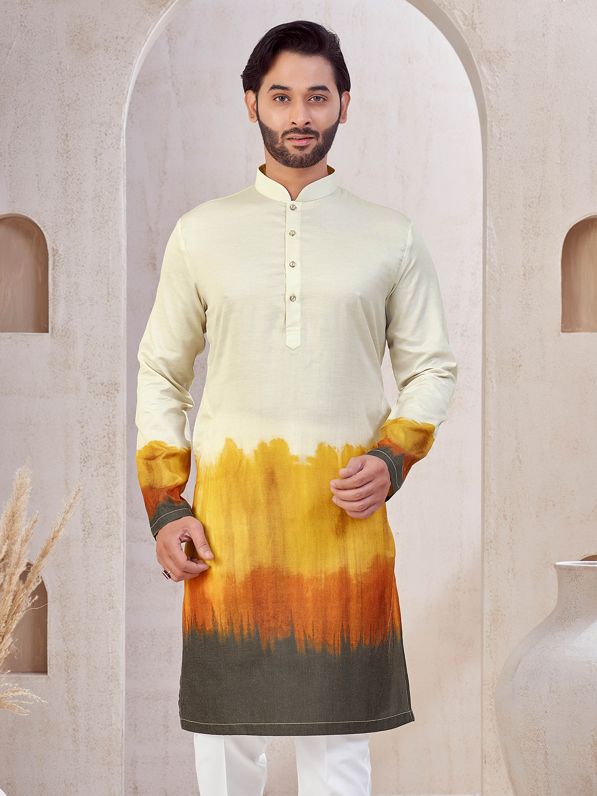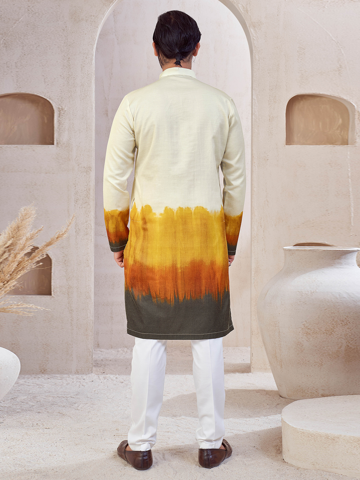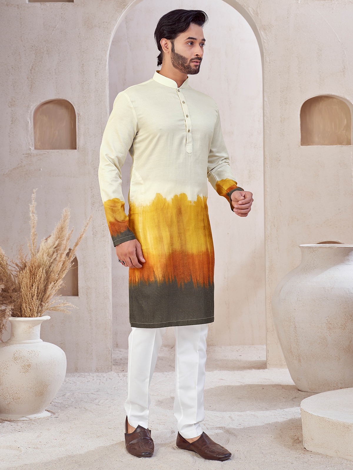 Yellow And Cream Cotton Printed Kurta Suit For Men