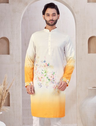 Let soft hues set the tone for your celebration with this cream and yellow shaded kurta set. Crafted from breathable printed cotton, the mandarin collar and full sleeves offer day-long comfort, while the matching bottom adds a polished finish to your festive attire.