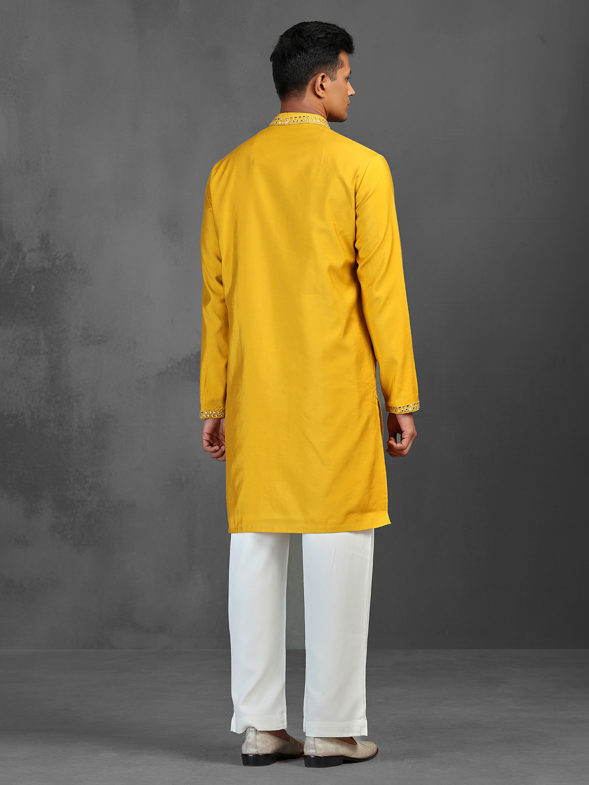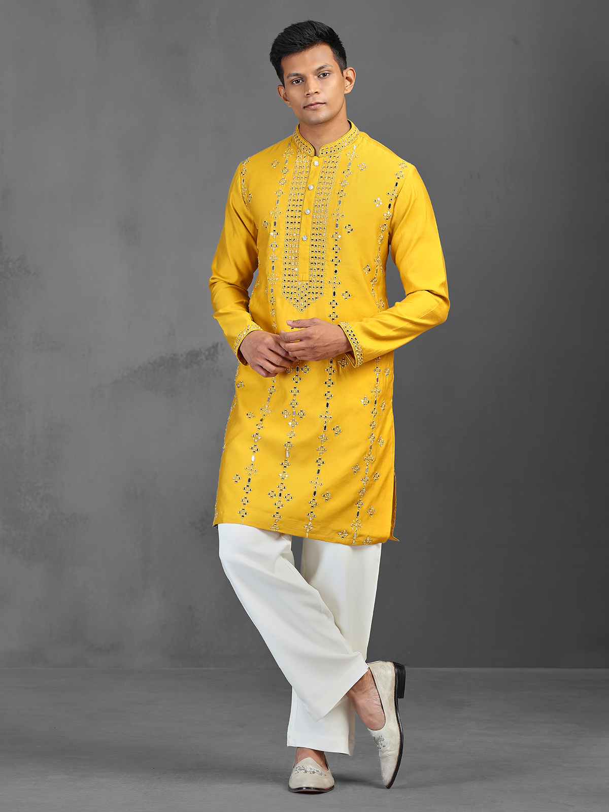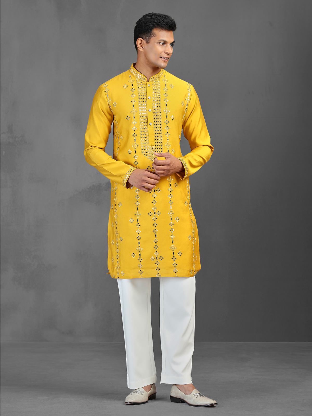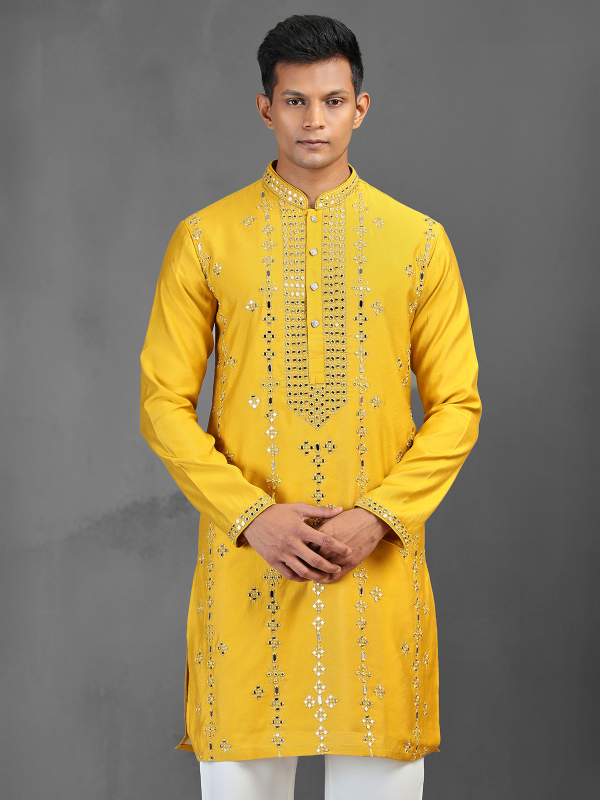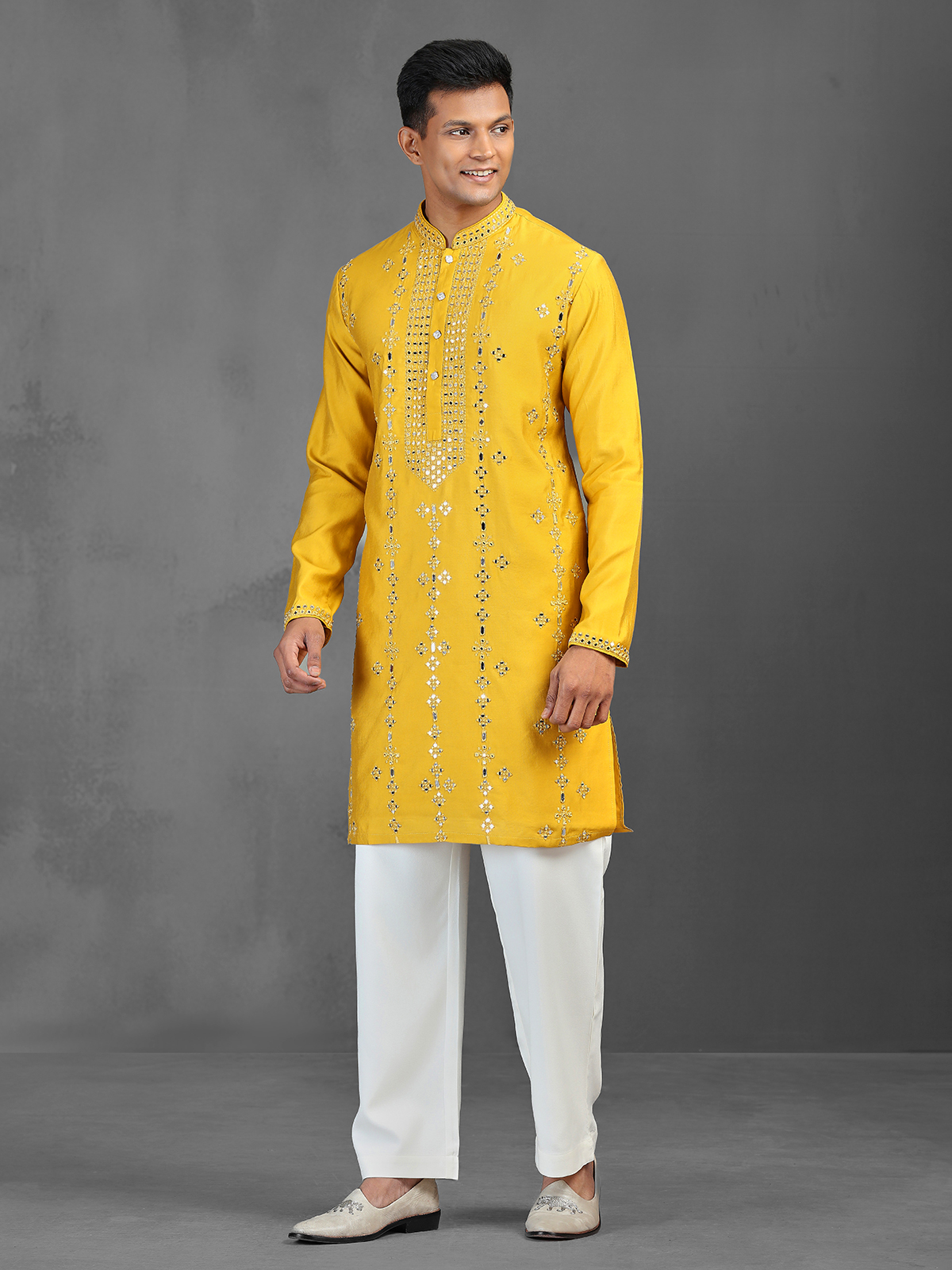 Yellow Art Silk Kurta Suit Adorned With Mirror Work For Men