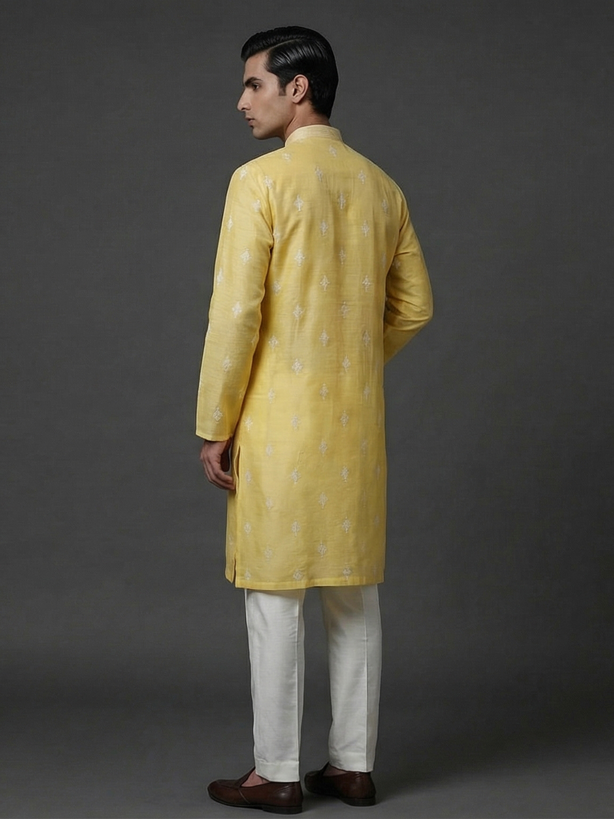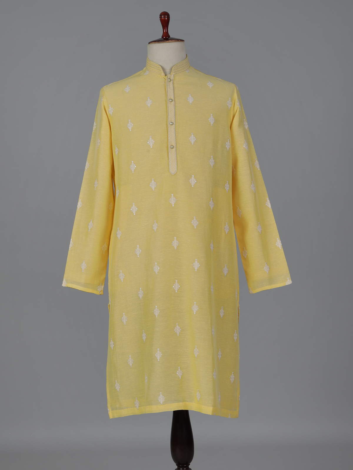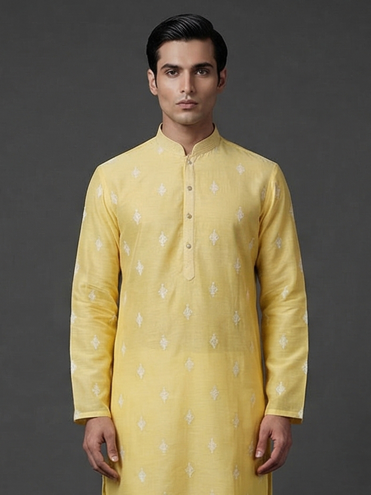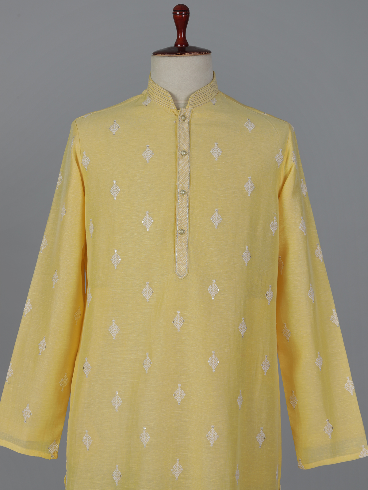Bright yellow tones radiate festive charm in this cotton linen kurta suit crafted for traditional celebrations. The kurta features a stylish mandarin collar that enhances its classic appeal. Decorated with delicate embroidery and sequins that add subtle festive sparkle. Paired with comfortable pants. The ensemble forms a vibrant ethnic silhouette perfect for Eid, weddings, haldi ceremonies and festive occasions.
