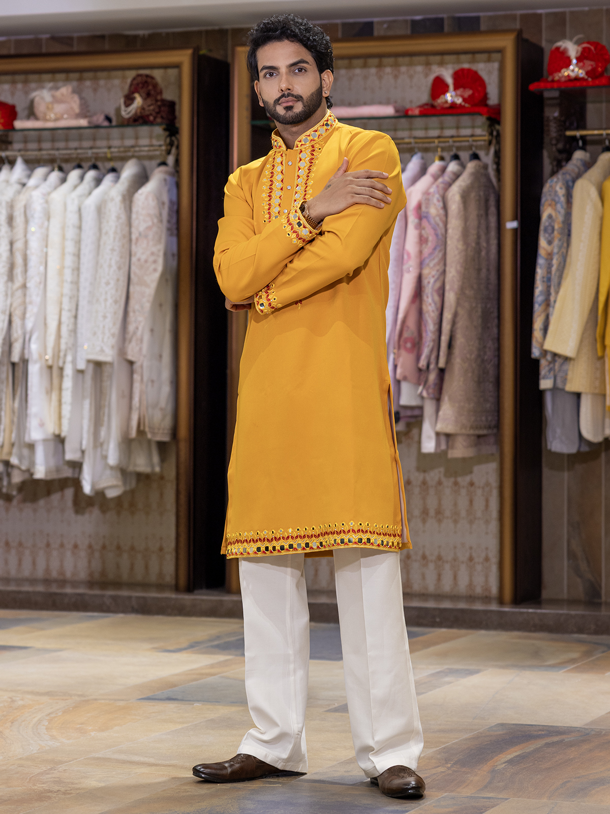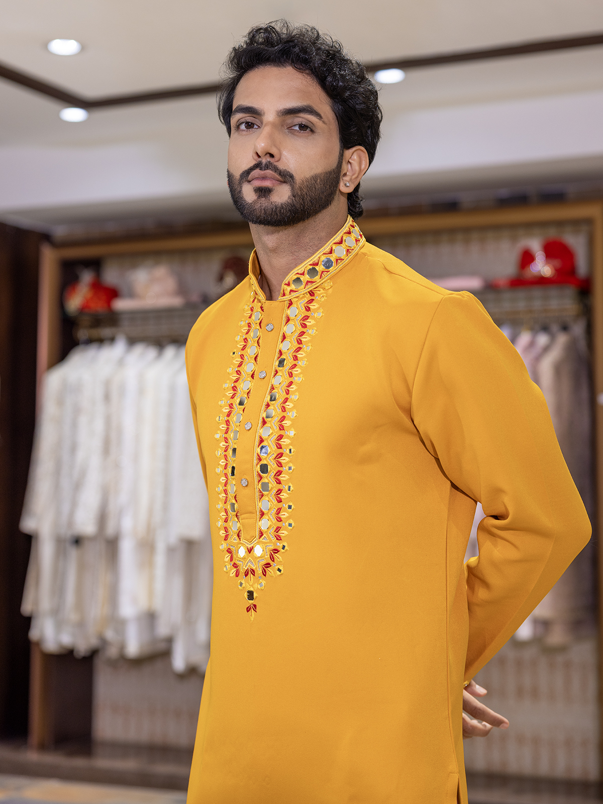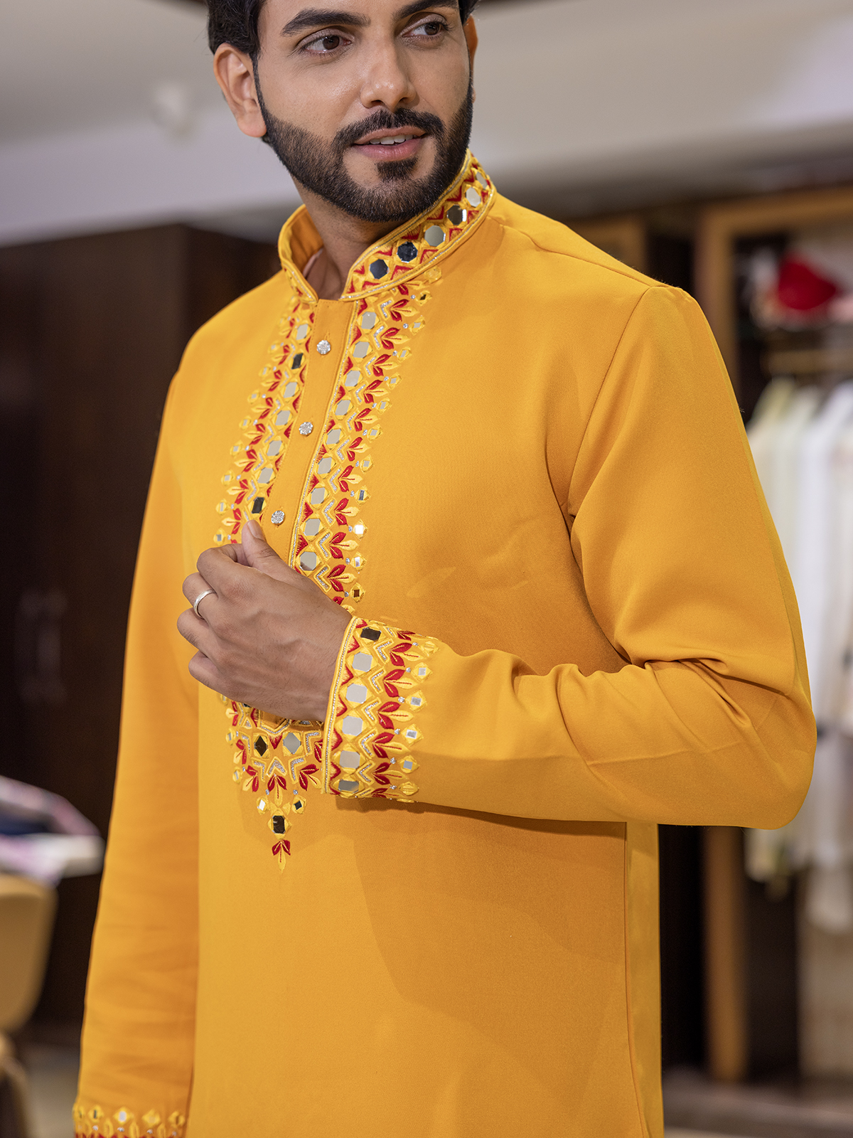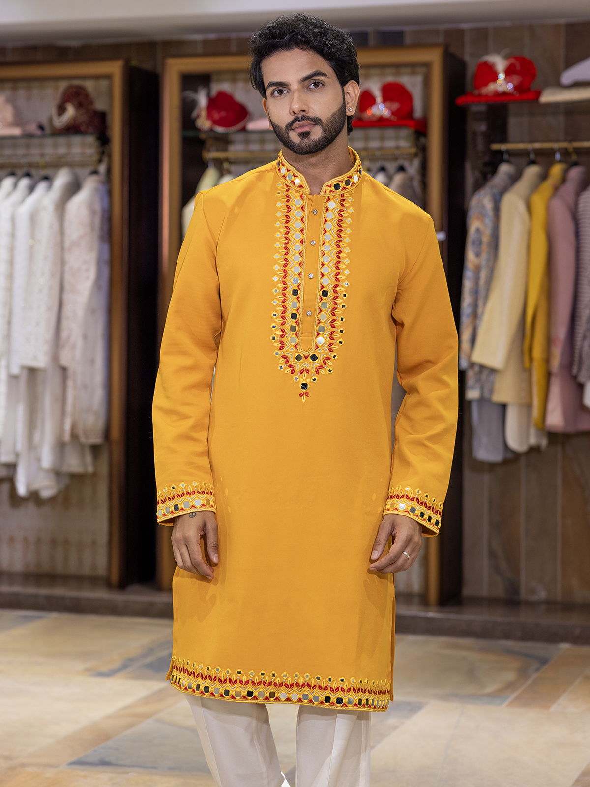 Bathed in the warmth of yellow cotton silk, this kurta suit radiates sunshine-like brilliance. Intricate mirror and embroidery detailing lends a festive glimmer, while the mandarin collar and full sleeves enhance its classic appeal. Completed with complementing pants, it is a joyous pick for celebratory moments.