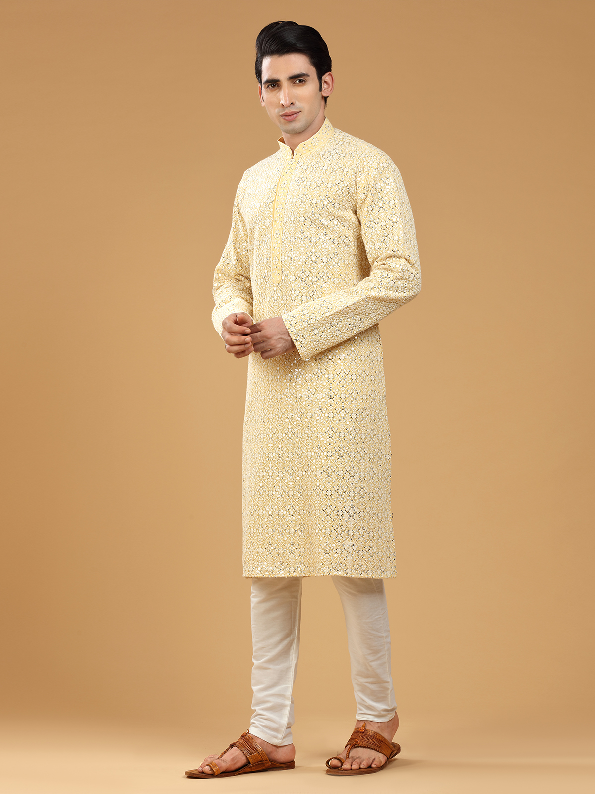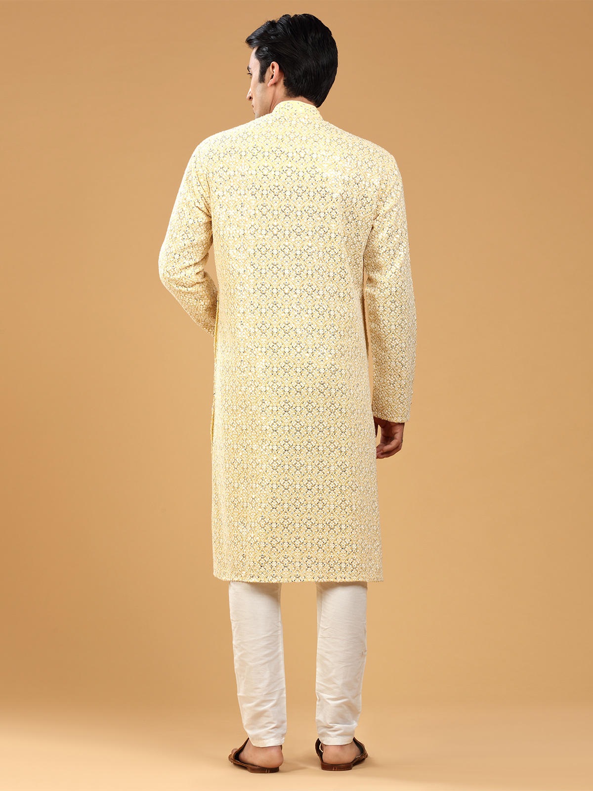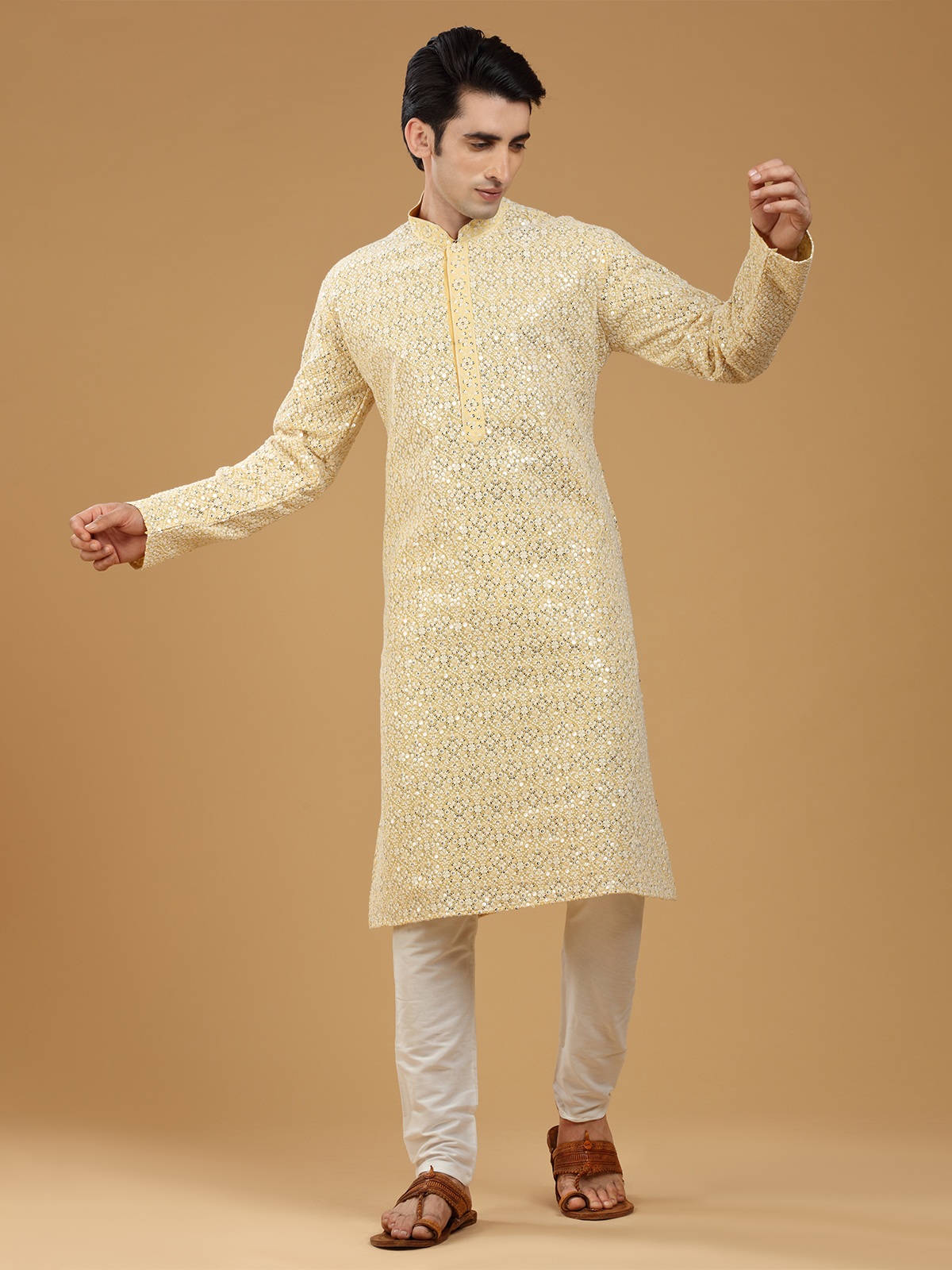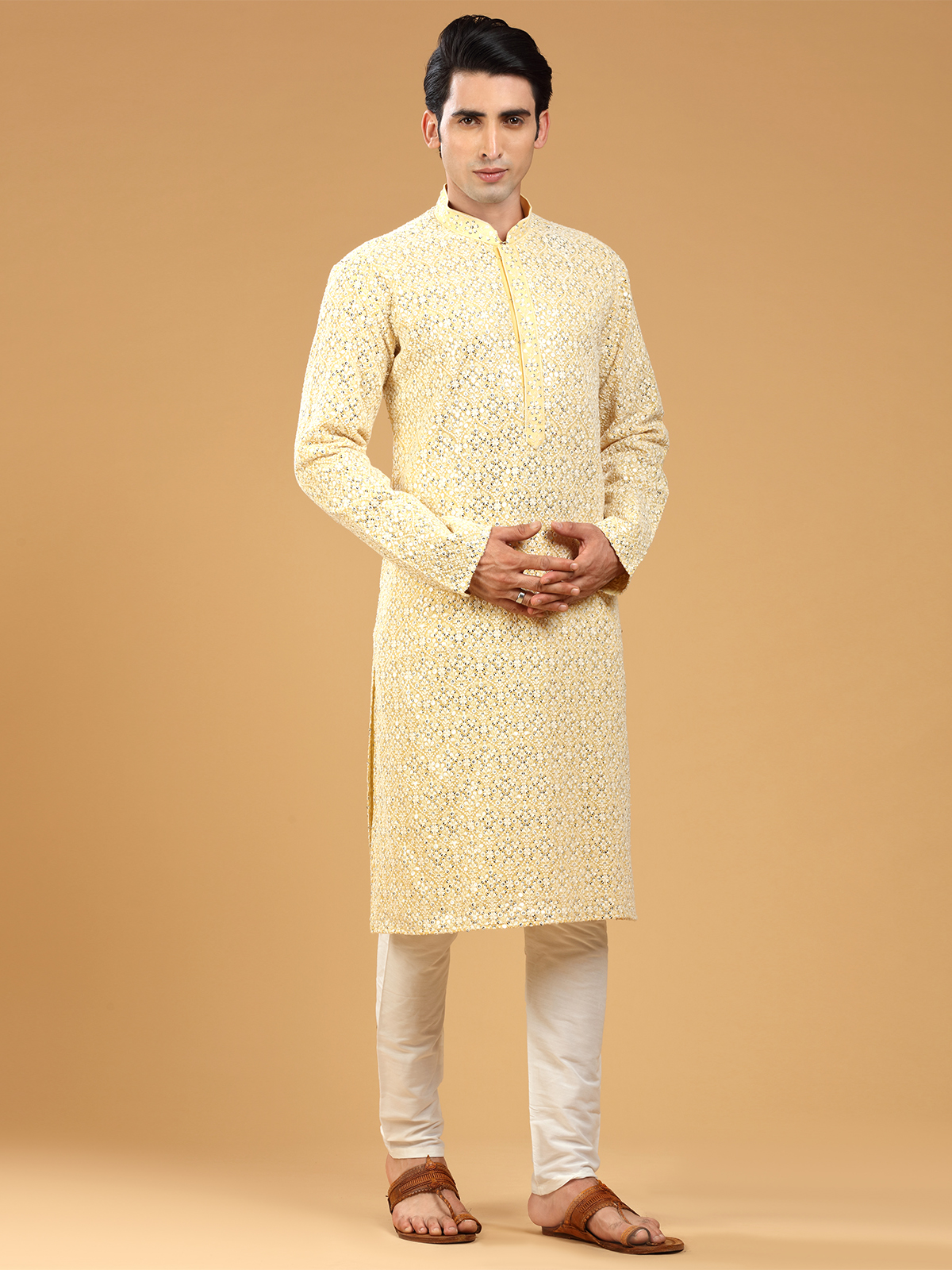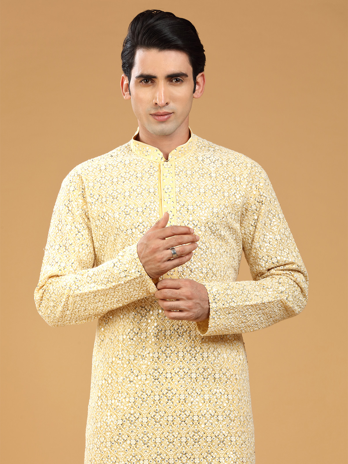 Add a touch of elegance to your festive wardrobe with this intricately designed georgette kurta suit in yellow. The outfit is enhanced with exquisite embroidery, resham and sequins work, featuring a mandarin collar and full sleeves. Comes with a bottom.