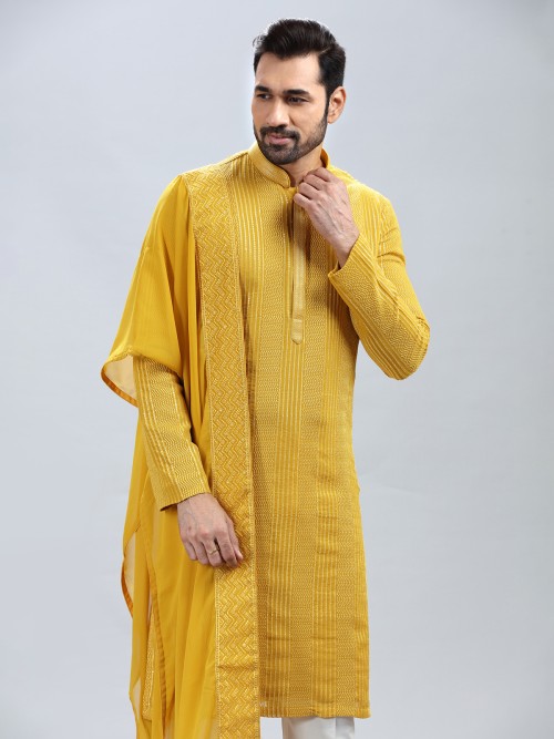 Yellow Embroidery Kurta Suit With Dupatta For Men