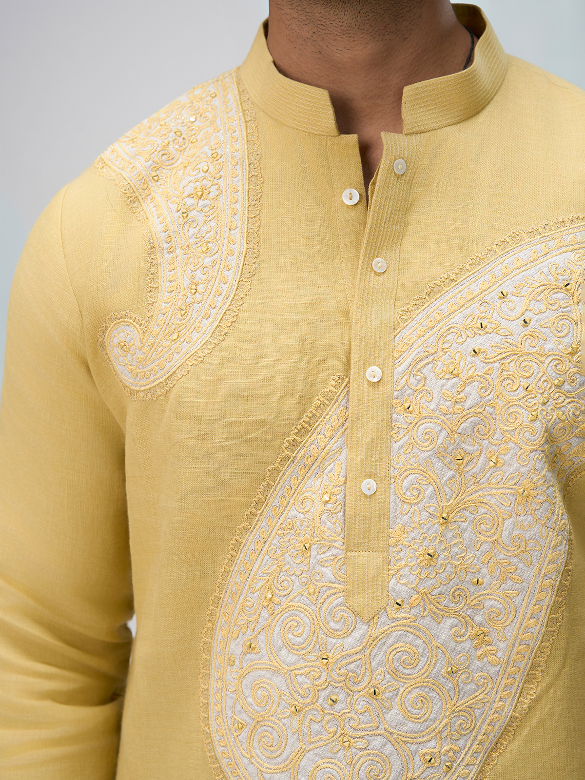In vivid yellow linen, this kurta carries aabla, resham, thread and embroidery accents that create a lively festive spirit for haldi, sangeet and celebrations. The chinese collar keeps the form crisp, while the pant ensures a smooth, stylish finish.