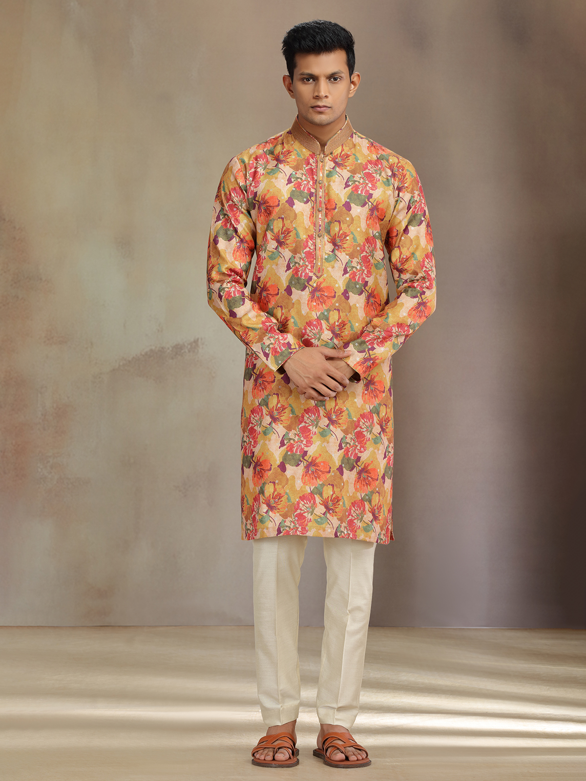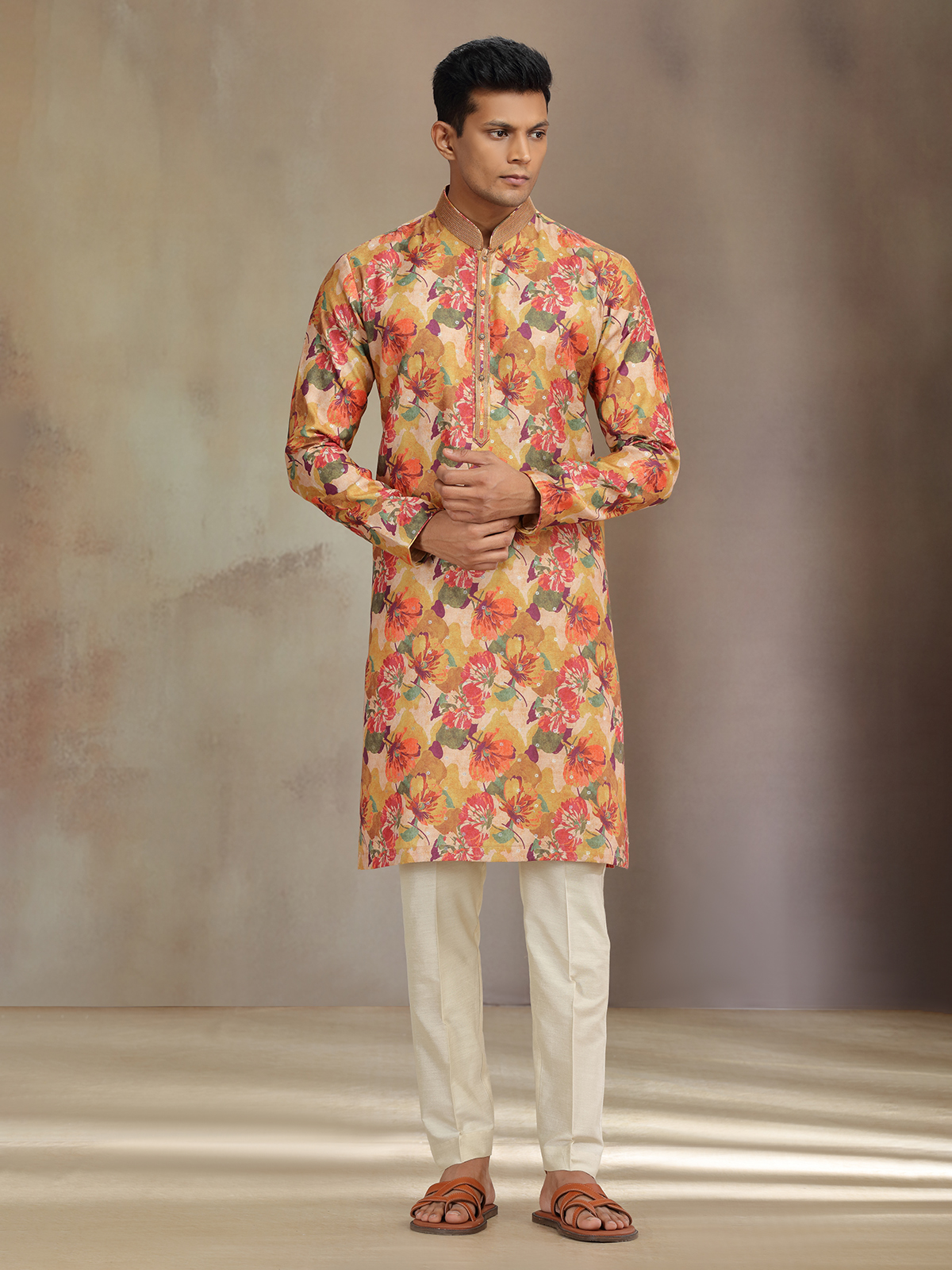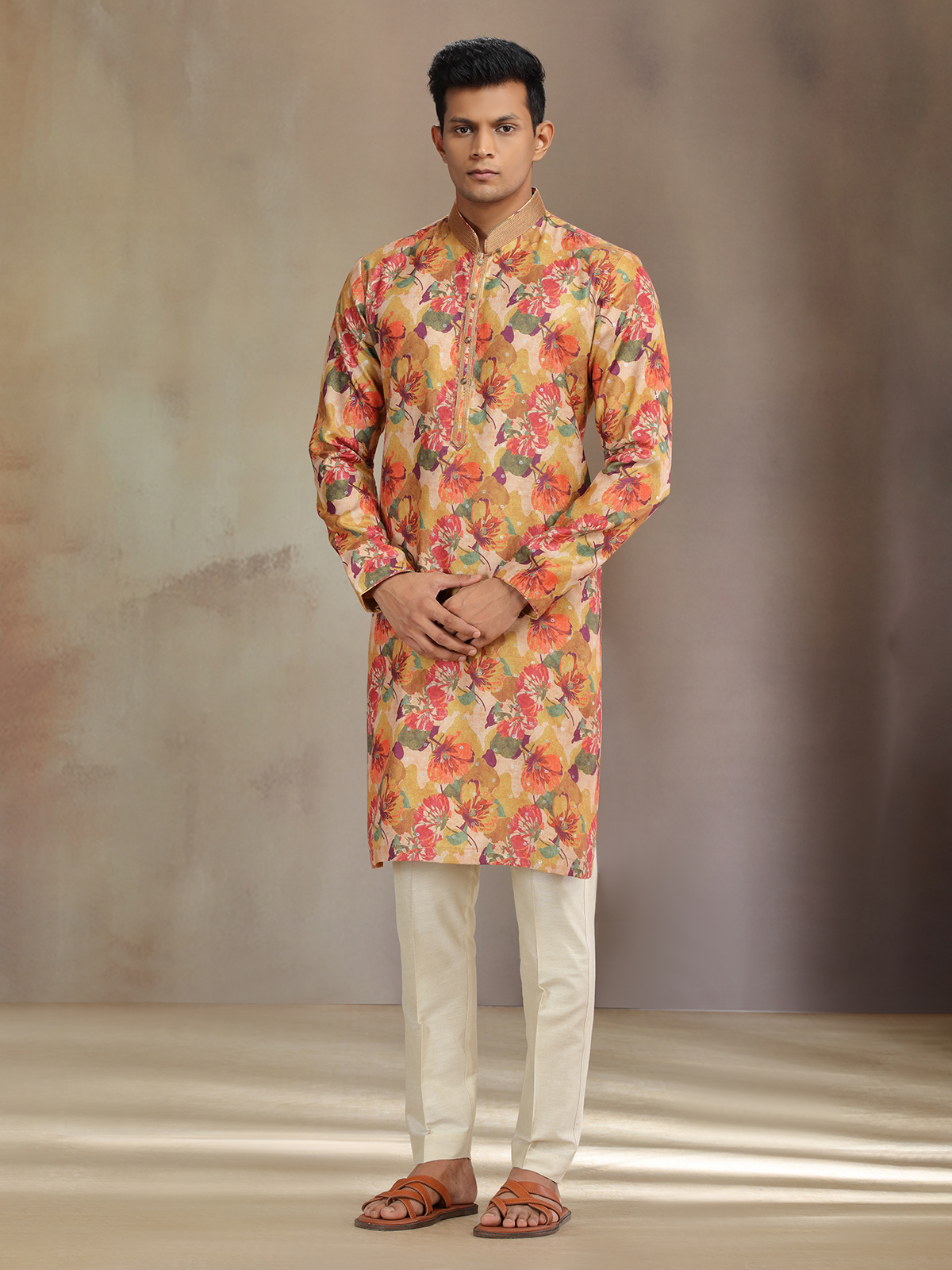 Cheerful yellow jaquard silk kurta suit with printed motifs glows softly. Its mandarin collar and full sleeves maintain timeless balance, paired with pant for a radiant festive appearance.