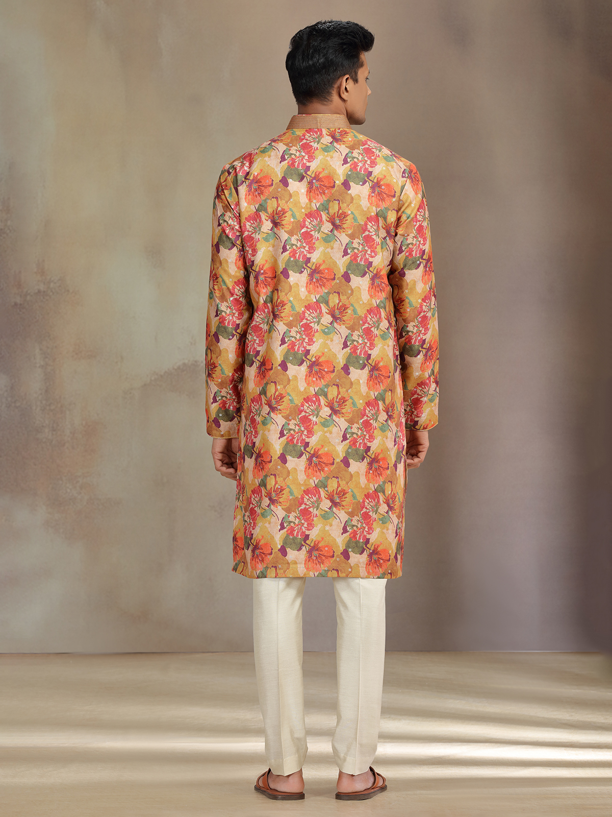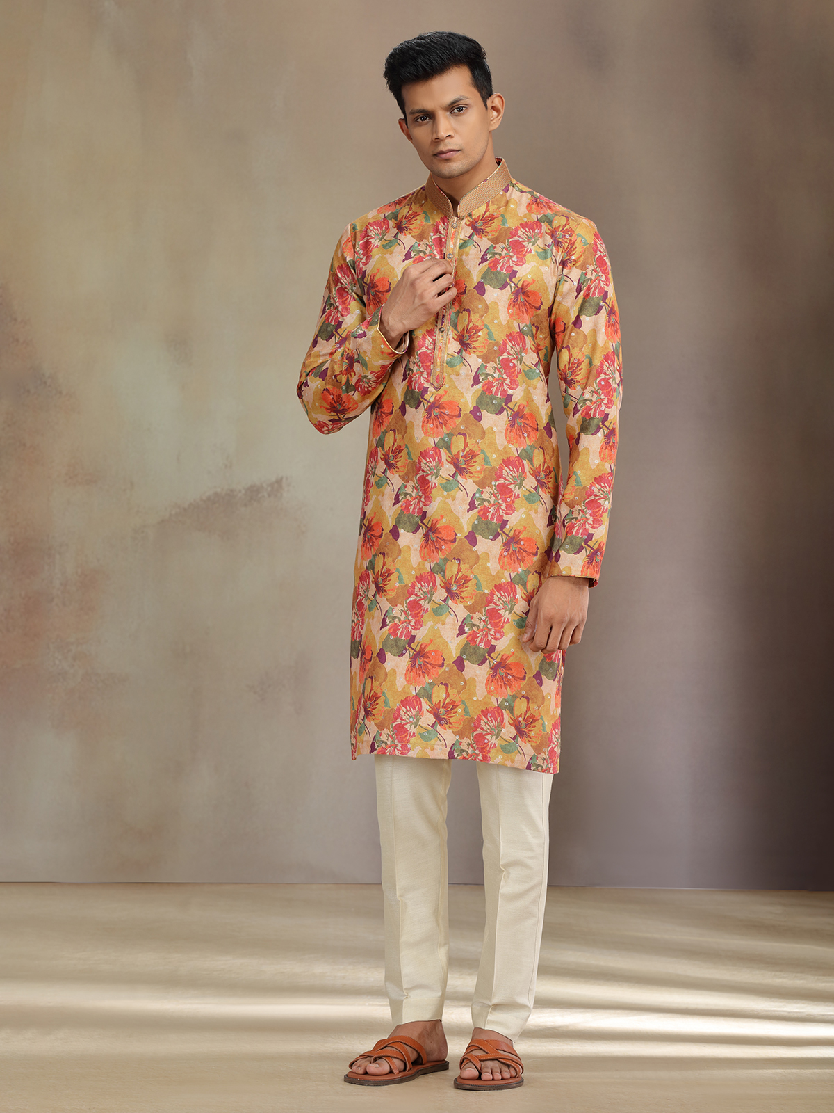Yellow Printed Jaquard Silk Kurta Pajama For Men Festive Wear