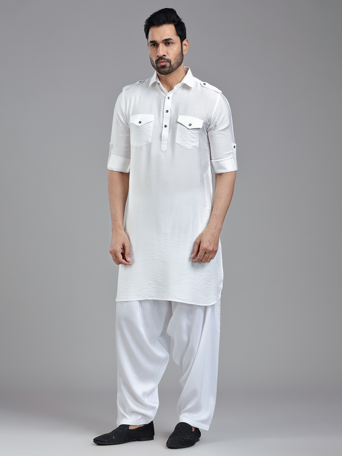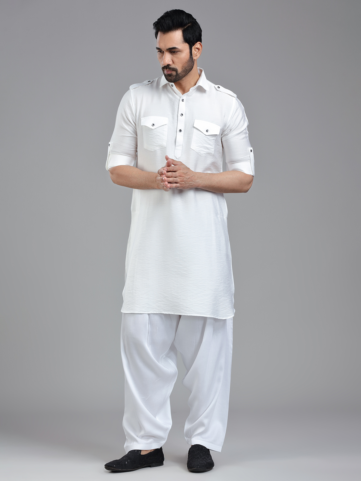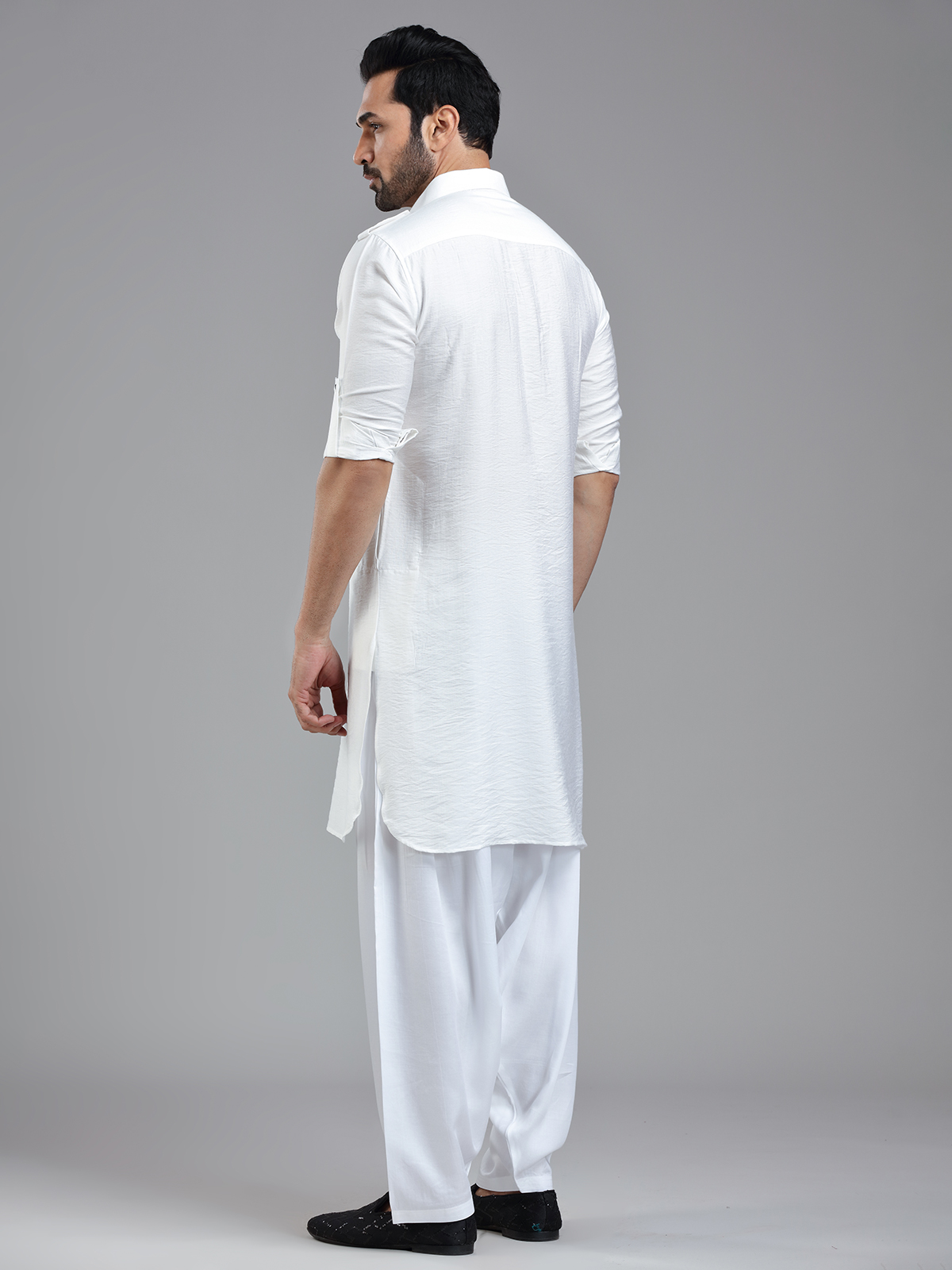 Refine your Eid wardrobe with our classic white Pathani suit, meticulously crafted from premium rayon cotton fabric to provide both comfort and style. With its distinguished cutaway collar, sleek three-button placket, and functional chest patch pockets, this suit perfectly blends modern flair with traditional grace. The versatile full sleeves can be rolled up or worn down, offering you a polished look that’s ideal for any festive occasion.
