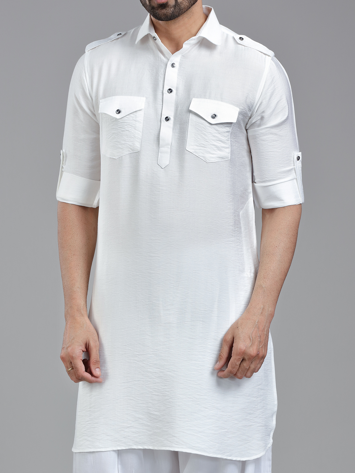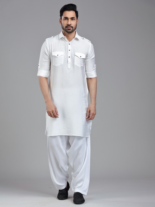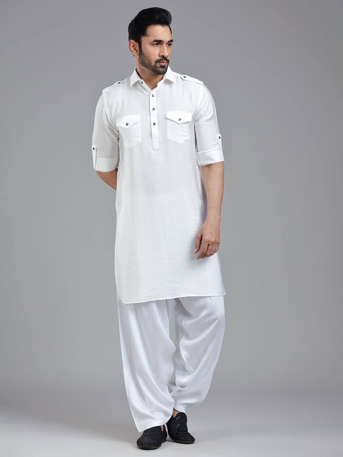 Refine your Eid wardrobe with our classic white Pathani suit, meticulously crafted from premium rayon cotton fabric to provide both comfort and style. With its distinguished cutaway collar, sleek three-button placket, and functional chest patch pockets, this suit perfectly blends modern flair with traditional grace. The versatile full sleeves can be rolled up or worn down, offering you a polished look that’s ideal for any festive occasion.