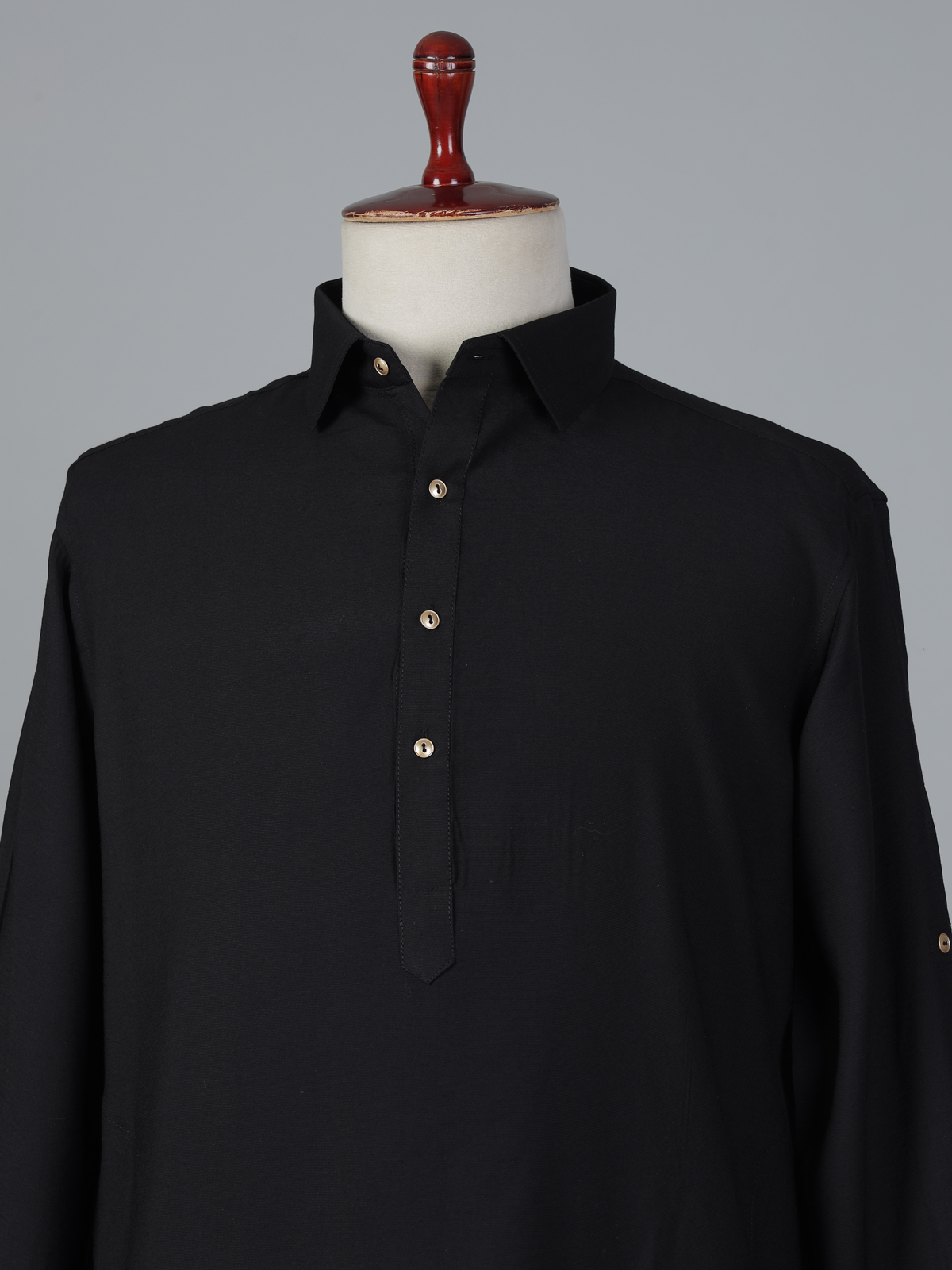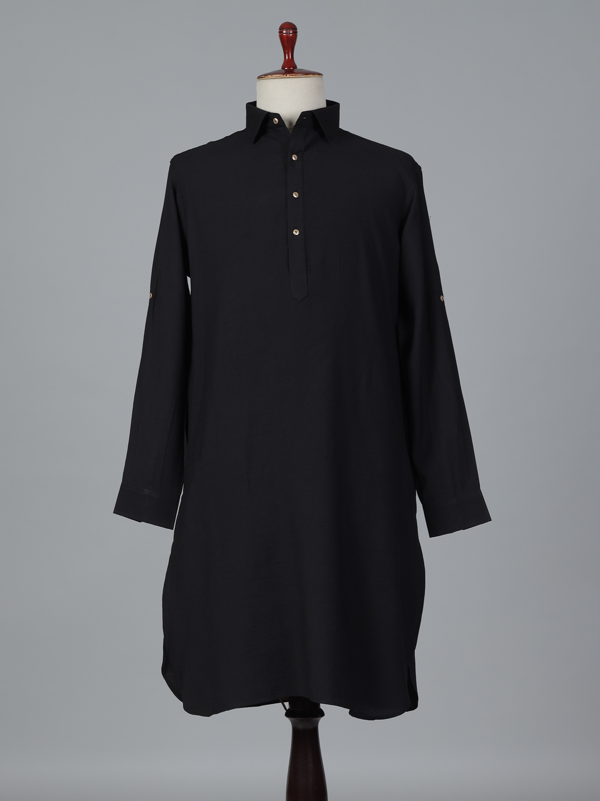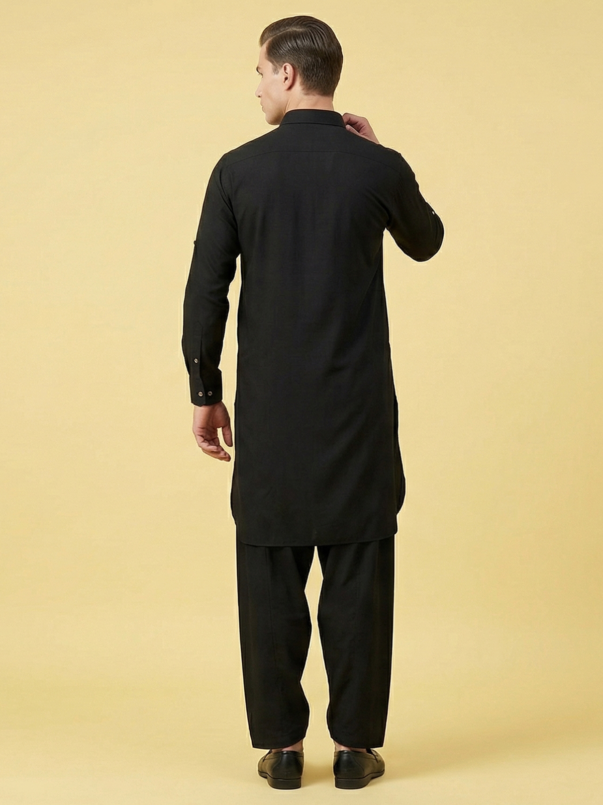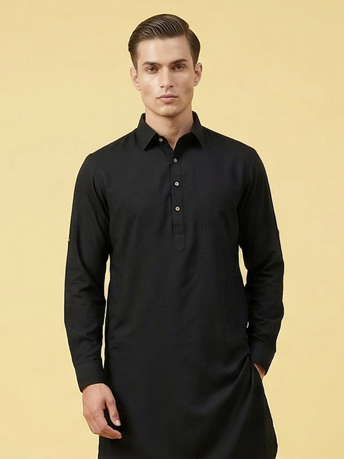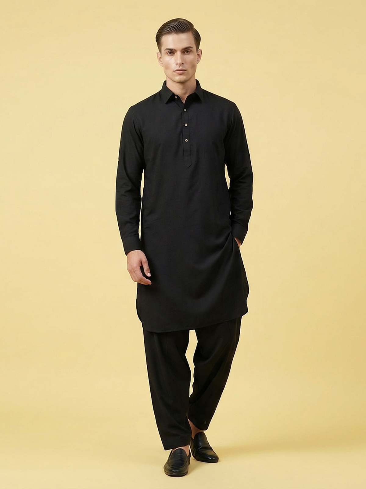 Classic black tones bring timeless sophistication to this cotton silk pathani suit, crafted for festive elegance. The kurta features a structured collar neckline with full sleeves, offering a sharp yet comfortable traditional look. Paired with a relaxed salwar bottom, this ensemble creates an authentic ethnic silhouette ideal for Eid celebrations and special gatherings.