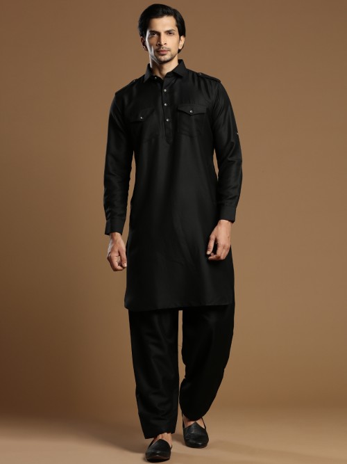 Reflect your signature style with this plain black cotton silk festive wear pathani suit. It comes with collar neck, full sleeves with cuffs, half buttoned placket, curve vented hemline, two patch pocket with flap. Comes with cotton salwar.