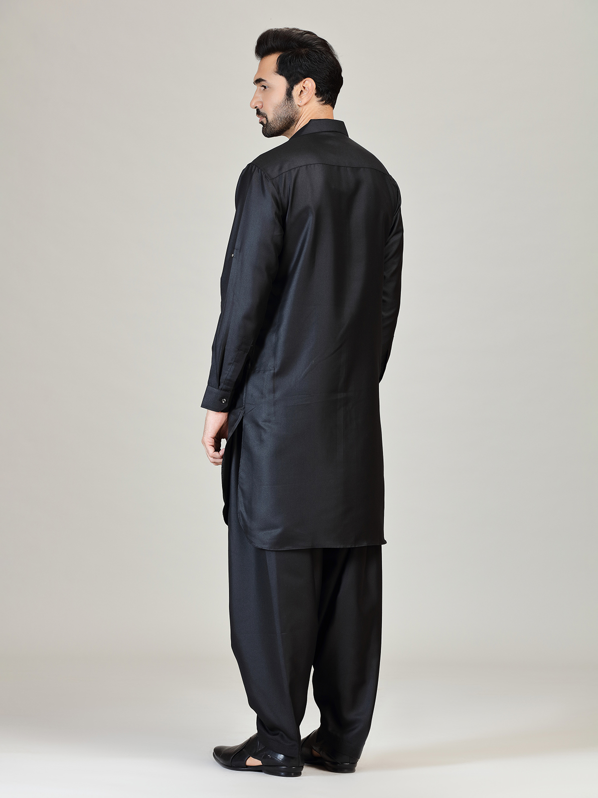 Elevate your traditional style with this black cotton silk Pathani kurta suit crafted for sharp, confident elegance. Tailored with a refined cutaway collar and full sleeves, the plain design offers a sleek and dignified finish. Perfect for festival celebrations and Eid gatherings, it is teamed with a classic salwar for timeless ethnic appeal.